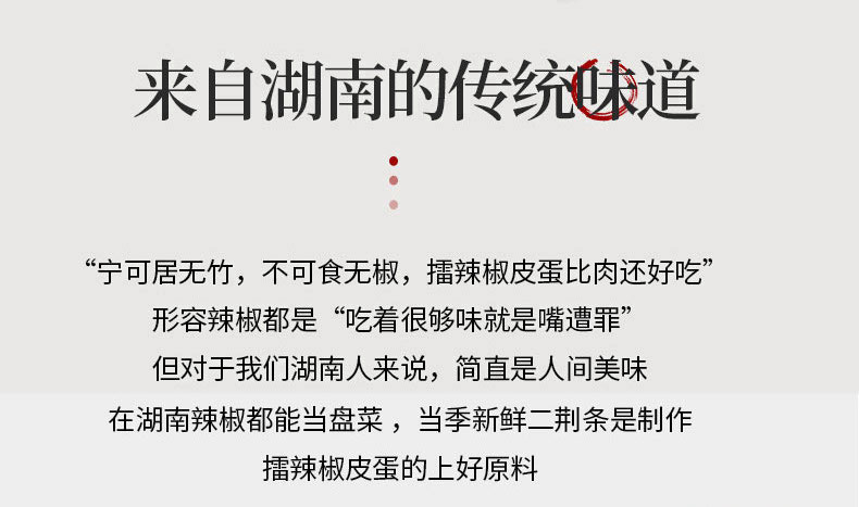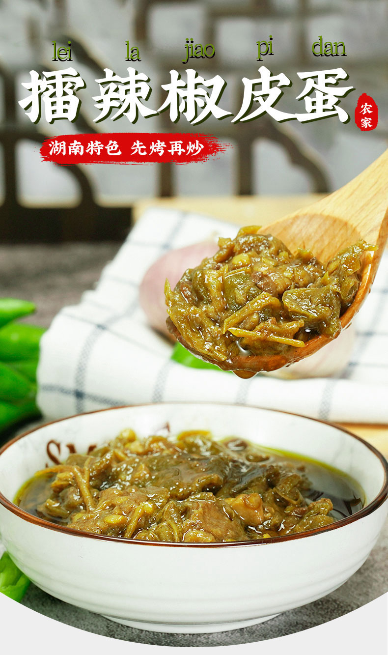 擂椒皮蛋作为一道非遗美食,在湖南是出了名的家常菜。食材和做法也不难,但相信大家也都知道,越简单的食材,要做出一口惊艳的味道并不容易。这罐擂椒皮蛋的原料选用的是“中国蔬菜之乡”寿光的新鲜螺丝椒,相比普通的青椒,螺丝椒就像一阵山野清风,辣而不燥,椒香悠长!皮蛋选用松花蛋发源地之一的湖南,蛋清Q弹,蛋黄软糯,内有溏心,同时兼得绵密和清爽双重口感。至于工艺,更是优秀传承了传统做法,将螺丝椒使用炉火炭烤,螺丝椒在高温作用下受热褶皱,形成一层焦黑层。烧制过的辣椒,会激发更多的香气。不只是来自炭火的烟熏味,还有辣椒自身果肉的甜香。擂椒皮蛋,顾名思义,在于“擂”。将烤制好的椒肉和松花皮蛋放进钵里,再加入精心配比过的新鲜葱末、蒜末等调料,在一锤一打间,用擂棍将皮蛋擂成粒粒分明的酱,让皮蛋的鲜味均匀的包裹在每一寸辣椒上。