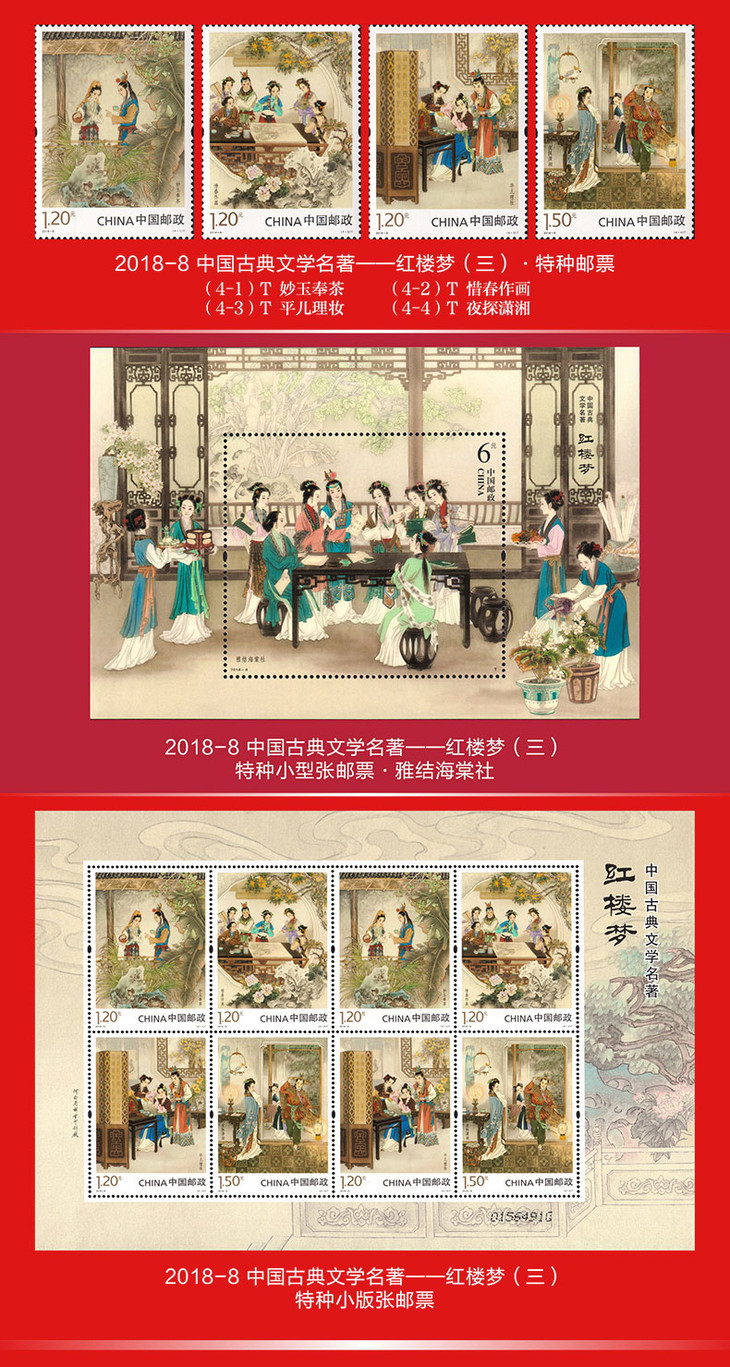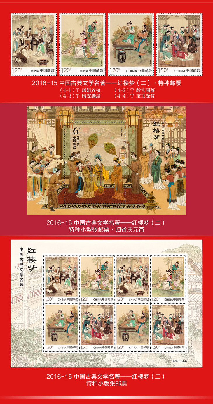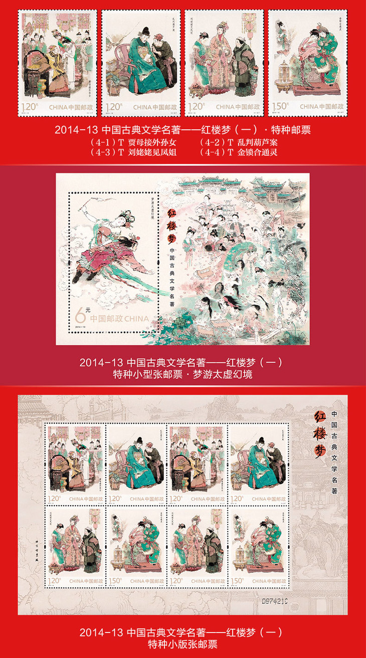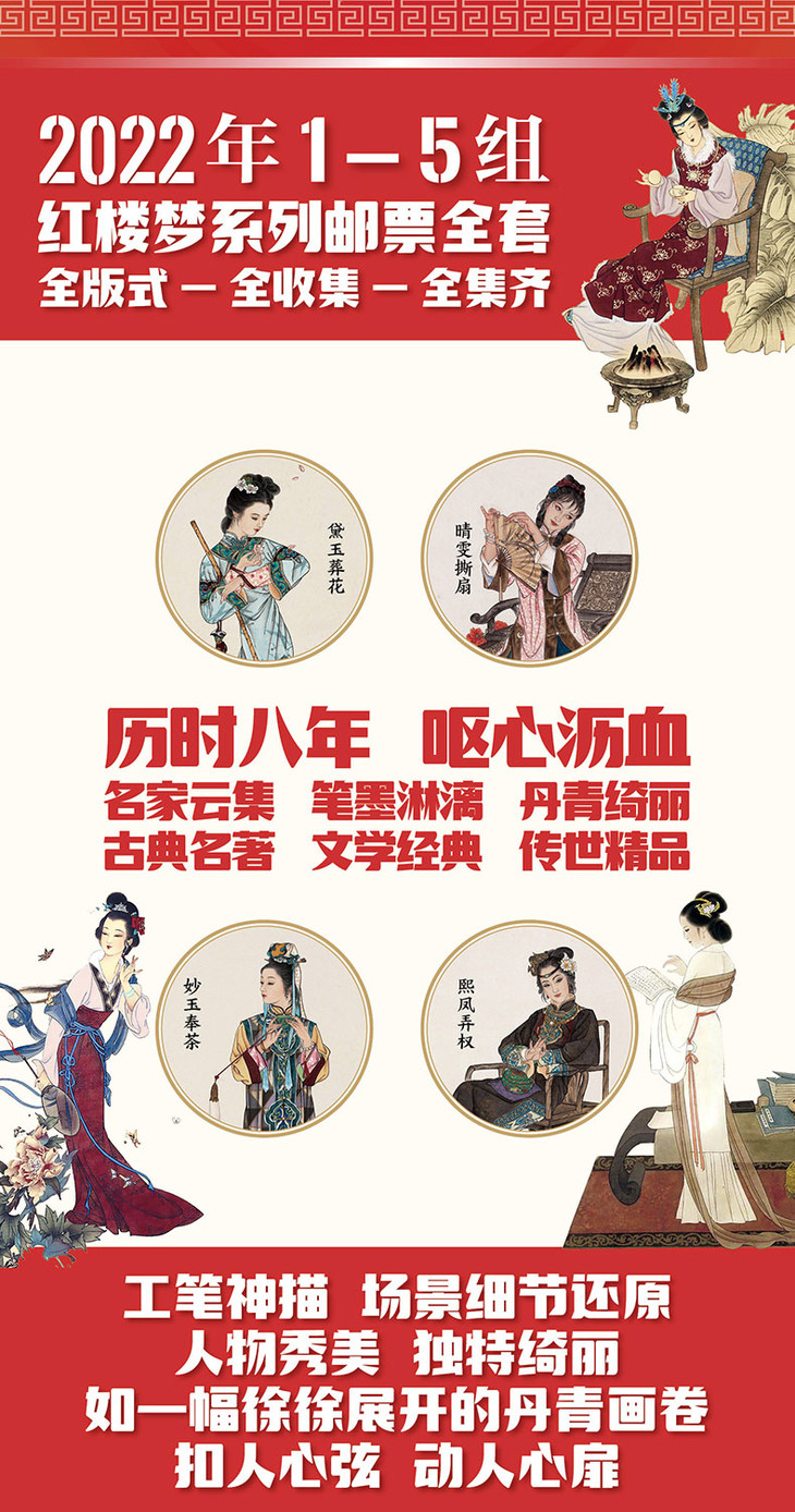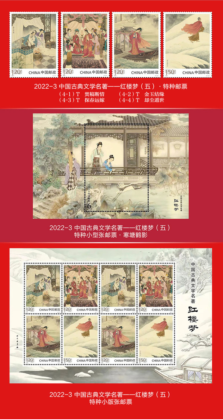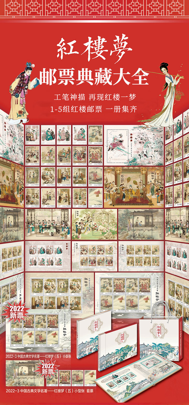 《红楼梦》 邮票典藏大全 系列邮票1-5全收录 65枚邮票 含套票、小型张、小版张3种类型