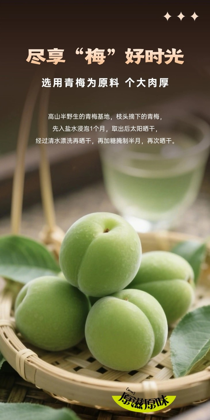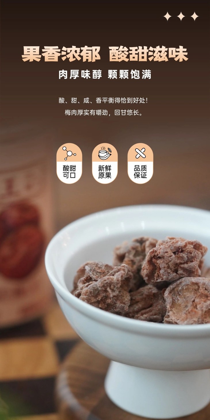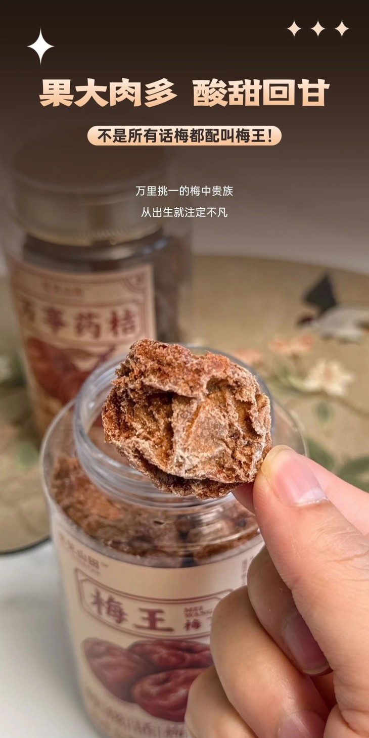 梅王话梅每罐250g,粒粒大梅子清晰分明。入口的瞬间,鲜活的天然果酸率先激活味蕾,生津如泉涌;紧接着,阳光晒制的醇厚甘甜裹挟着蜜韵花香,在口腔层层绽放;最后喉间回甘绵长,如山泉淌过,通体舒泰!酸得明亮,甜得含蓄,咸得点睛,香得深邃,层次丰富到让人回味!而且,泡茶炖汤煮饭都可以加一粒,很增风味,尤其是平时会偶尔小恶心,或是晕车的老粉,必备!