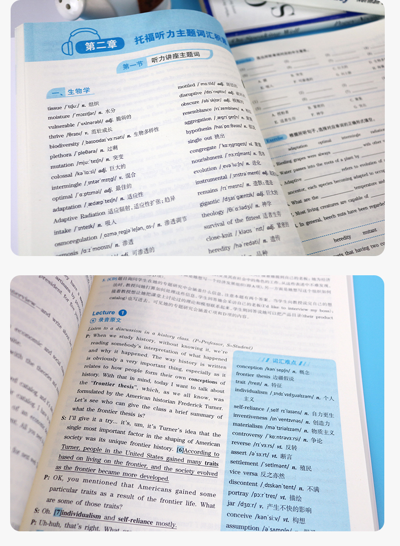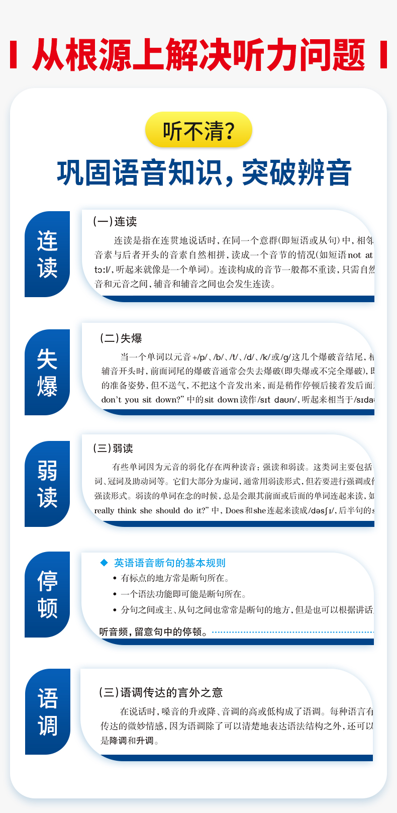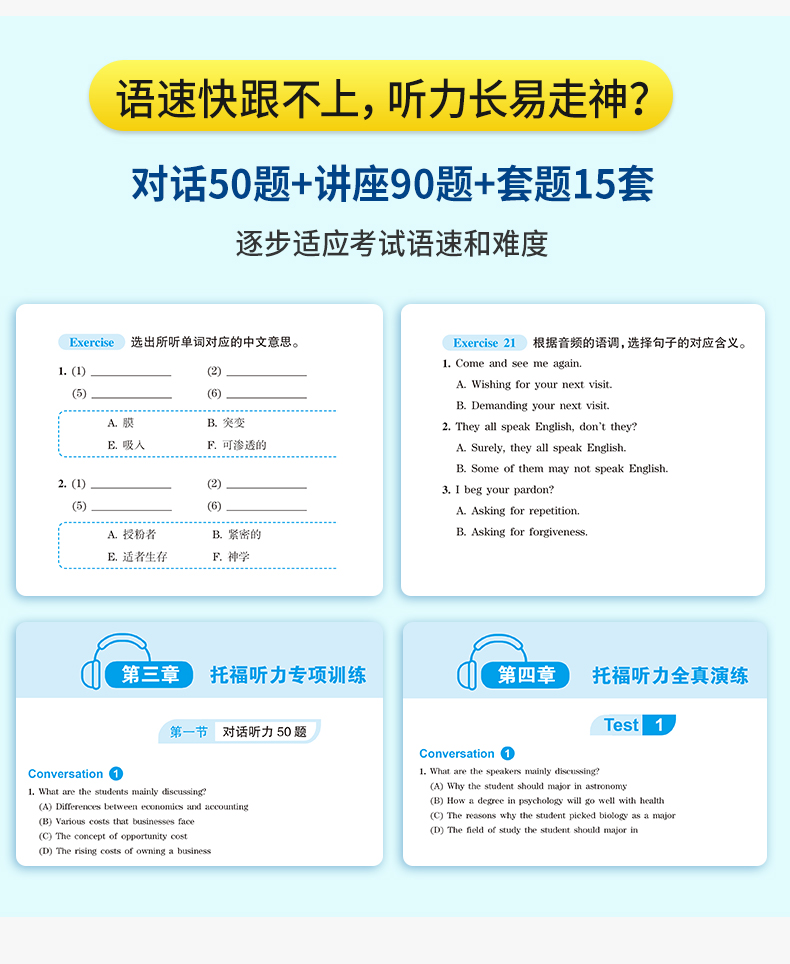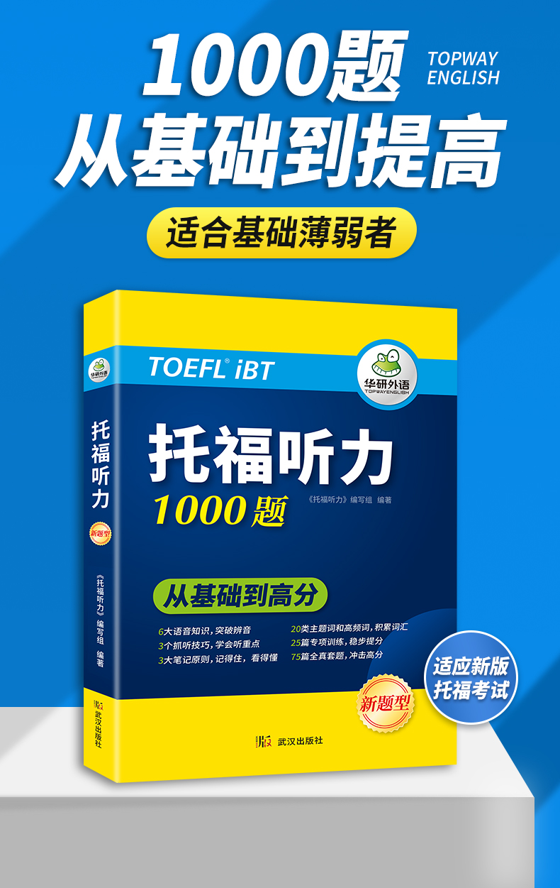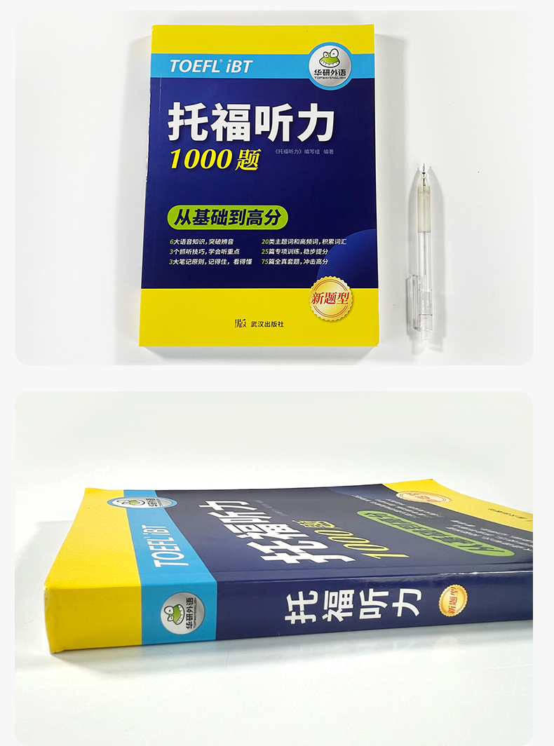 2. 1000道循序渐进的听力练习,从语音、词汇、句子到篇章,再从对话和讲座分项练习到整套听力题的全真演练,帮助考生实现从基础到高分的突破;