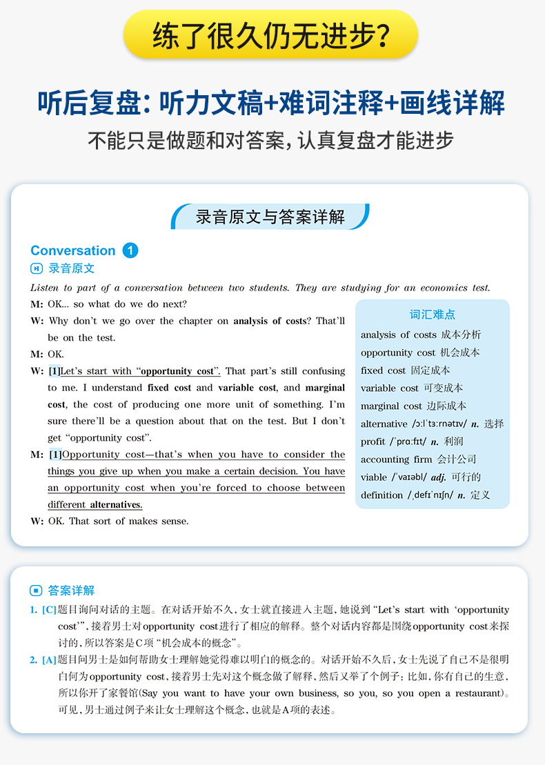 5. 提供听力原文稿和难词注释,画线标注解题关键处,方便学生听后复盘;