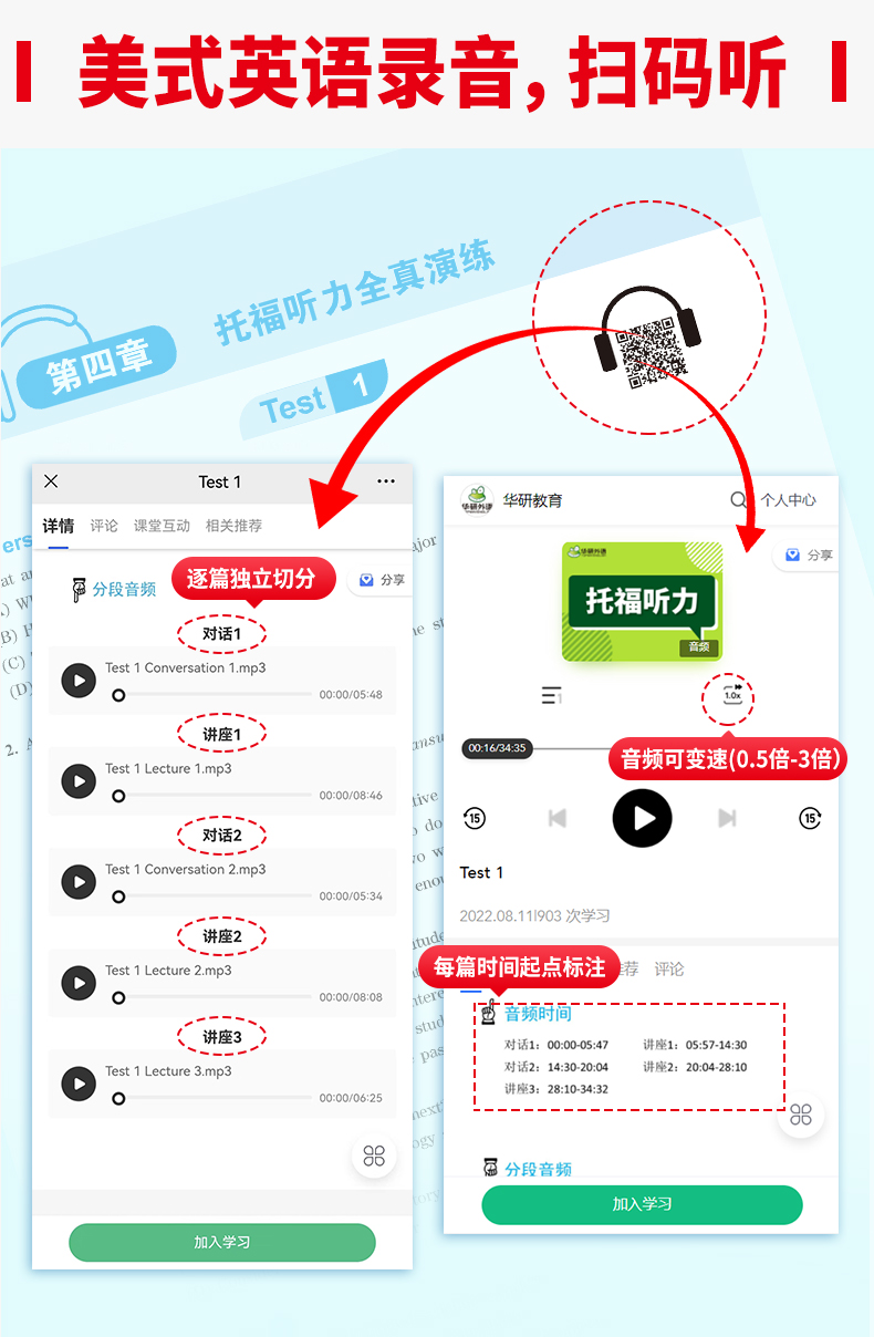 6. 听力试题由北美外教录制,高度还原考场感;扫码获取音频,在线听或下载听均可。