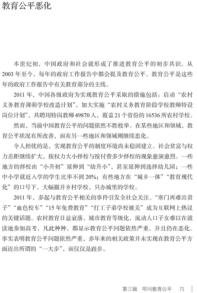 令人担忧的是,实现教育公平的制度环境尚未稳固建立。社会贫富与权力差距继续扩大,按权力大小择校与按付费多少择校的现象愈演愈烈。一些地方的择校由“小升初”延伸到“幼升小”,甚至延伸到选择幼儿园……事实表明教育公平问题依然严重。
