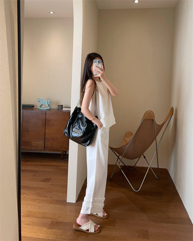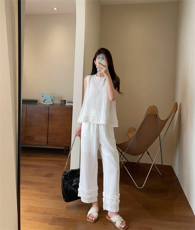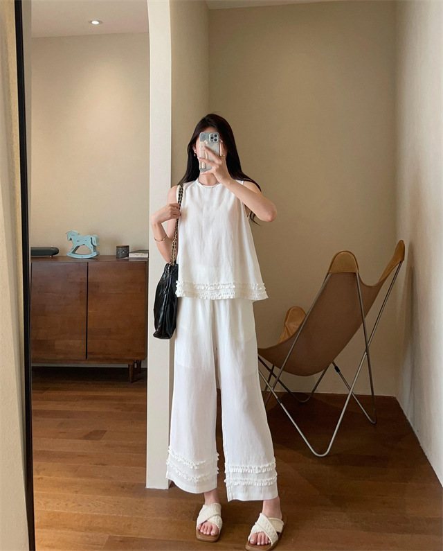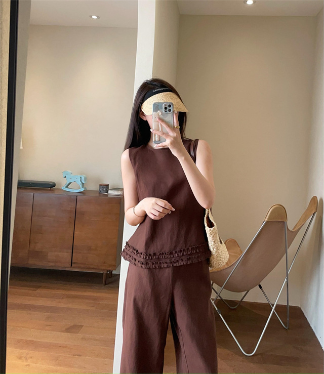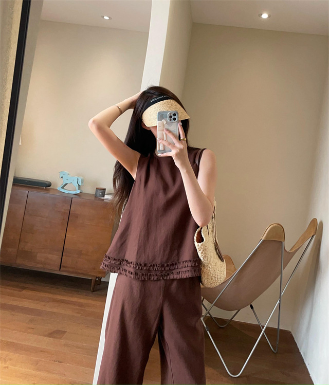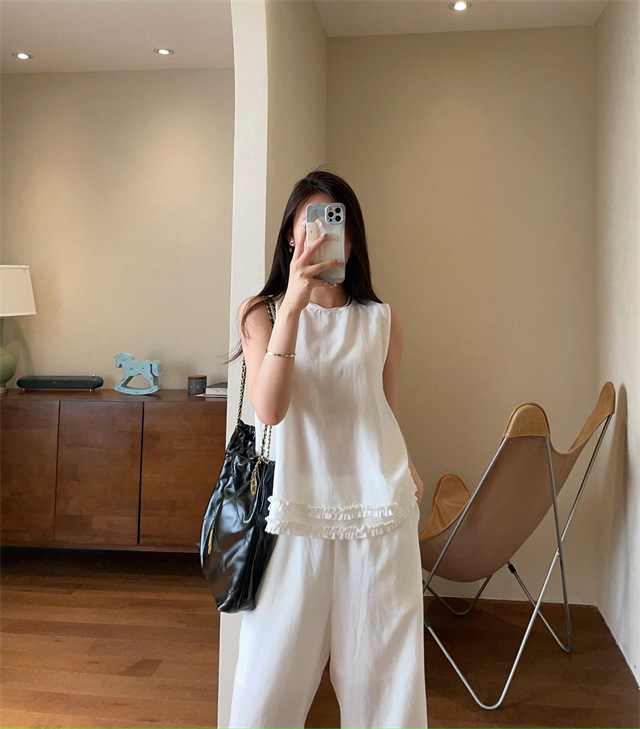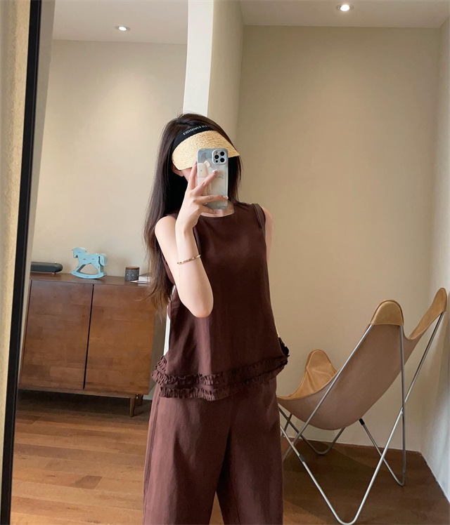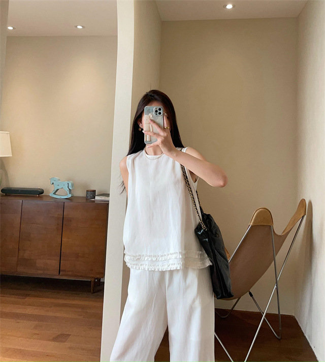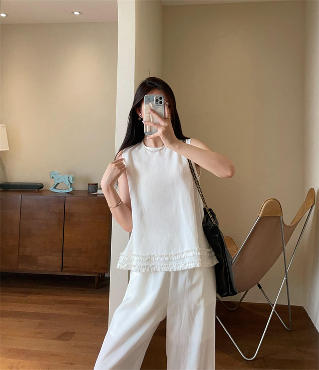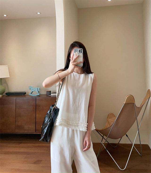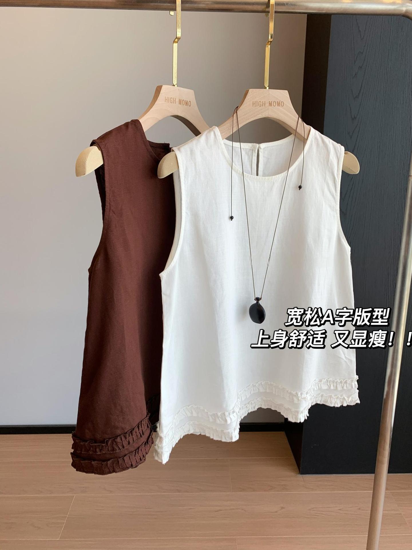 上衣利落无袖设计,摆脱夏日束缚感,露出纤细手臂线条,显瘦又清凉