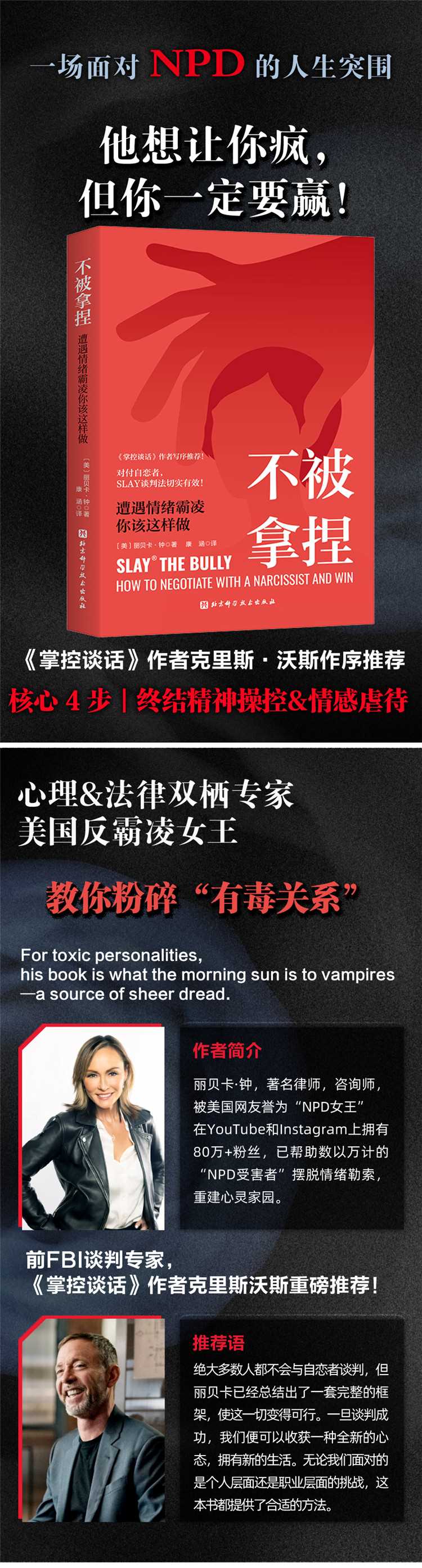 你生命中有没有这样一个人,一想到他就感到压抑、不安,甚至还有喘不上气的窒息感?如果有,那你可能正在遭受某个病态自恋者(自恋型人格障碍患者)的情绪勒索甚至是霸凌。是的,有个疯子正在拿捏你,他想把你也逼疯。如果你意识到了问题的严重性,那就要尽早找到突围的办法。本书旨在教会读者识别各类型的病态自恋者,以及他们惯用的心理操控伎俩,然后运用作者独创的;SLAY谈判法安全平稳地脱离有毒关系,赢回自己的人生