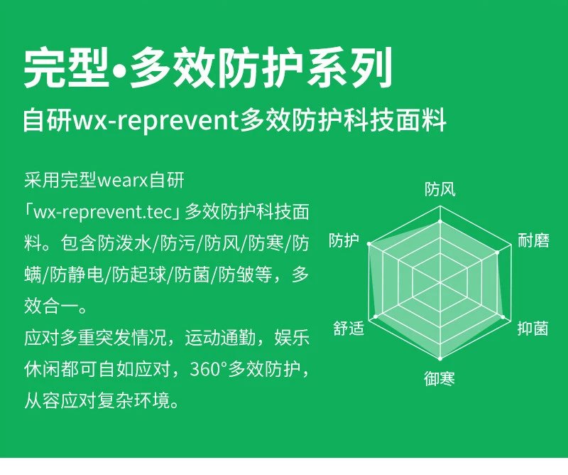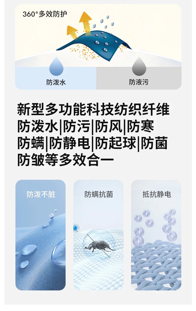 自研多效防护科技面料,防寒!防风!防泼水!防污!防菌!防螨!防静电!防起球!防皱!等多效合一