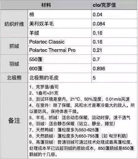 不同材料的性能,克罗值越高,保暖效果越好,比如棉的克罗值是0.04,羊毛是0.08,也就是说,同等重量下,羊毛的保暖是棉花的2倍