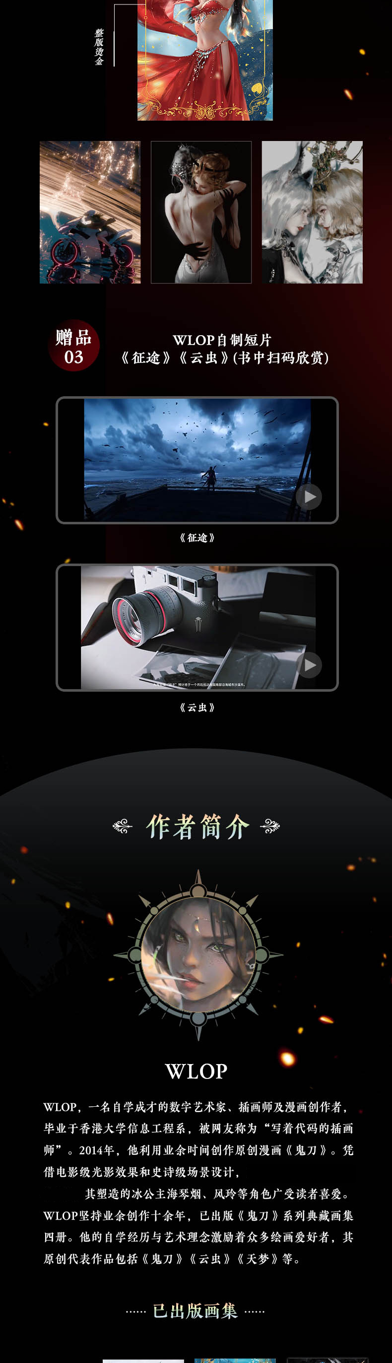 WLOP,一位自学成才的数字艺术家、插画师及漫画创作者,毕业于香港大学信息工程系,被网友称为“写着代码的插画师”。2014 年,他开始利用业余时间创作原创漫画《鬼刀》。凭借电影级光影效果和史诗级场景设计,该作品全网点击量突破5亿,其塑造的冰公主海琴烟、风玲等角色广受读者喜爱。WLOP 坚持业余创作十余年,已出版《鬼刀》系列典藏画集四册。他的自学经历与艺术理念激励着众多绘画爱好者,其原创代表作品包括《鬼刀》《云虫》《夭梦》等。