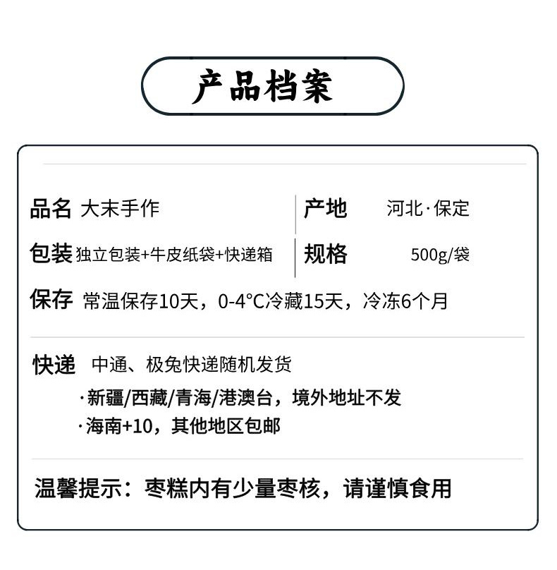 1:枣糕新鲜现做,没有科技狠活,收到货后如不能一次吃掉,请放入冰箱冷藏保存,