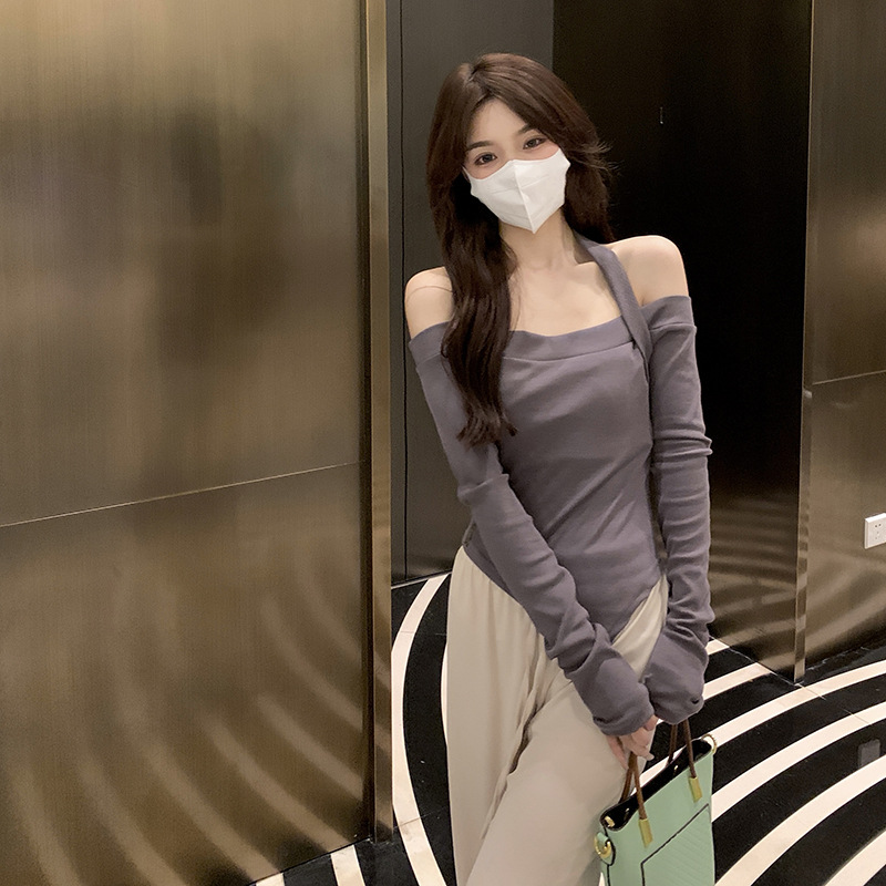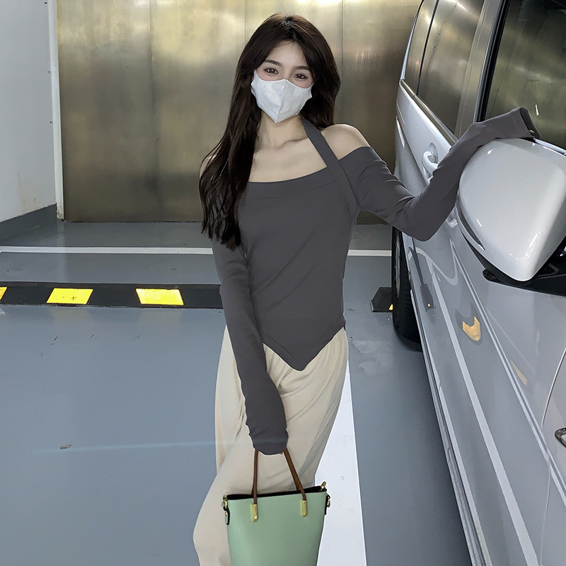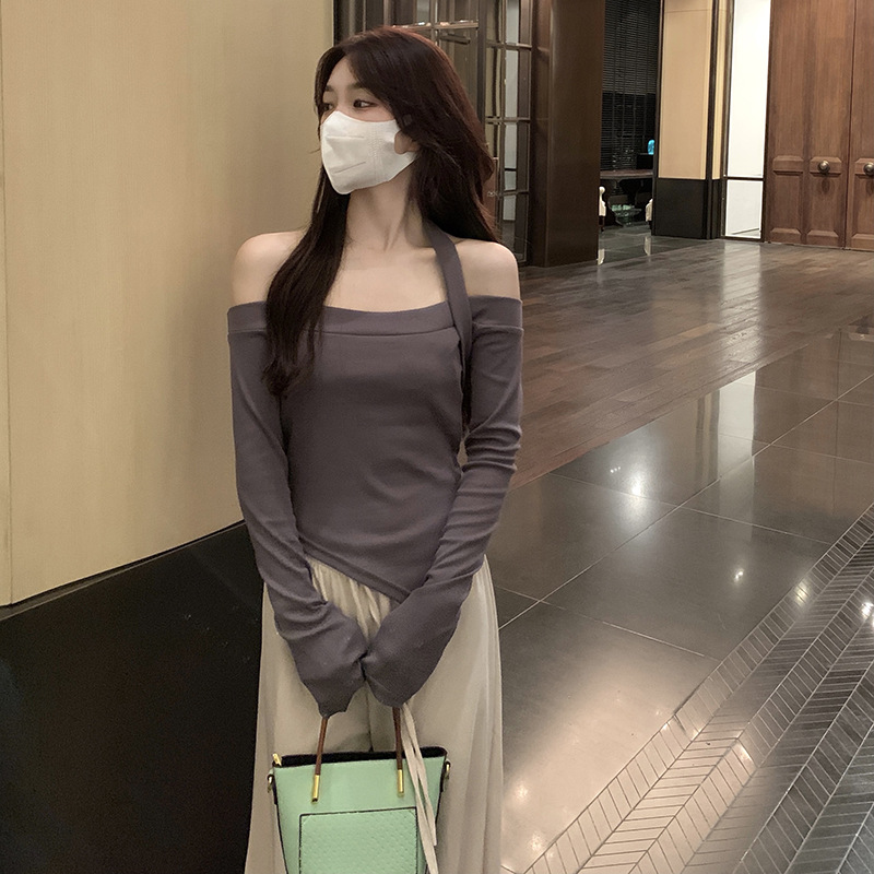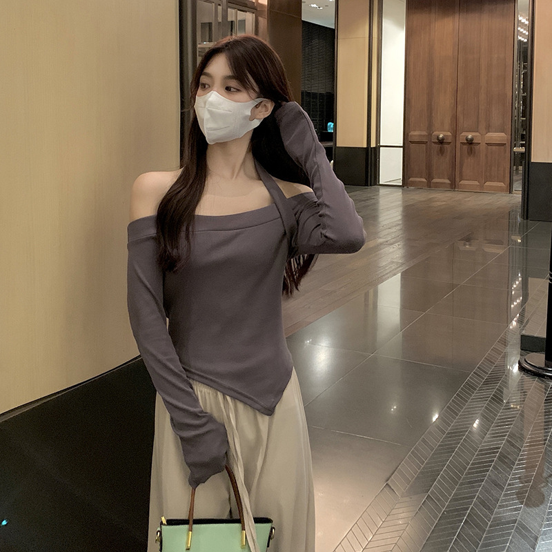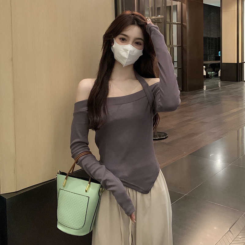 【性感纯欲修身百搭!辣妹一字肩长袖T恤】春季小众短款修身t恤 ,罗纹一字肩长袖T恤上衣