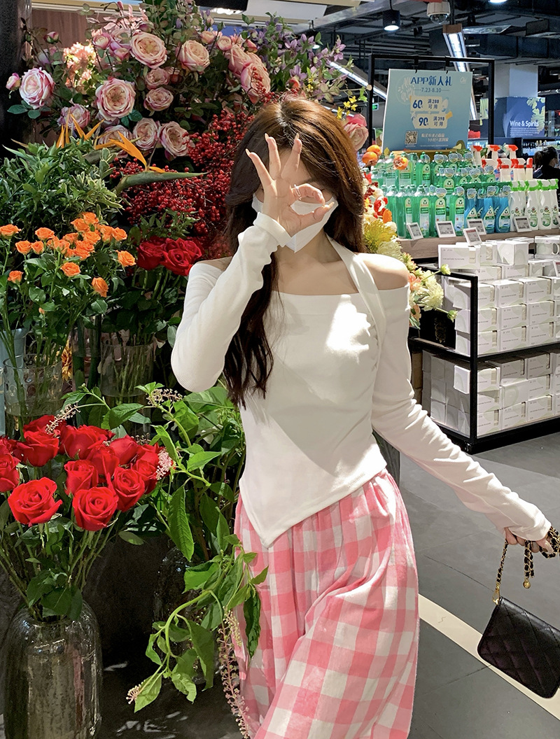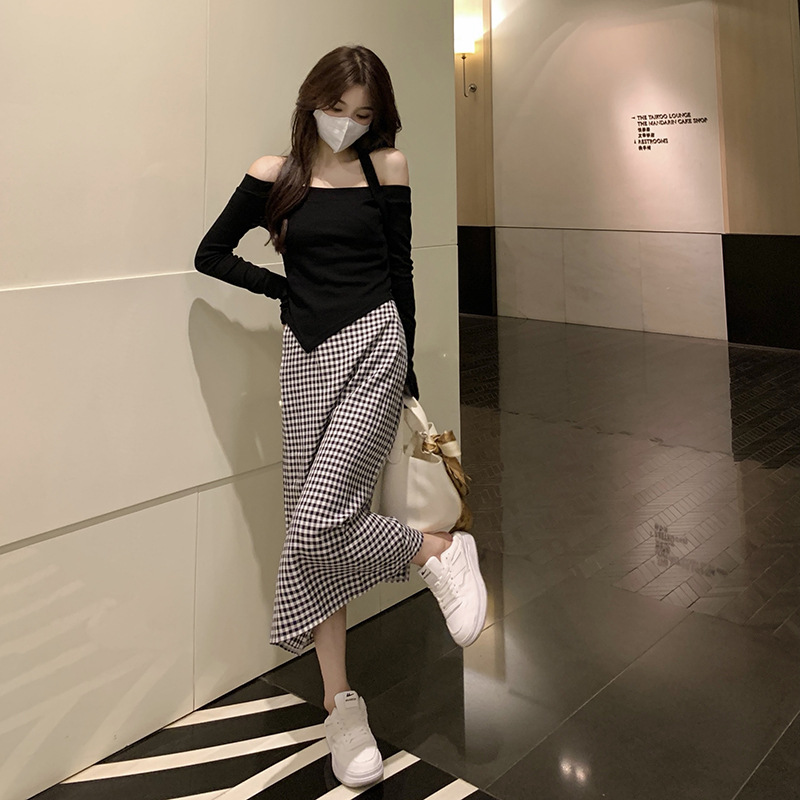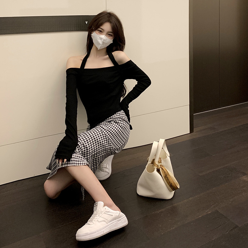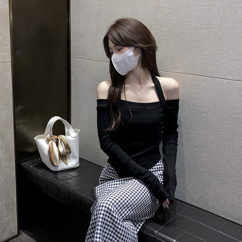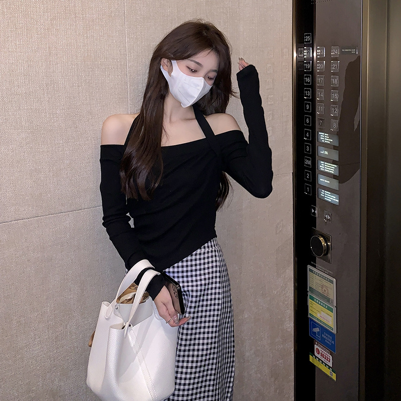 【性感纯欲修身百搭!辣妹一字肩长袖T恤】春季小众短款修身t恤 ,罗纹一字肩长袖T恤上衣