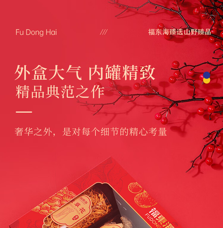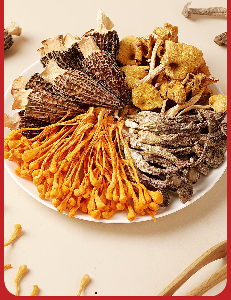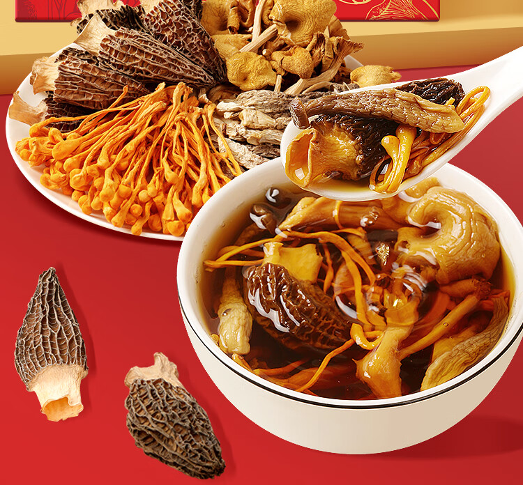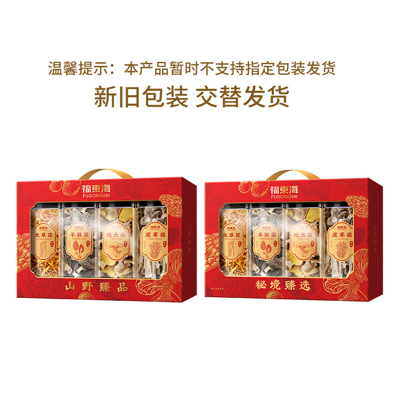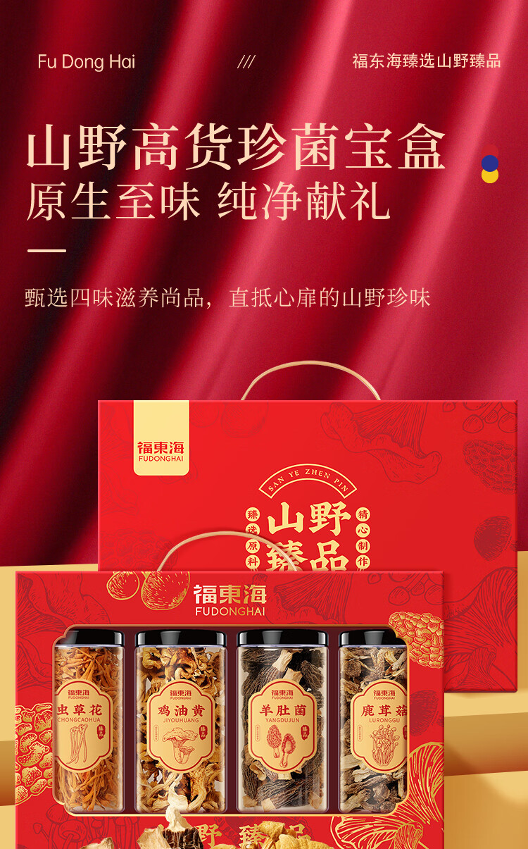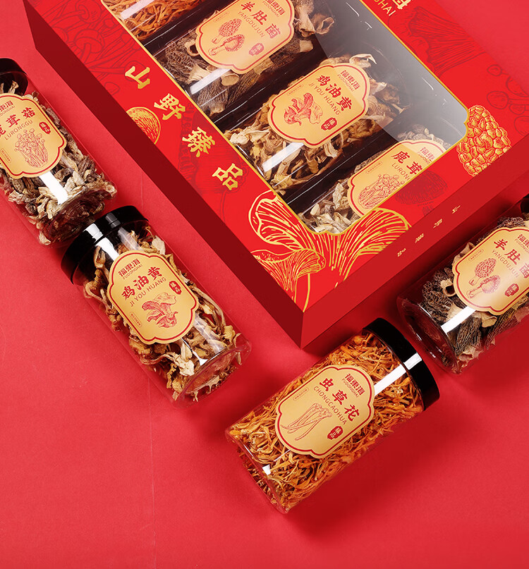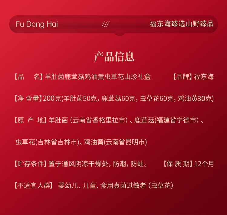 福东海 羊肚菌鹿茸菇鸡油黄虫草花山珍礼盒200克(羊肚菌50克、鹿茸菇60克、虫草花60克、鸡油黄30克)/盒