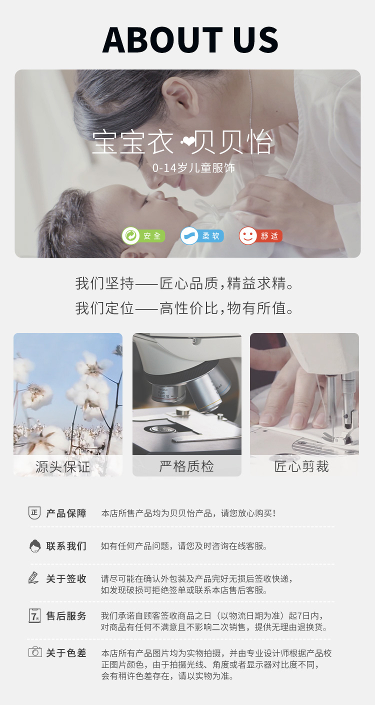 - 贝贝怡专注0-6岁婴幼儿服饰,坚持安全、柔软、舒适的产品理念,为千万中国家庭提供超高品质、安全可靠的婴幼儿服饰产品,妈妈放心,宝宝开心!