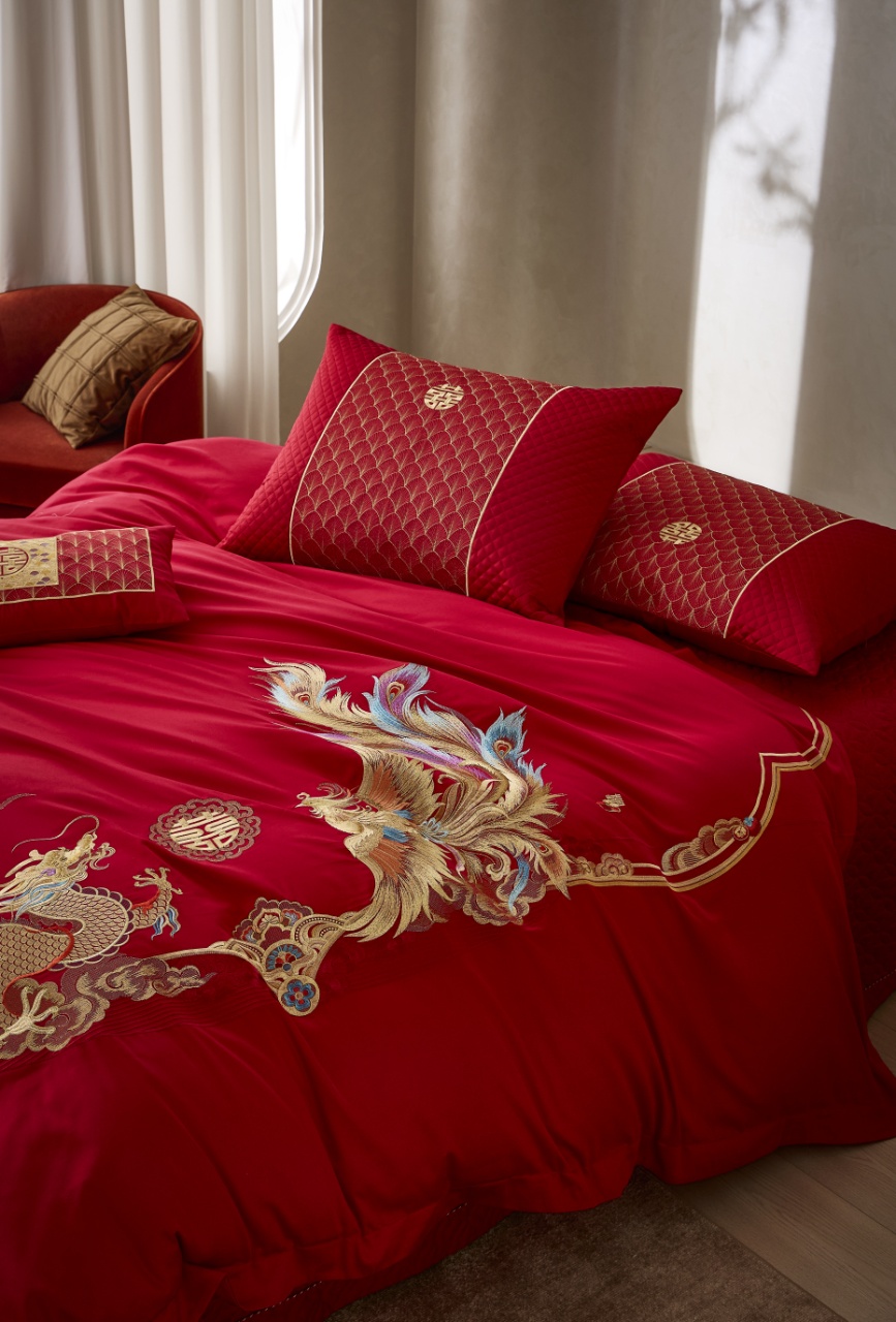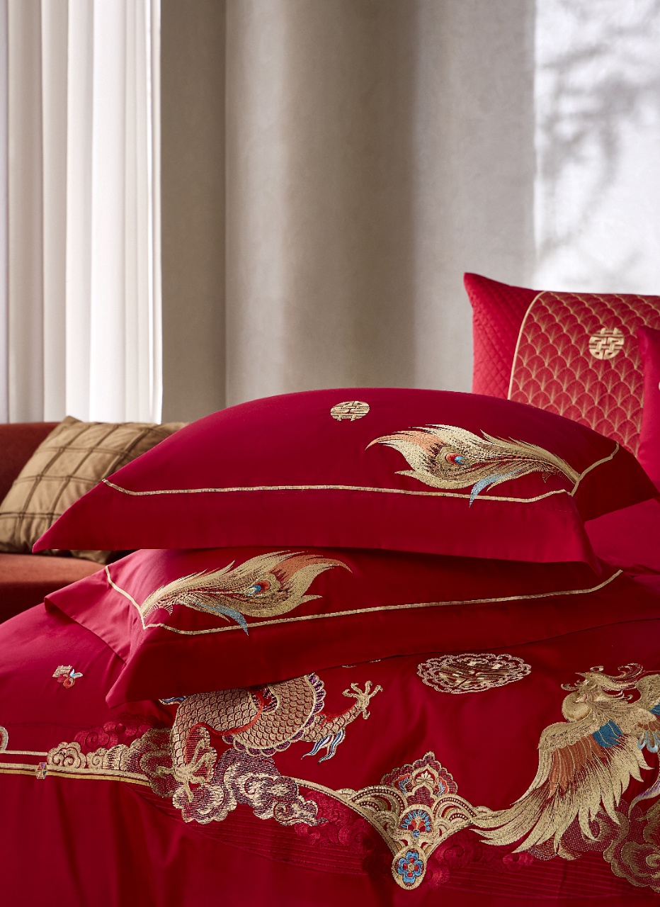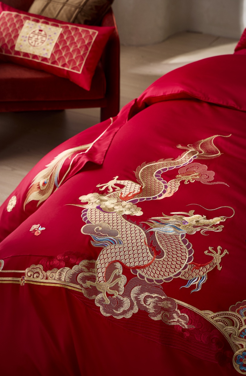 摒弃繁复堆砌,萃取传统吉祥符号的骨架与神韵,以现代设计语言进行重构。正红底色取自"朱砂印泥"的沉静与"绛唇点脂"的浓烈,不喧哗却自有千钧之力。整体布局如一幅工笔勾勒的合卺画卷,在留白与丰盈,古意与现代之间,寻得恰好的呼吸感。龙凤对望,象征阴阳相济,圭偶天成;是守护,亦是并肩。以云纹为廓,包融双喜,似窗棂,似绣绷;寓意圆满,循环不息。柿蒂纹样含蓄点缀,寓意"事事如意,好愿成双"。祥云承托于龙凤足下,象征着根基稳固,前路平步青云。