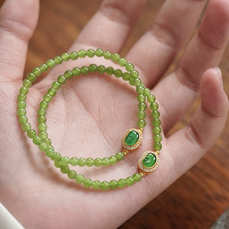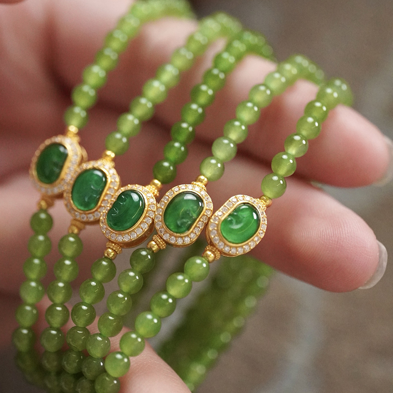 碧玉冰种苹果绿小米珠,搭配银镶翡翠阳绿如意。特别小清新的搭配,精致养眼不失贵气~卡4 8*10mm