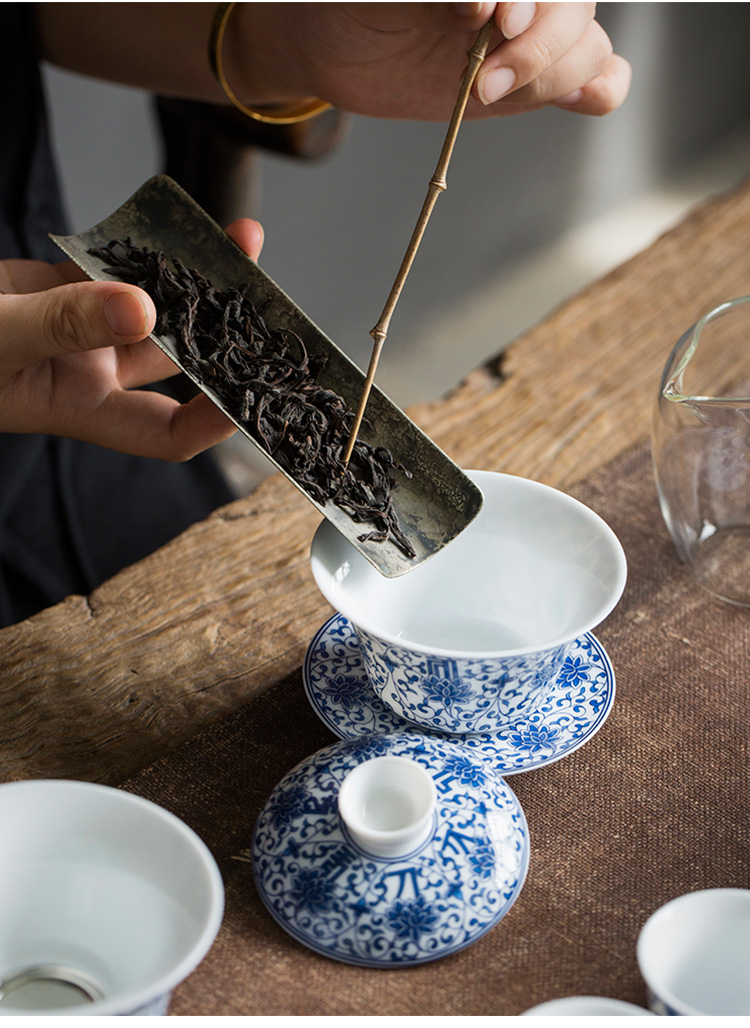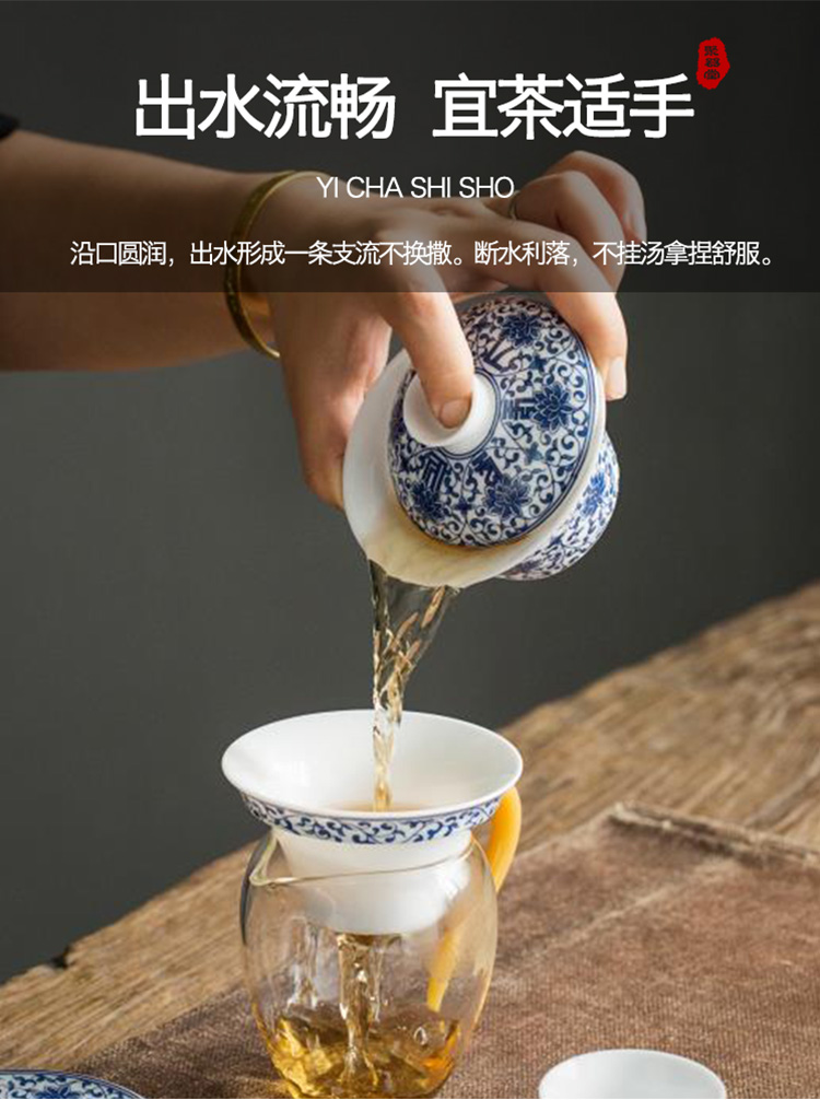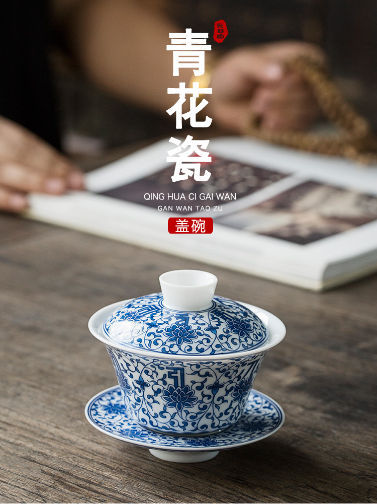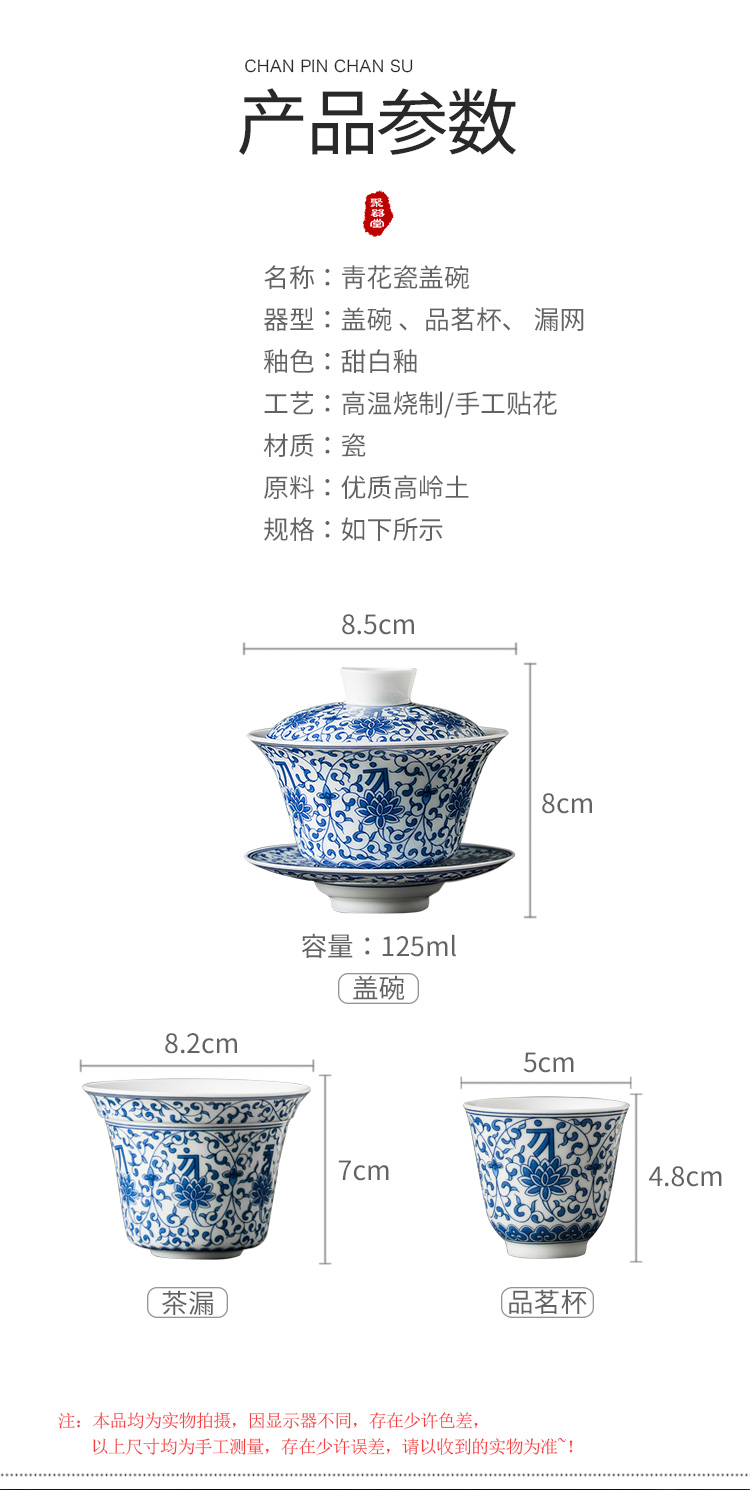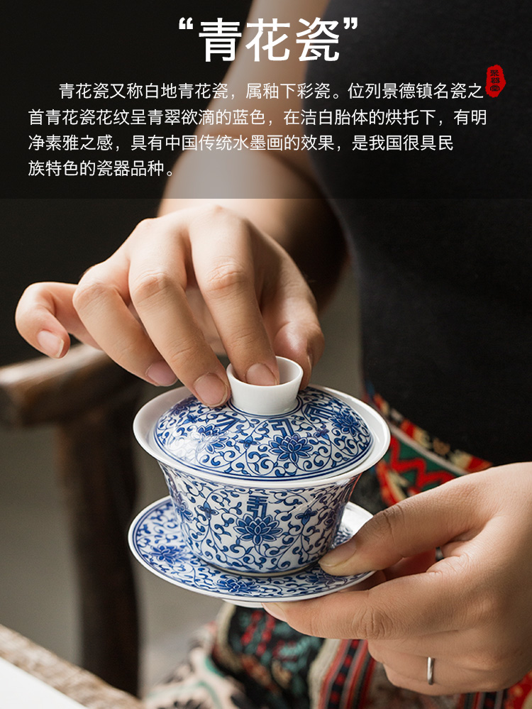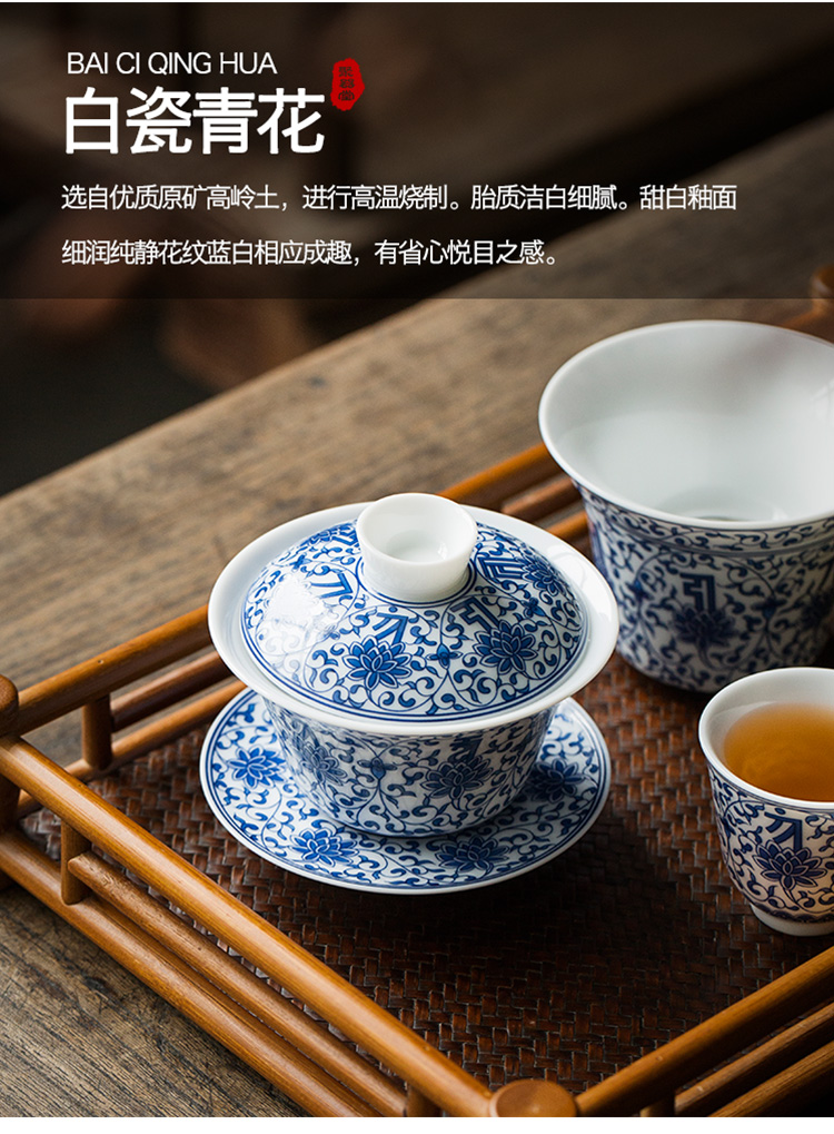 永利汇青花缠枝莲盖碗三才碗手抓碗品茗杯茶漏功夫茶具套组礼盒装复古
