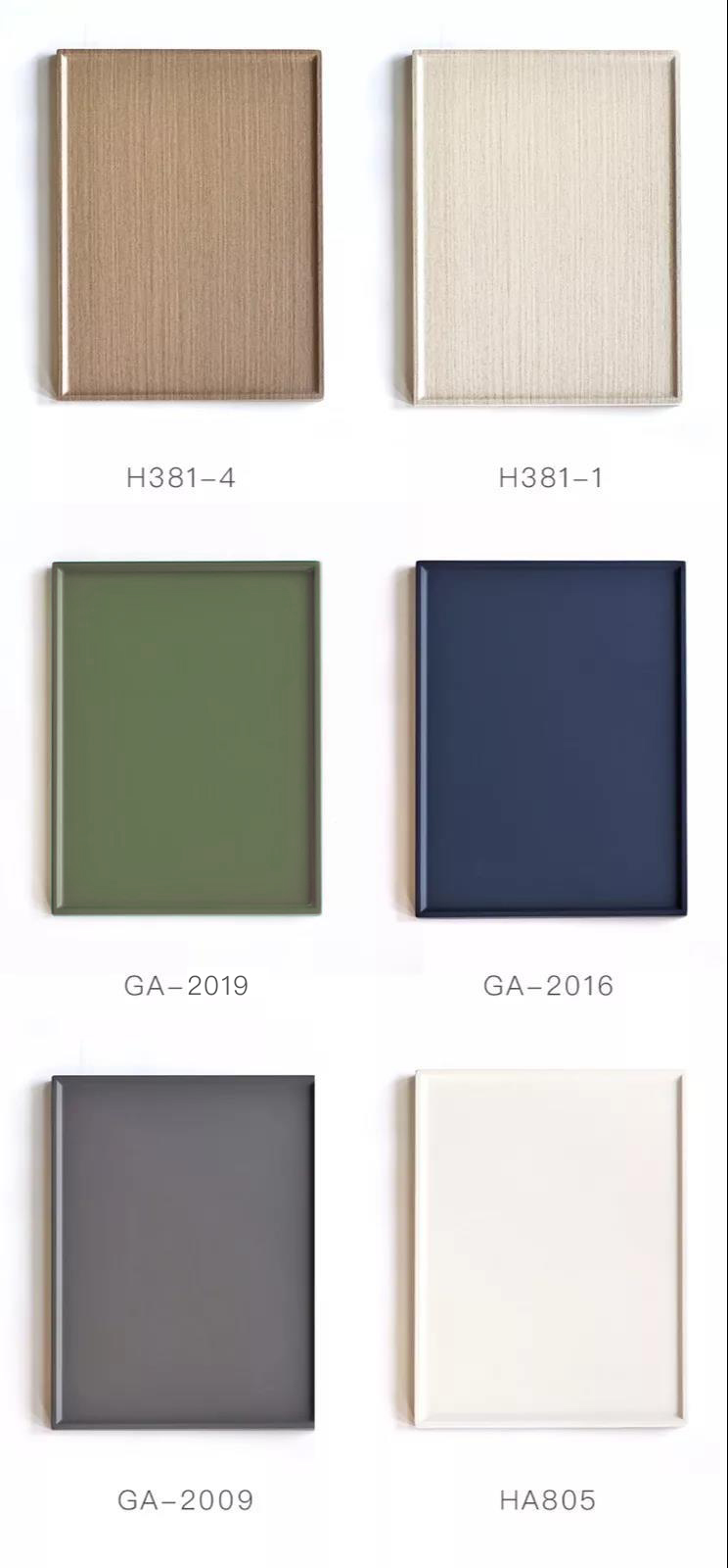 以上是列蒂系列门板可选颜色的集合,前5种带颜色的,用于地柜。追求亲和力的话,还是建议选择木纹色的两款,而纯色的3款,则带点轻奢范。白色的(HA805),建议用于吊柜的柜门