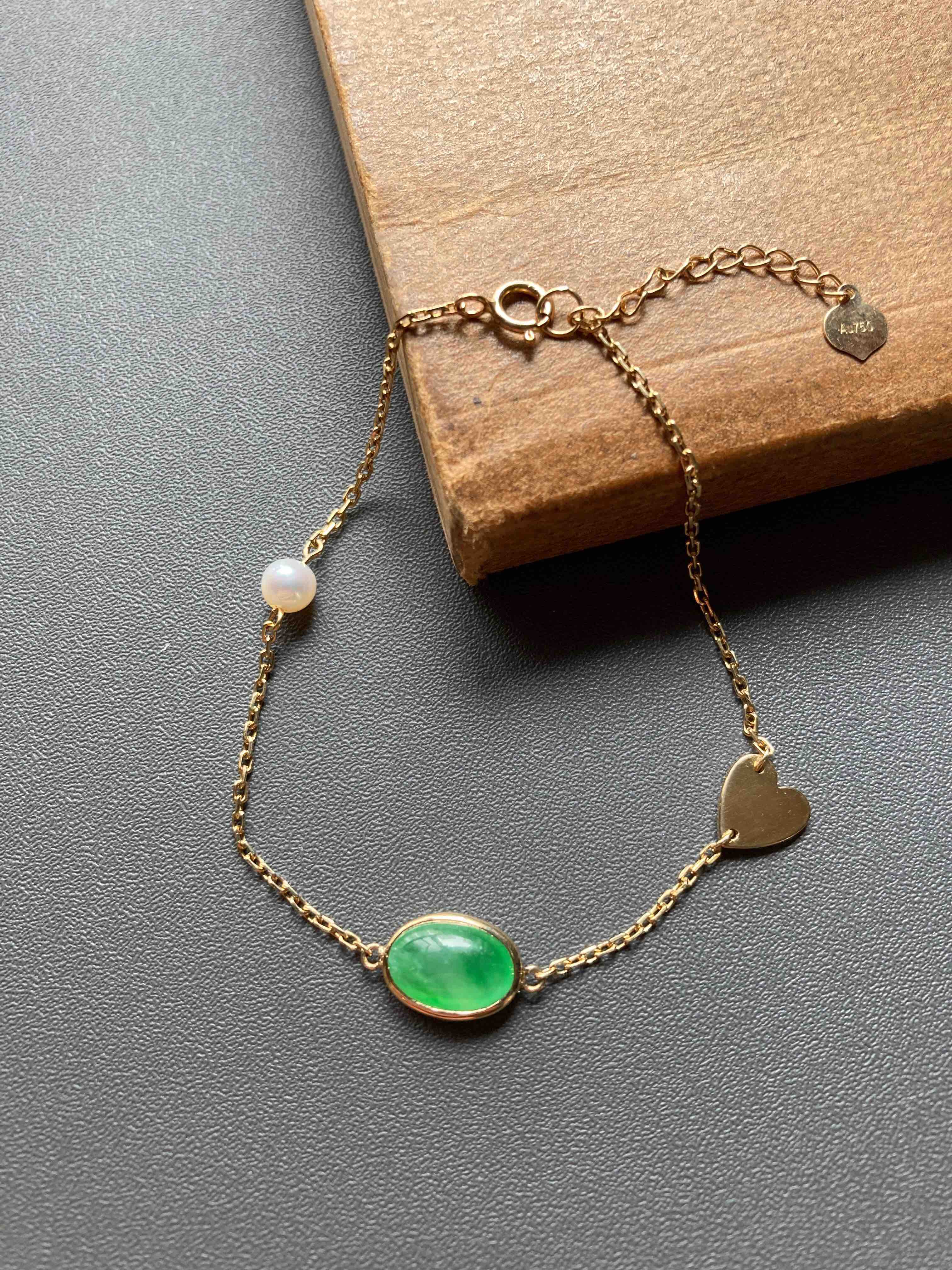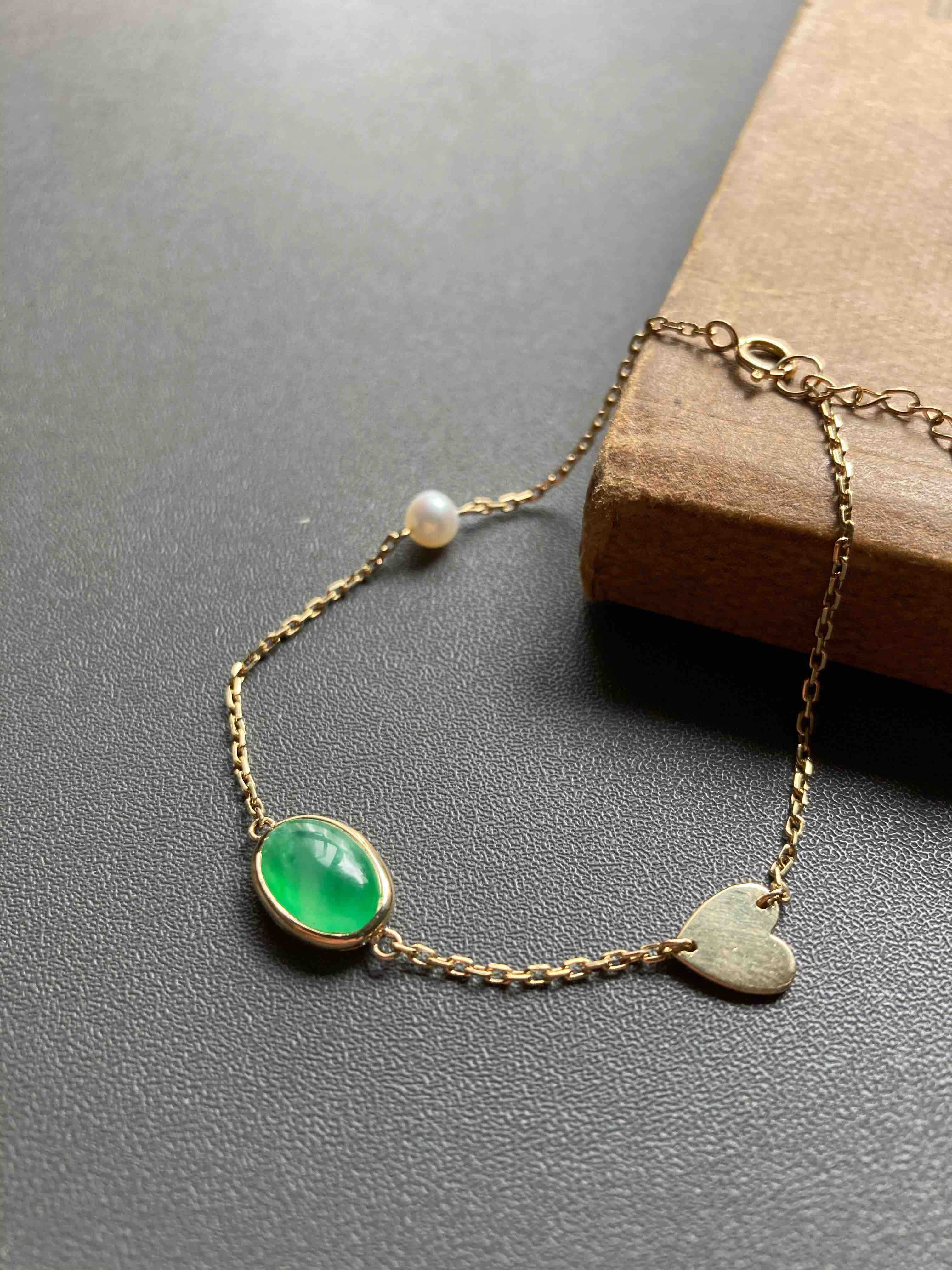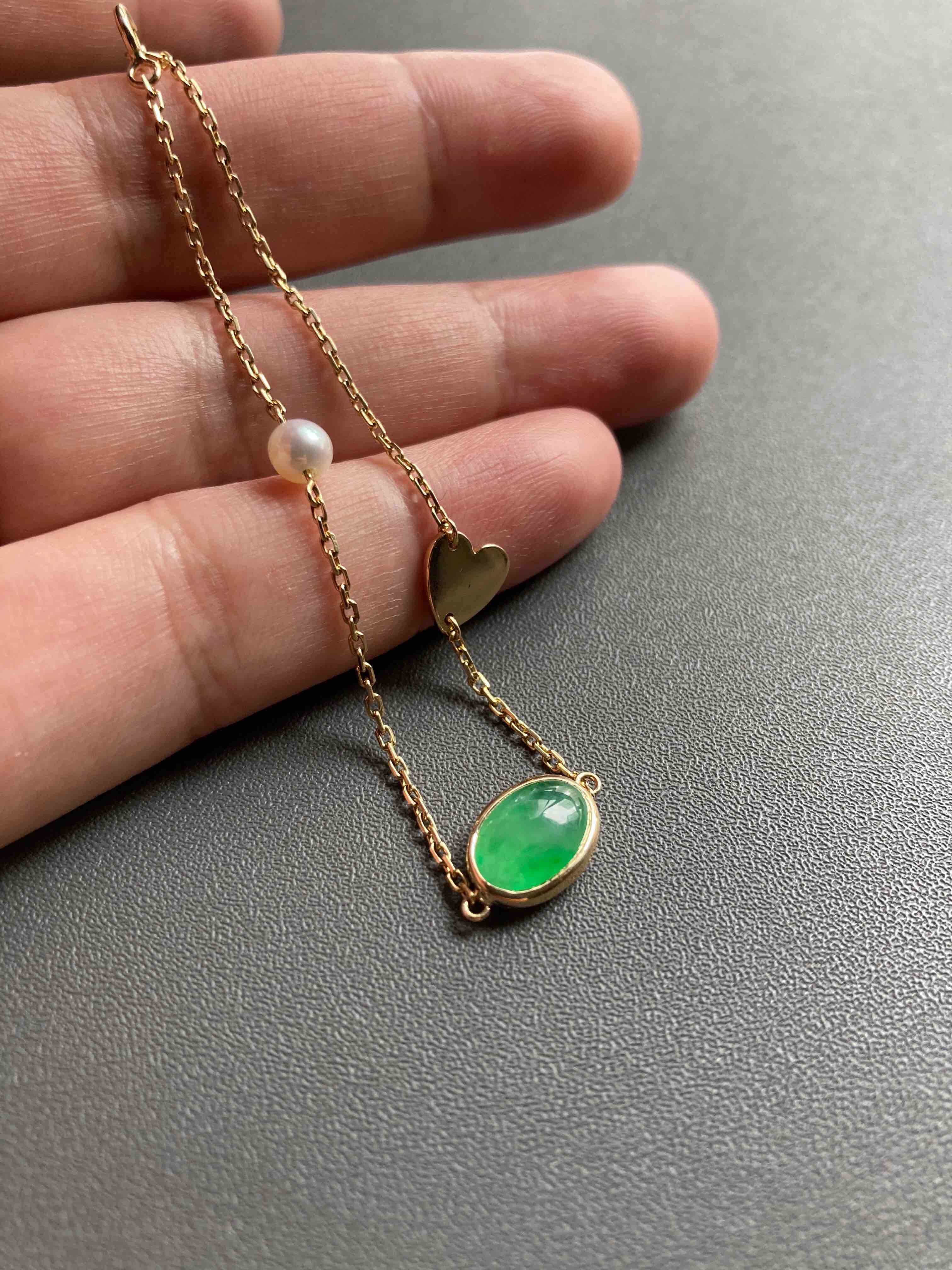 好看吗?高冰种阳绿蛋面翡翠手链,蛋面10×7.5×4mm,链长16cm加3cm延长链,种水晶莹剔透,荧光四射,阳绿艳丽,搭配珍珠款式别致,18k黄金镶嵌,点缀心牌,可以刻名字,定制属于自己的首饰,只要小四价位,性价比绝了