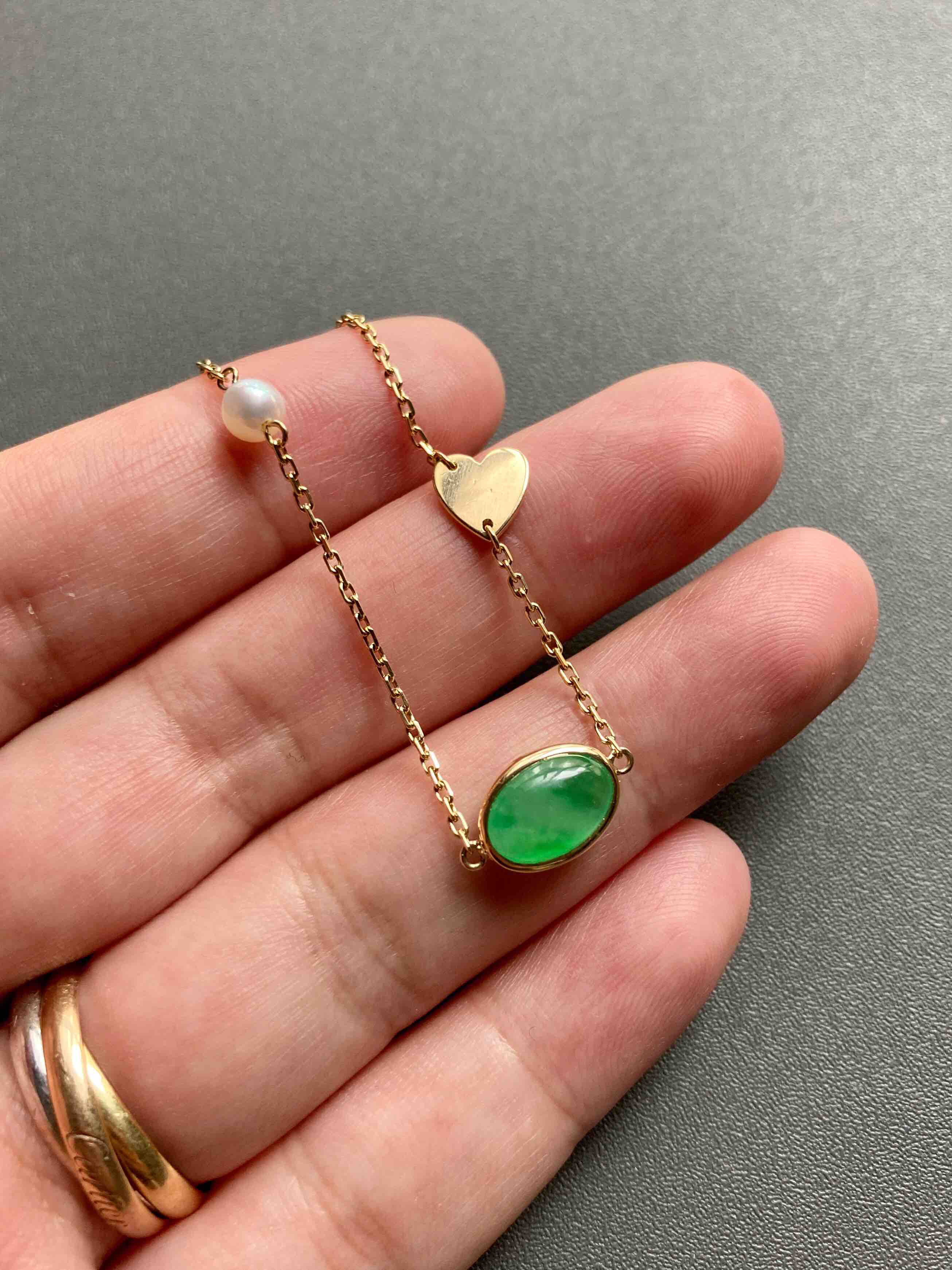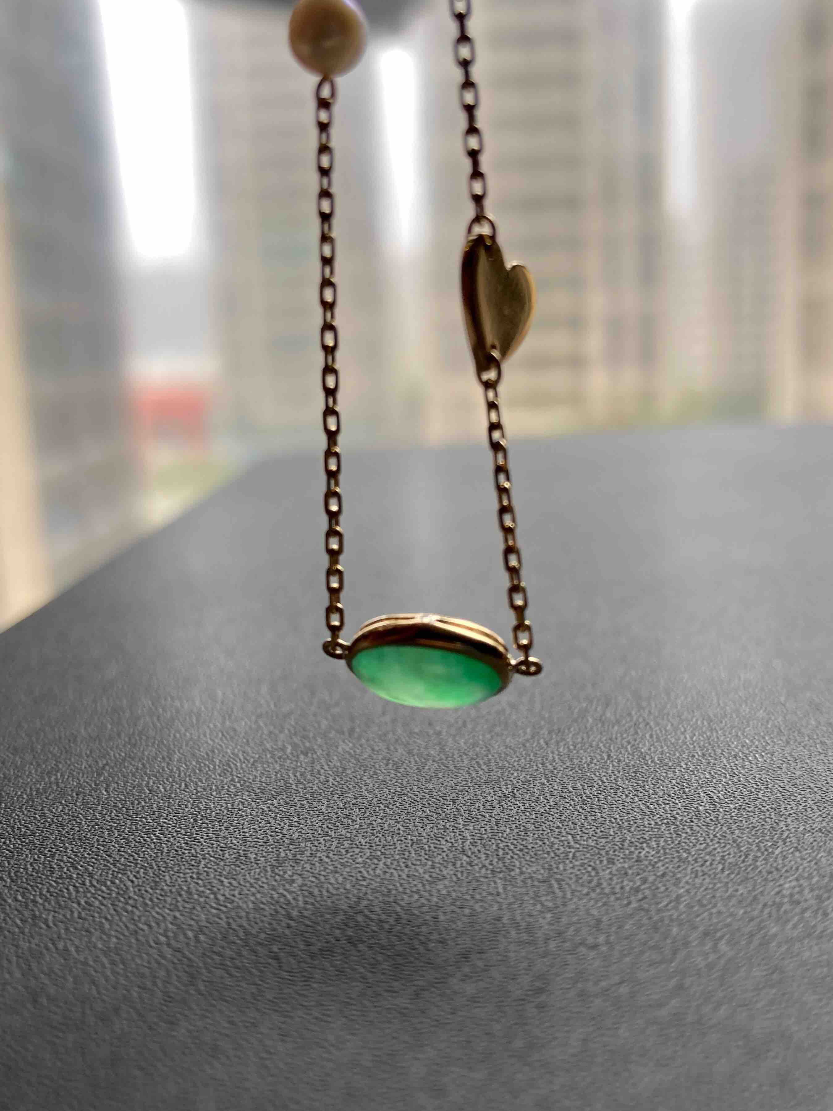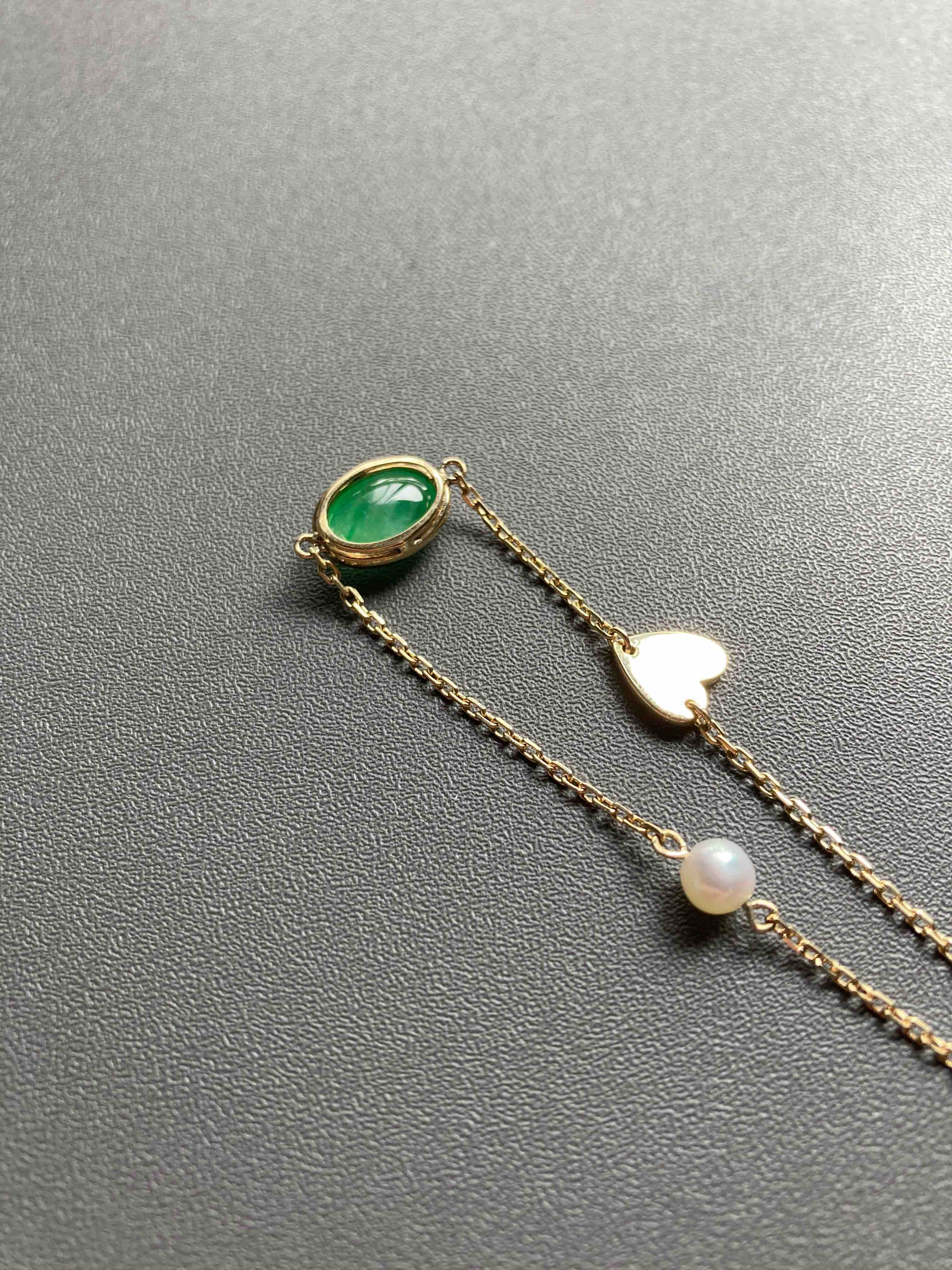 好看吗?高冰种阳绿蛋面翡翠手链,蛋面10×7.5×4mm,链长16cm加3cm延长链,种水晶莹剔透,荧光四射,阳绿艳丽,搭配珍珠款式别致,18k黄金镶嵌,点缀心牌,可以刻名字,定制属于自己的首饰,只要小四价位,性价比绝了
