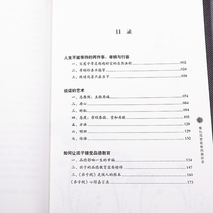 本书收录了《人生不能等待的两件事:孝顺与行善》 、《说话的艺术》 、《如何让孩子接受品德教育》等三部分内容,在家庭教育方面为父母开启了一条行之有效的教育之路。