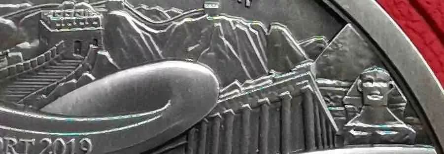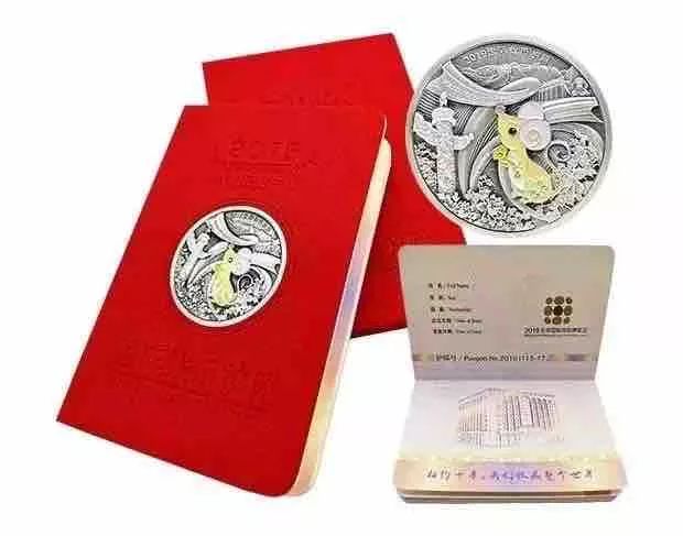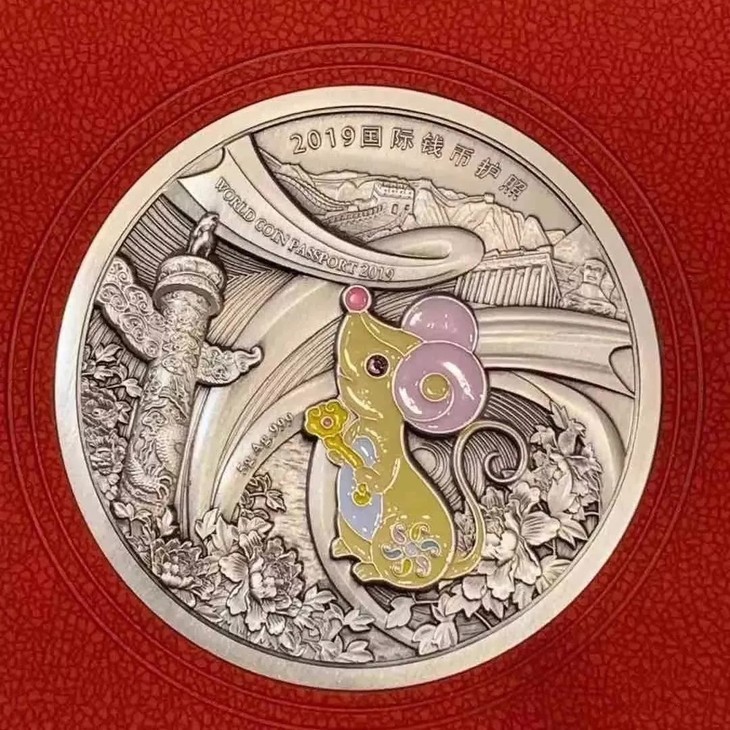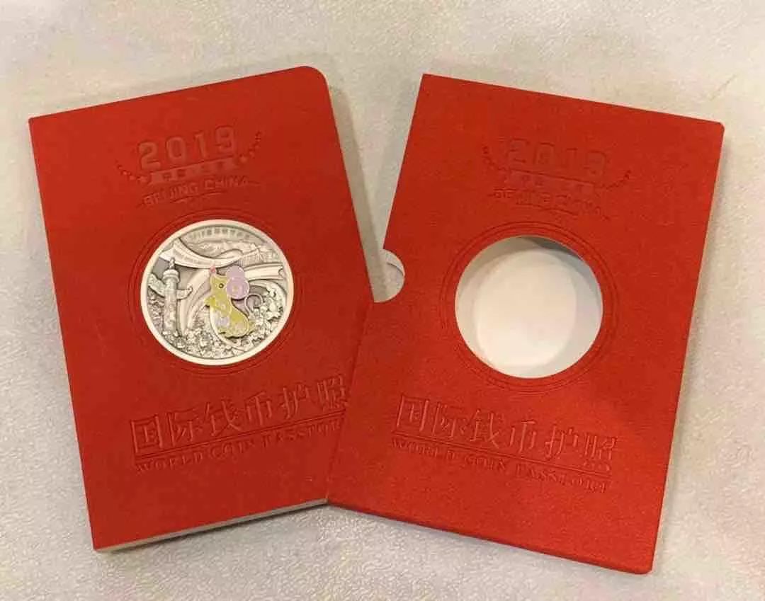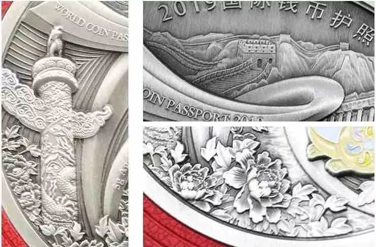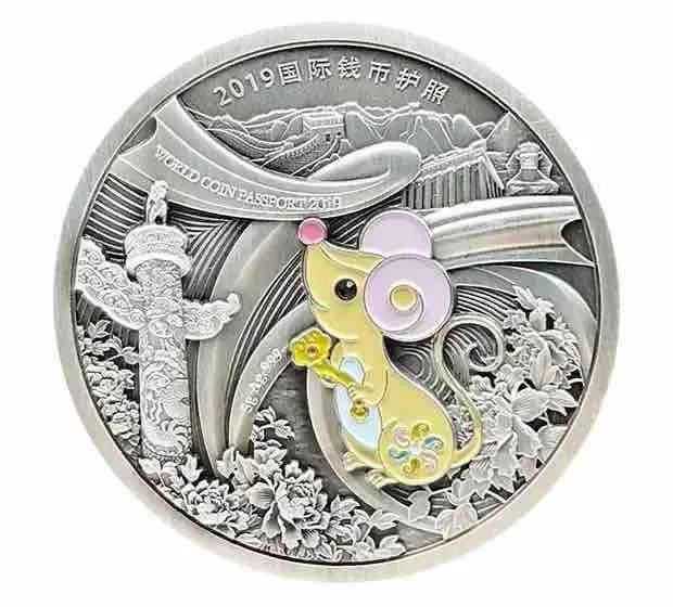 2019国际钱币护照的封面镶嵌有圆形银质纪念章1枚。该银章含纯银5克,直径54毫米,成色99.9%,采用浮雕做旧和局部银胎画珐琅等工艺制作。做工细腻精巧,层次致密丰富,可谓匠心独具。