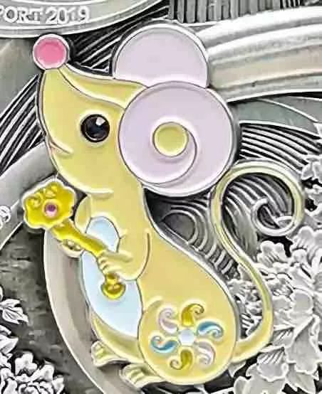 银章近景处,一只机敏灵动的老鼠手捧如意向人们送上“春潮传喜讯,鼠岁报佳音”的美好祝愿,用独具魅力的艺术形式弘扬了源远流长的中国生肖文化。