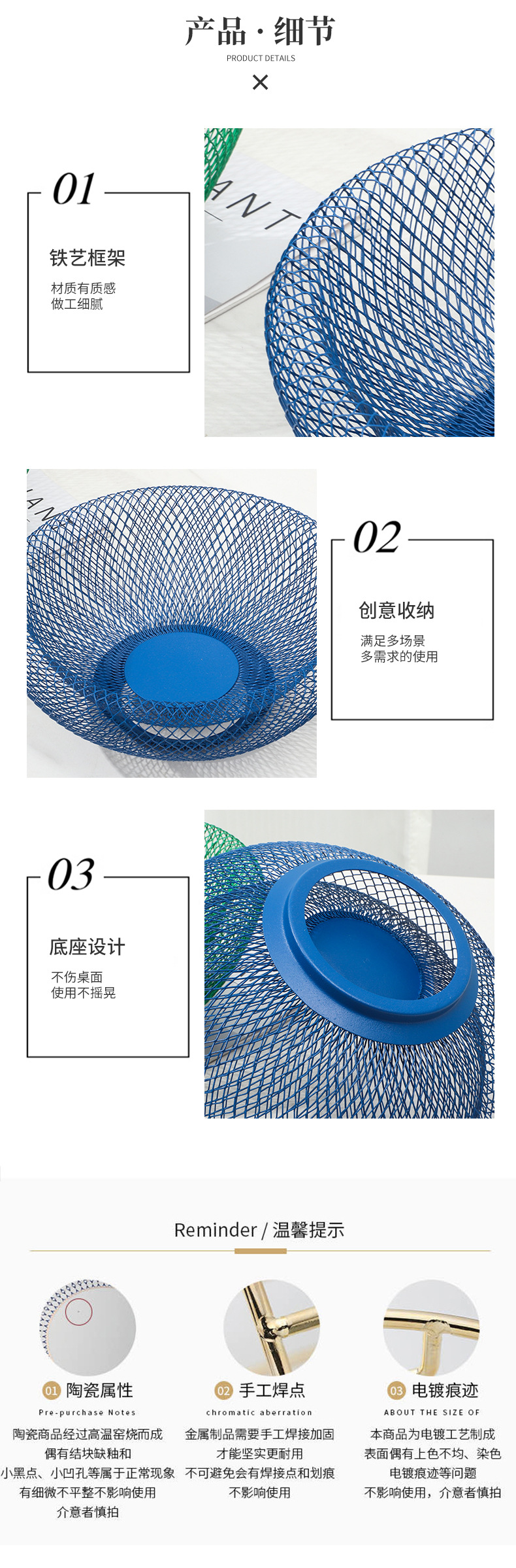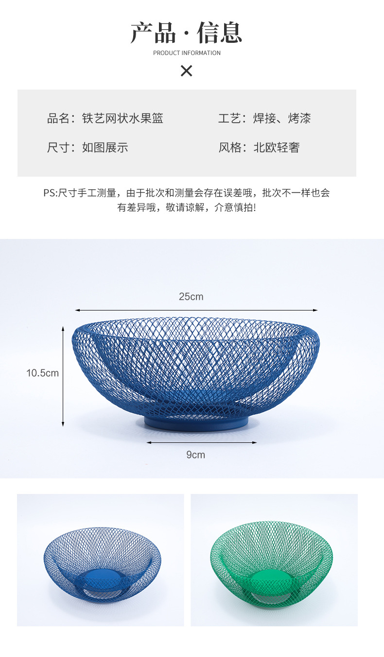 【品名】UYOKU 出口日本原单 北欧风水果篮 简约铁艺水果盘 客厅家用干果盘 【规格】绿色、蓝色 【产地】国内 【发货包装】独立包装 【发货地】浙江 【发货快递】中通、圆通、申通、百世、韵达随机发 【不发货区域】新疆、西藏、港澳台 【发货时效】48-72小时,周末节假日顺延 |