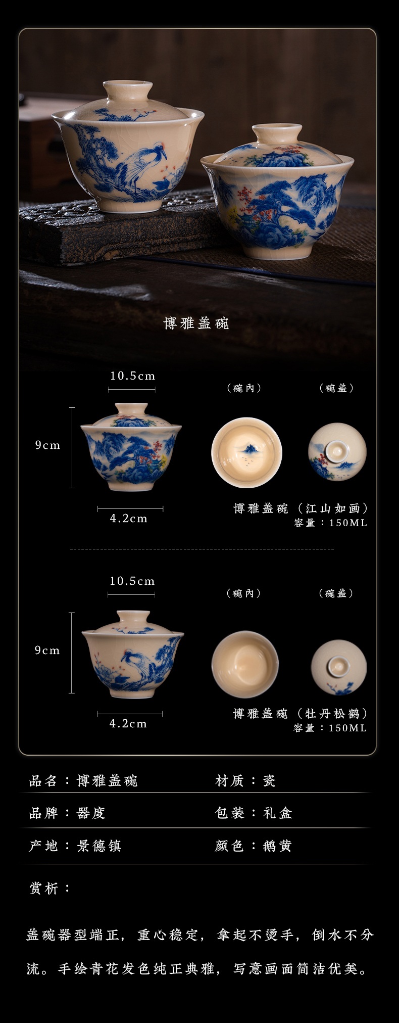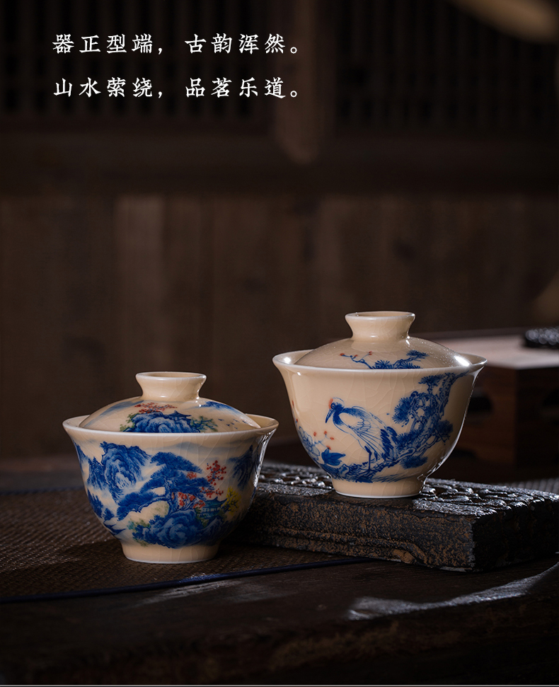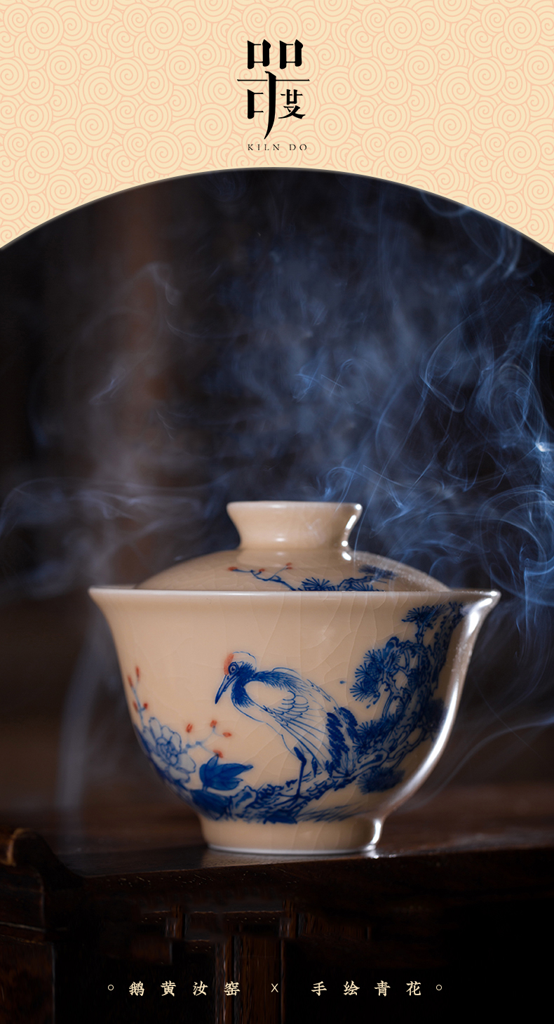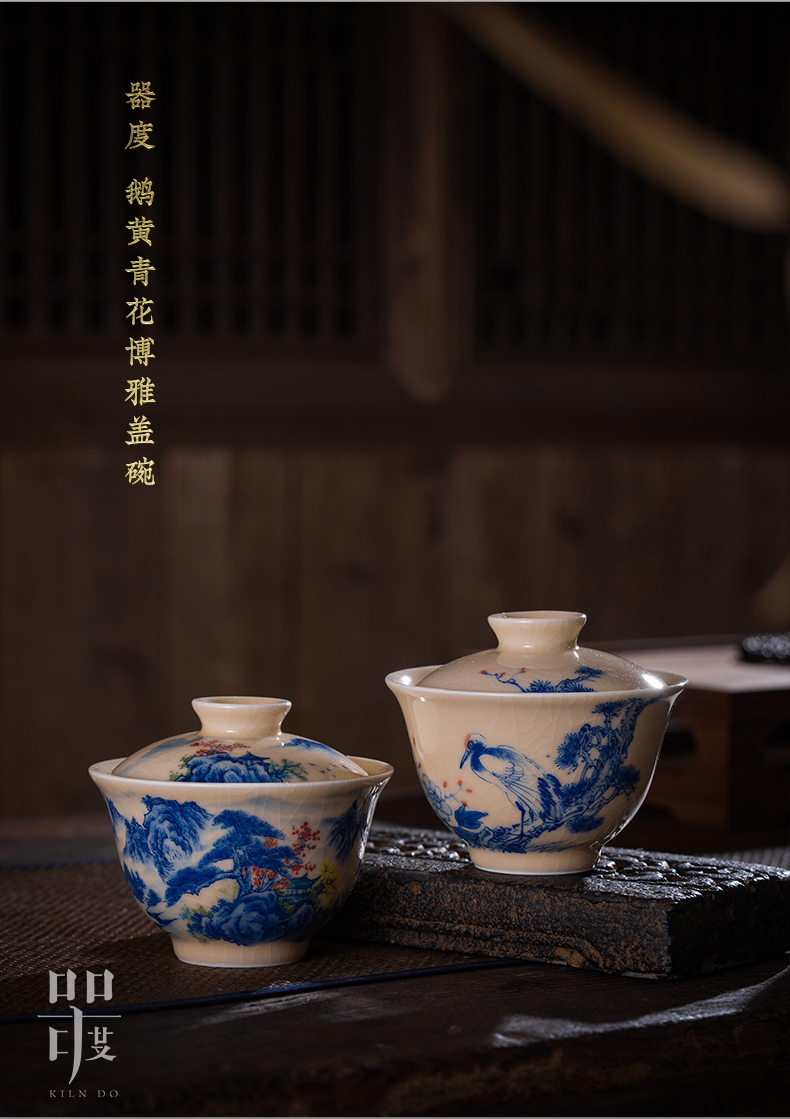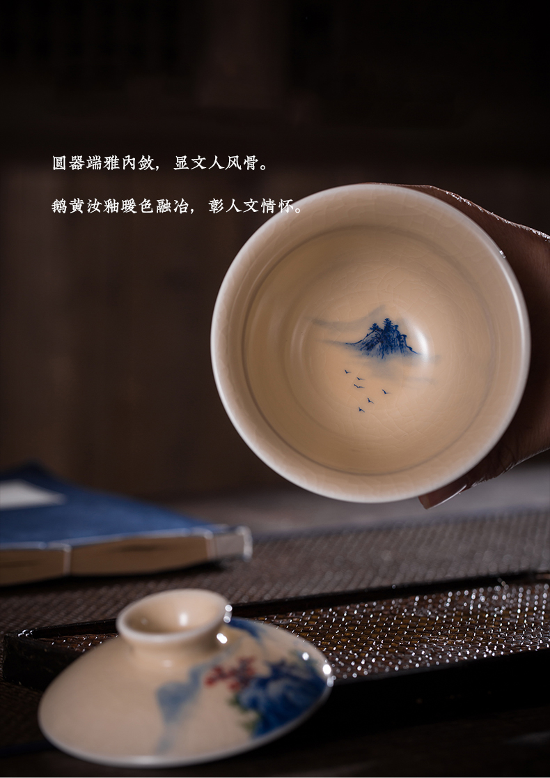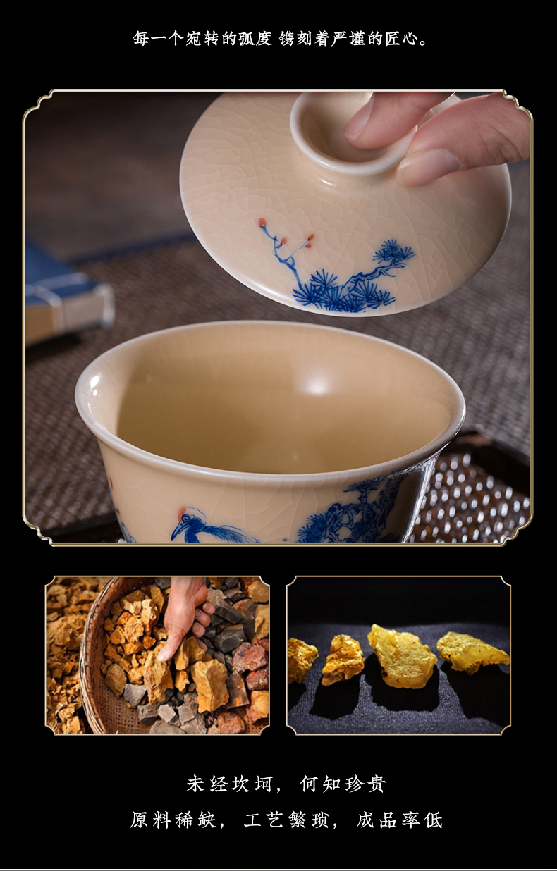 问鼎器度汝窑鹅黄青花博雅盖碗(江山如画)(牡丹松鹤)(缺货)