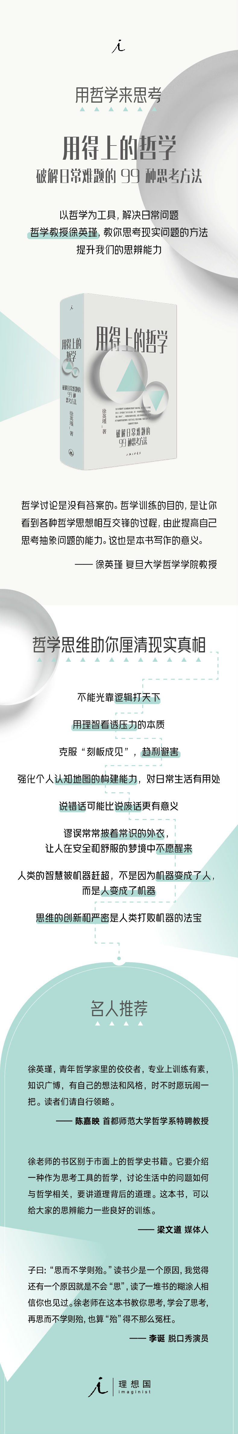 不用教科书般的传统讲法,区别于笼统的辩证思维、繁重的哲学史和唯理性的批判思维,以哲学为线索,聚焦日常问题,掌握哲学思考工具,让抽象的哲学实用起来。