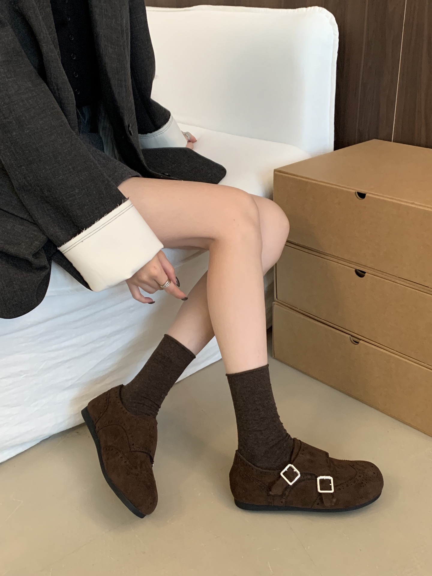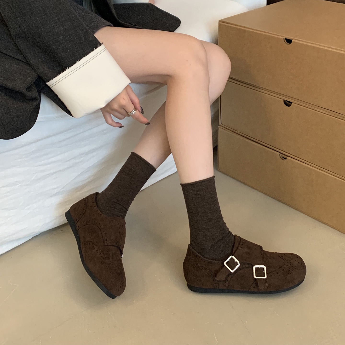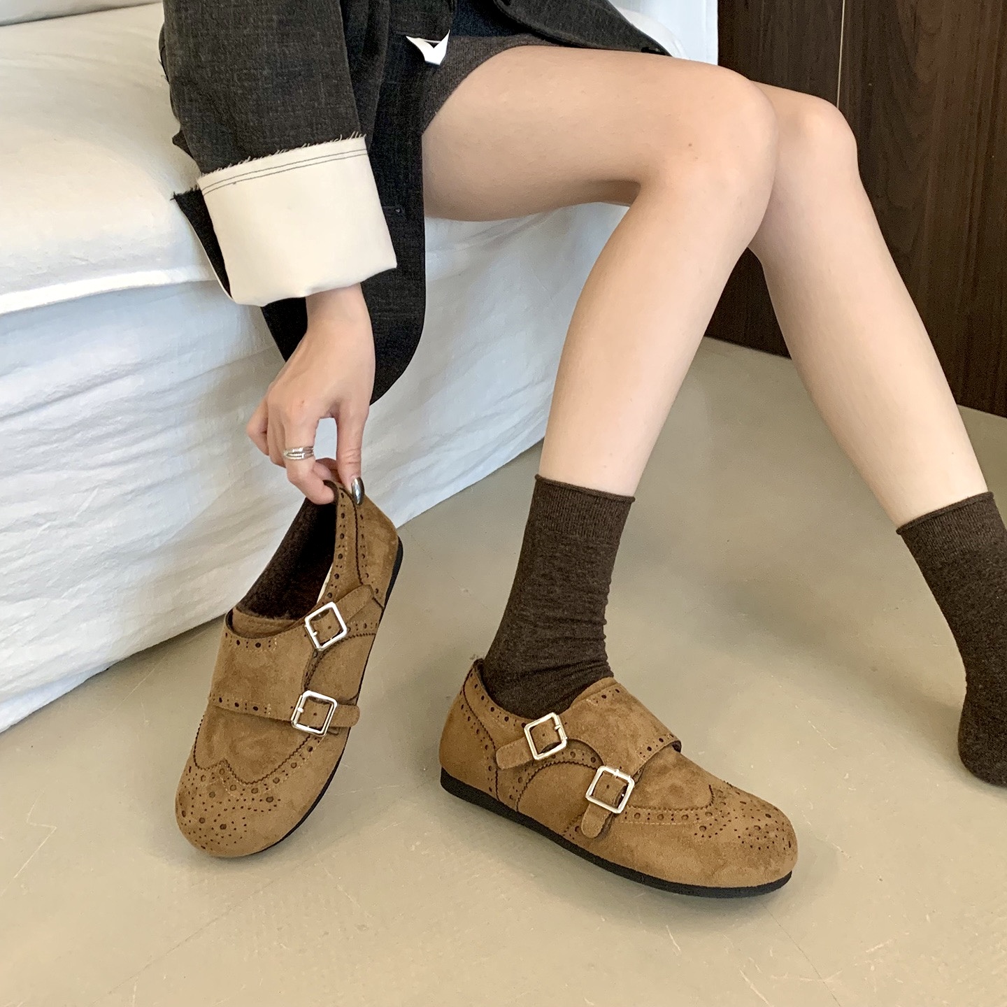 【ZUXIU 国风浮雕加绒皮鞋】三色可选,浮雕设计+皮扣搭配,复古国风设计,内里加绒+橡胶底,暖你一冬天~