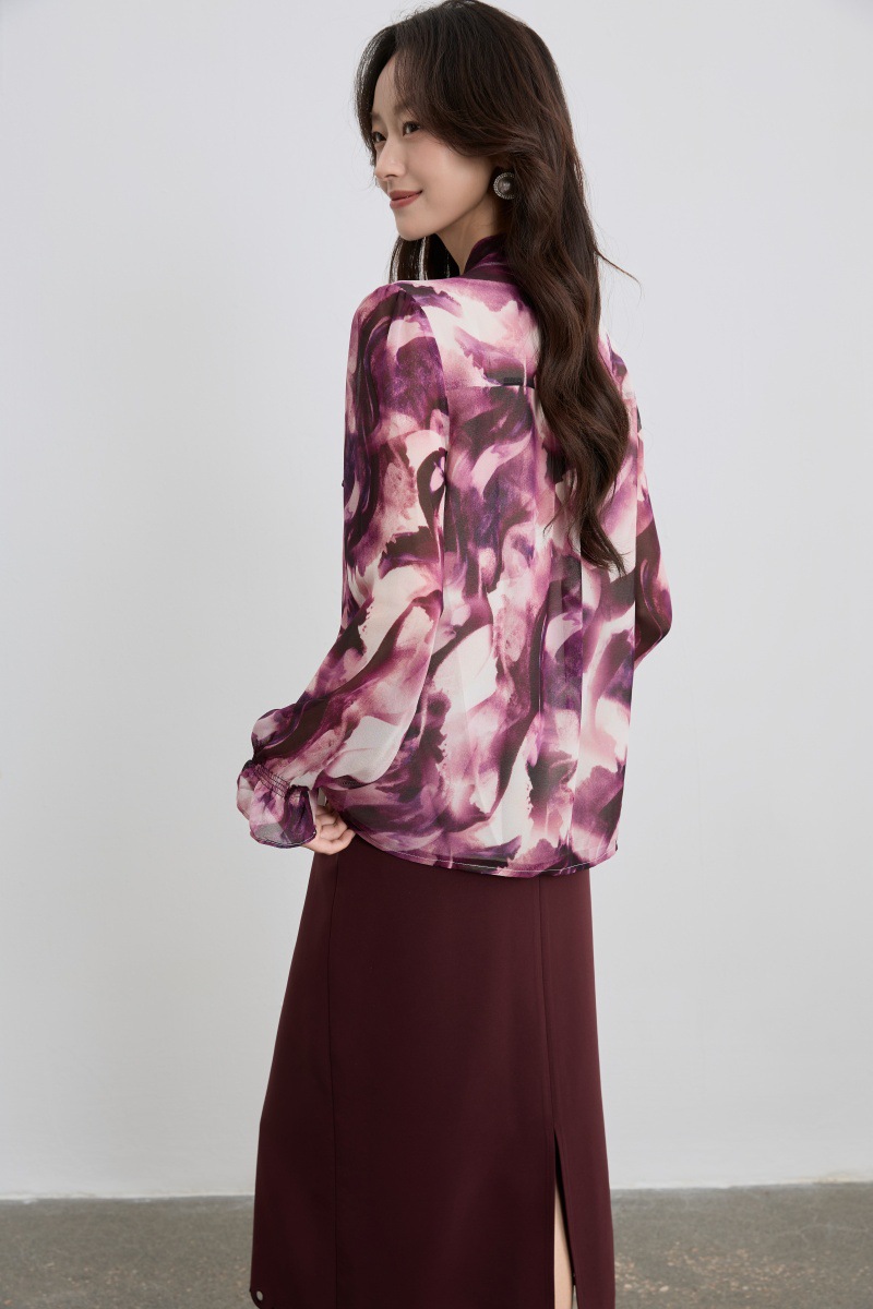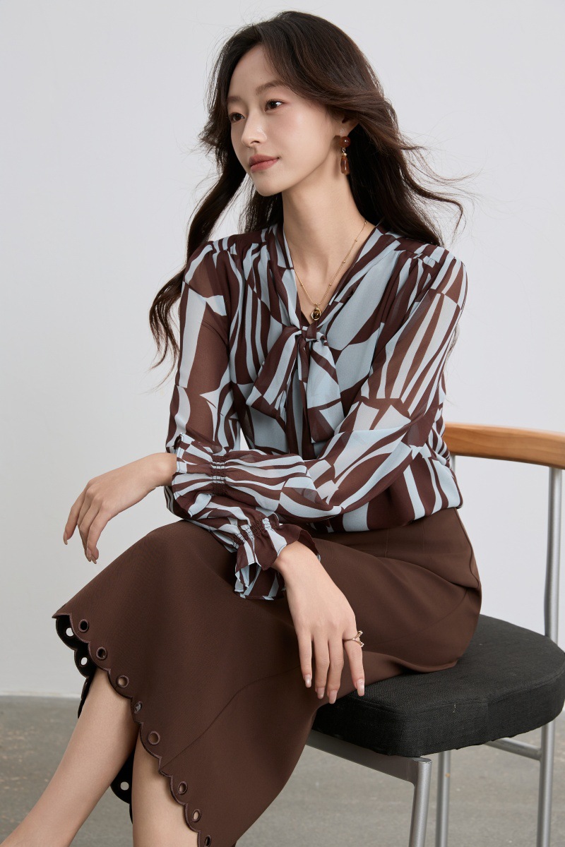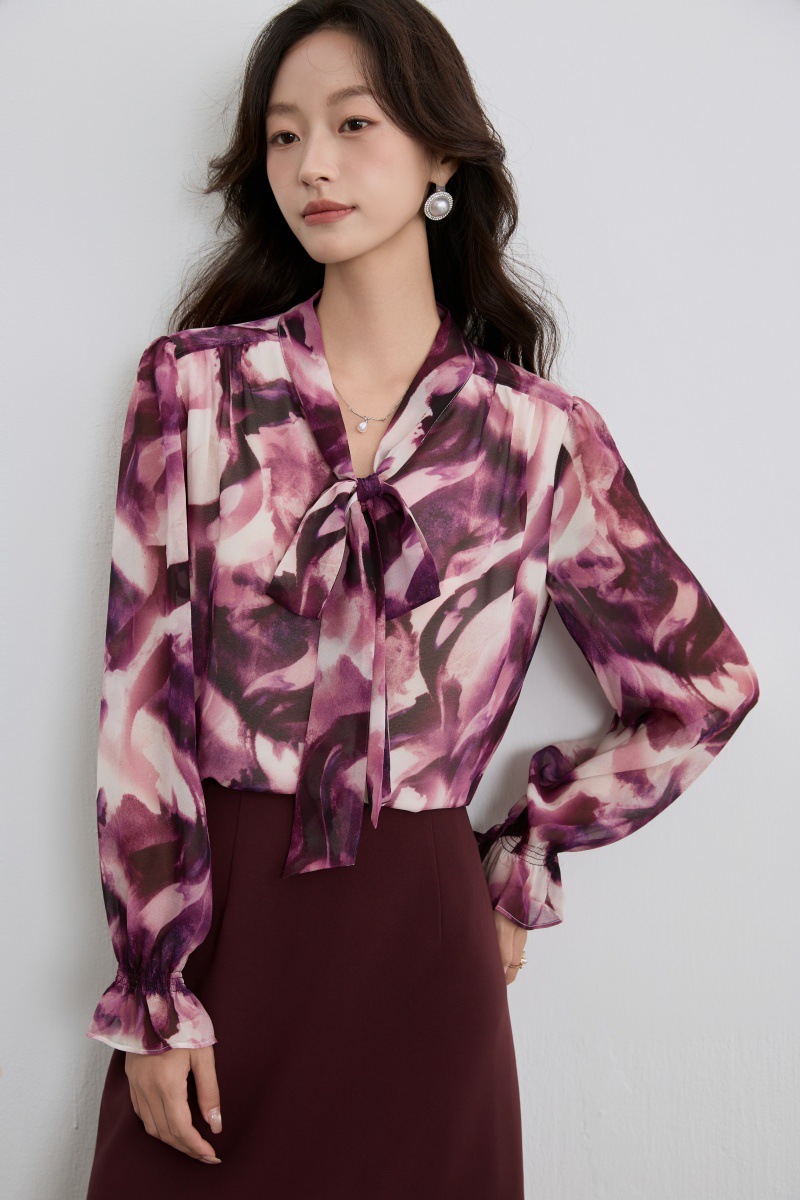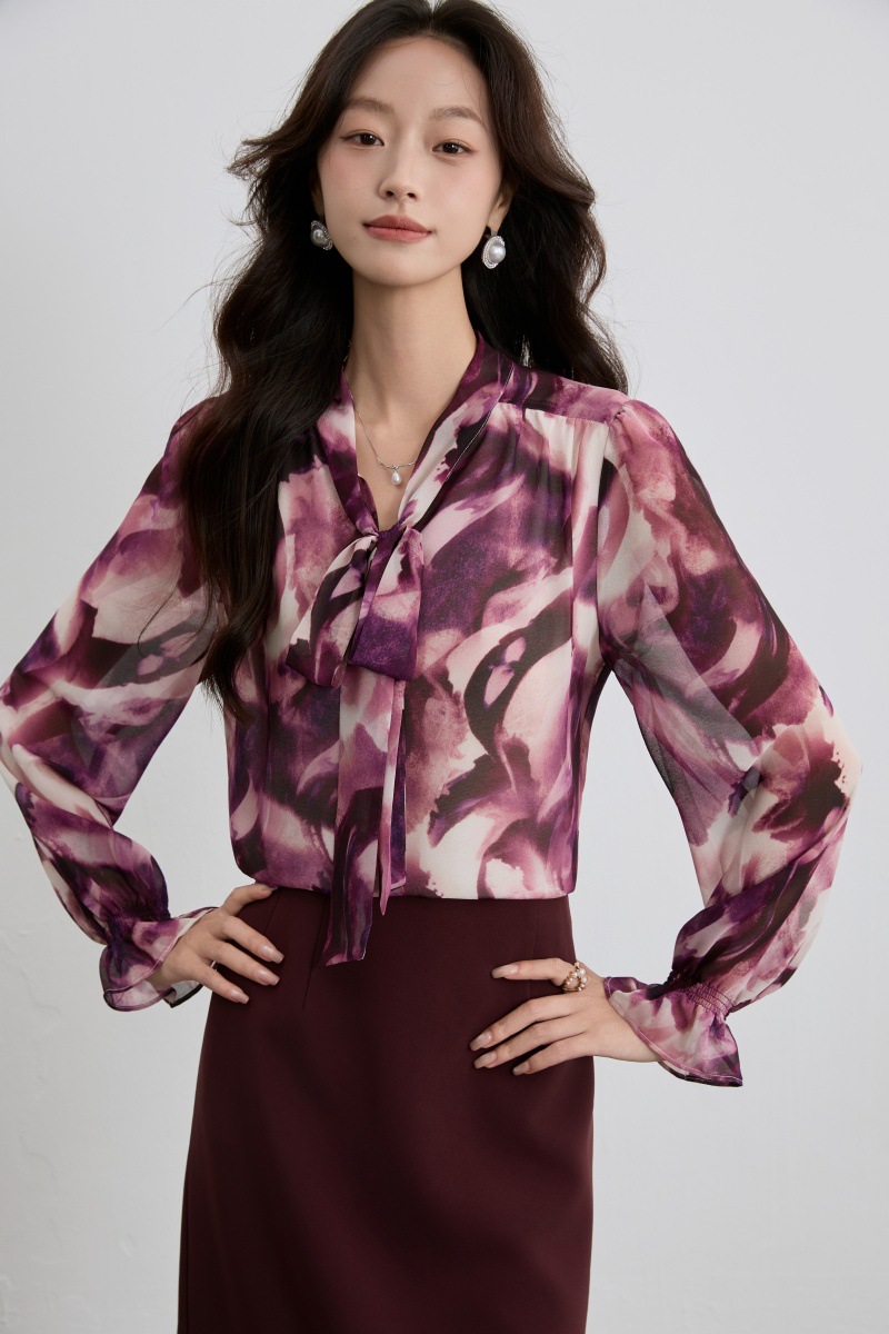「自」全新升级【铂金会员146/天猫199/差价53】(51338)洛诗琳法式时尚印花衬衫2025秋季新款百搭V领雪纺上衣女