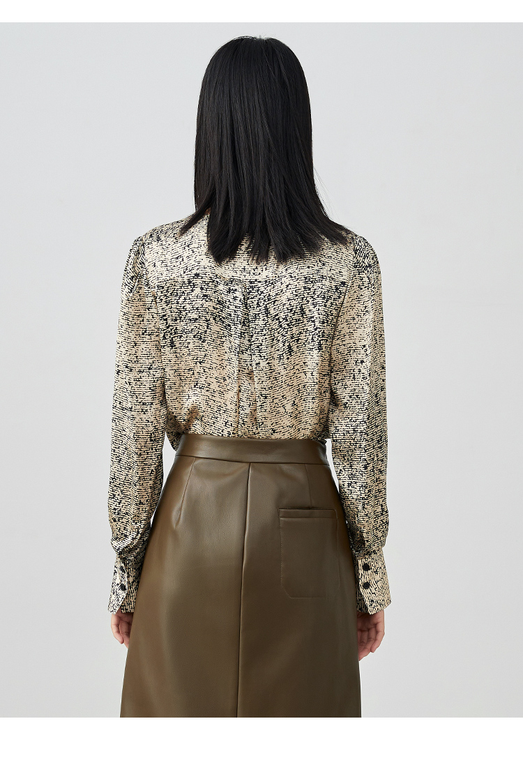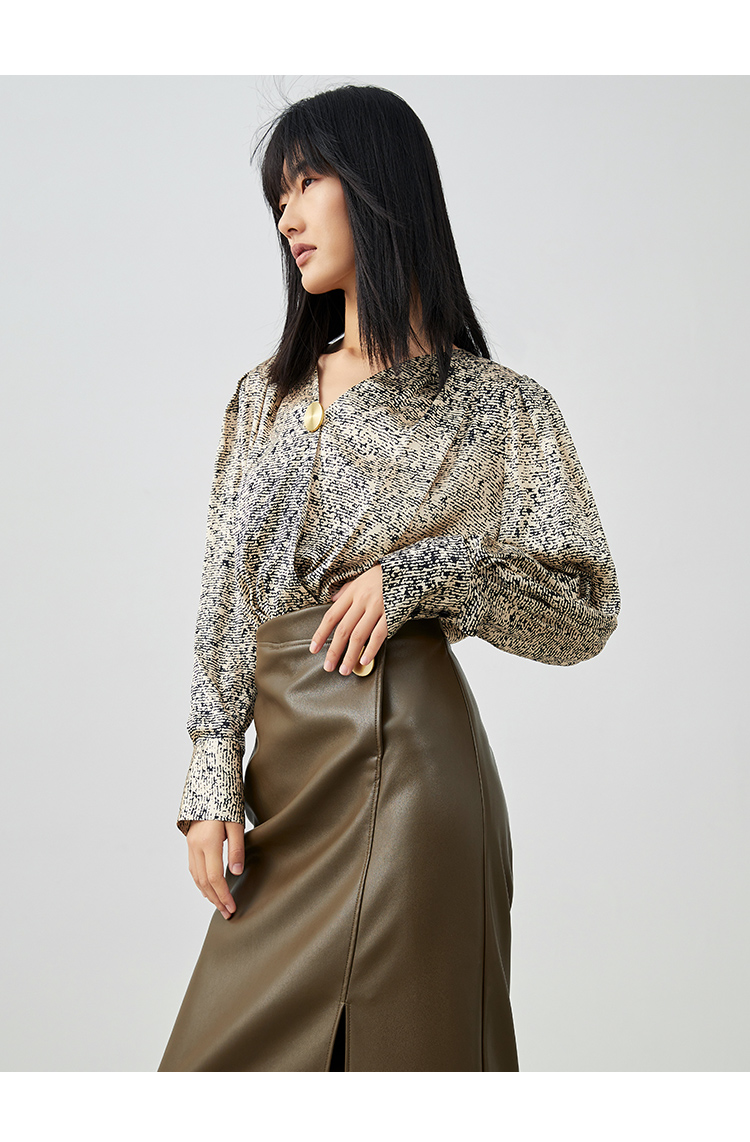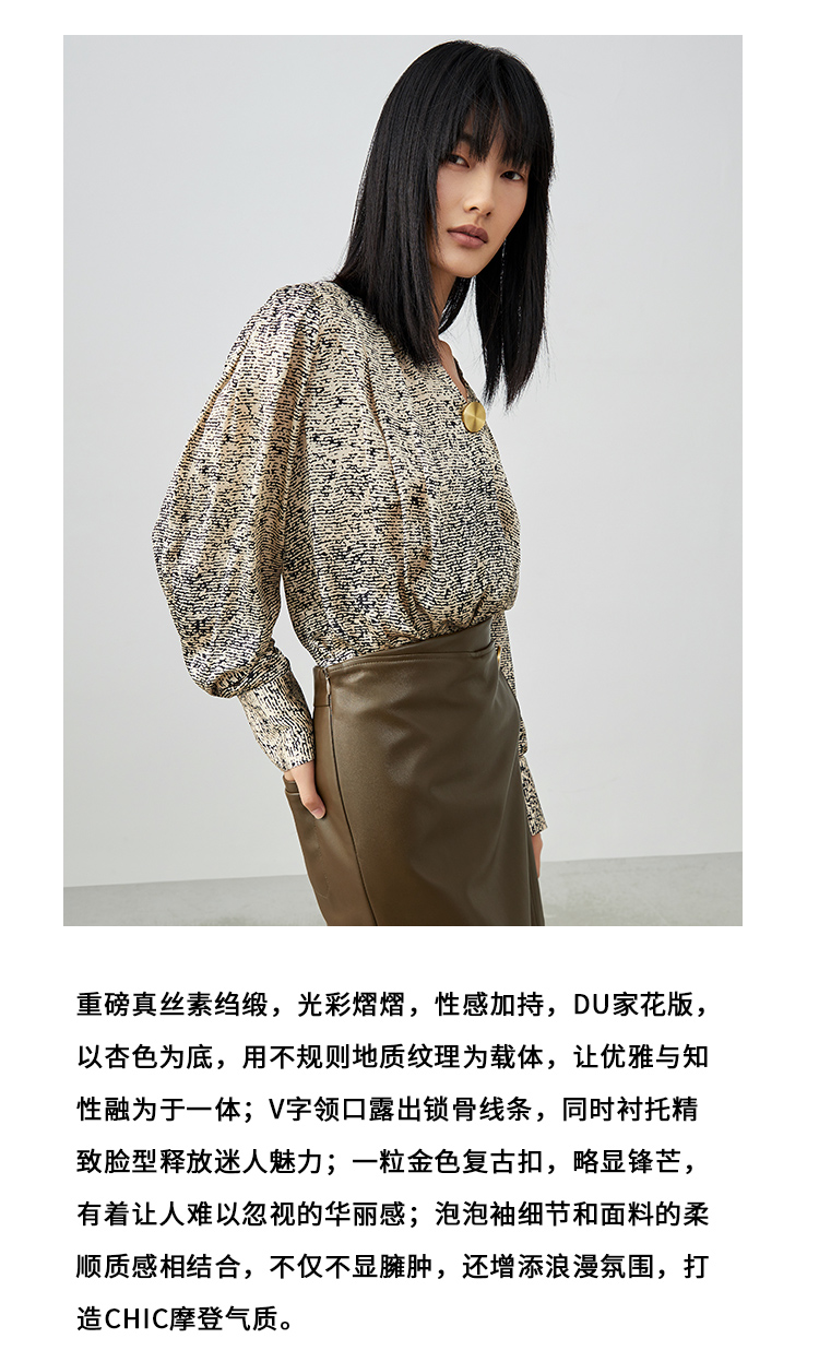 VIMAGE/纬漫纪春季新款100%桑蚕丝时尚印花V领显瘦泡泡袖小上衣女V1713303