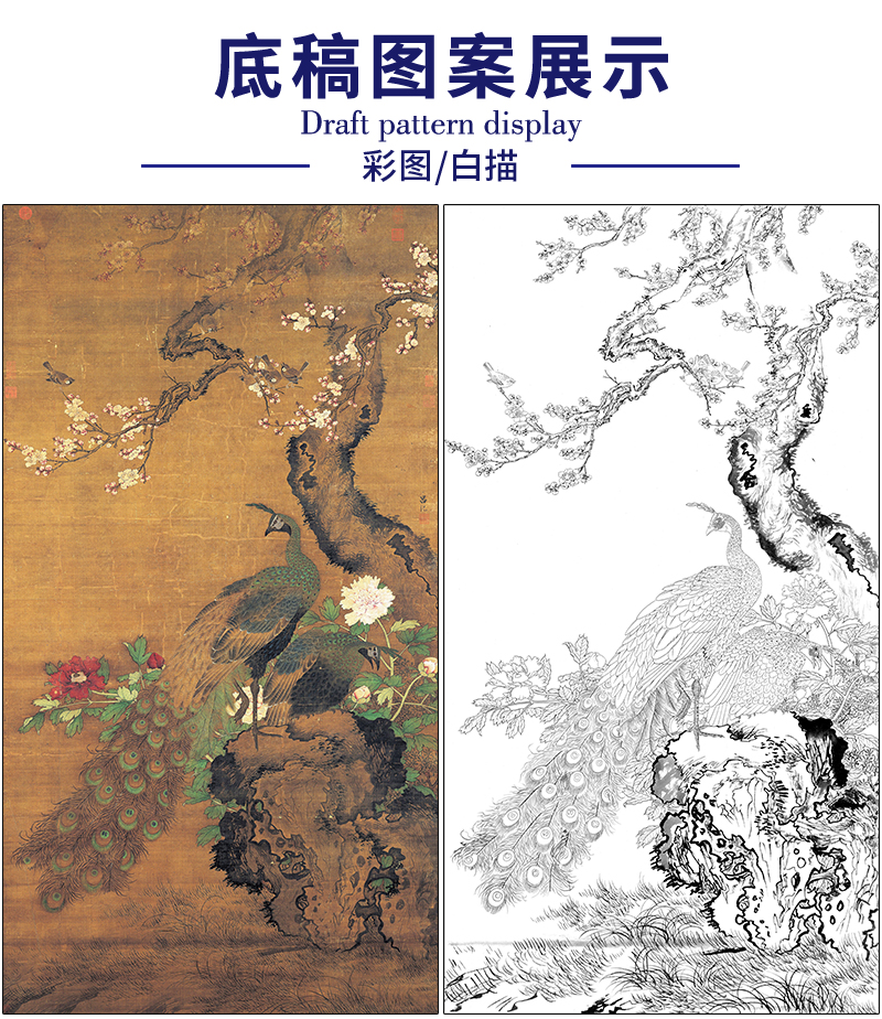 吕纪花鸟工笔画白描底稿《杏花孔雀图》临摹勾线高清打印稿MD15