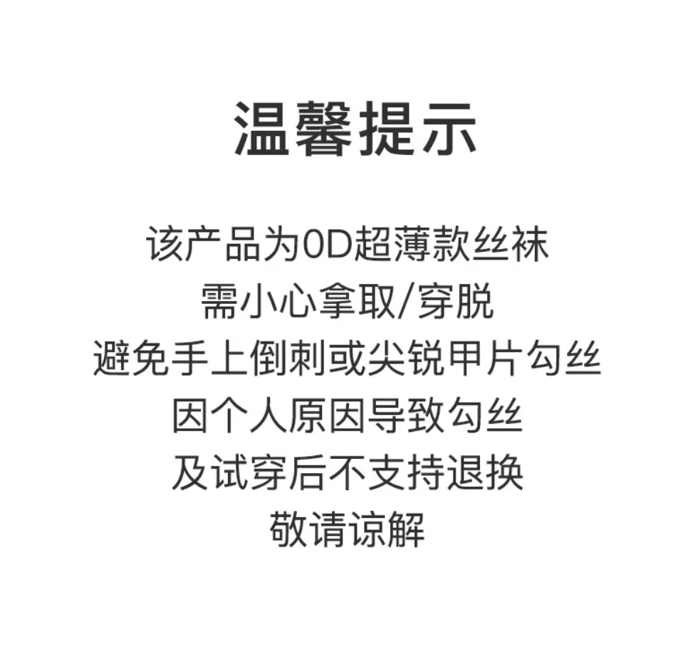 该产品为0D超薄丝袜,需小心穿脱,如手上有倒刺或尖锐甲片均可能导致勾丝,穿着后破损不属于产品质量问题,不予以退换。