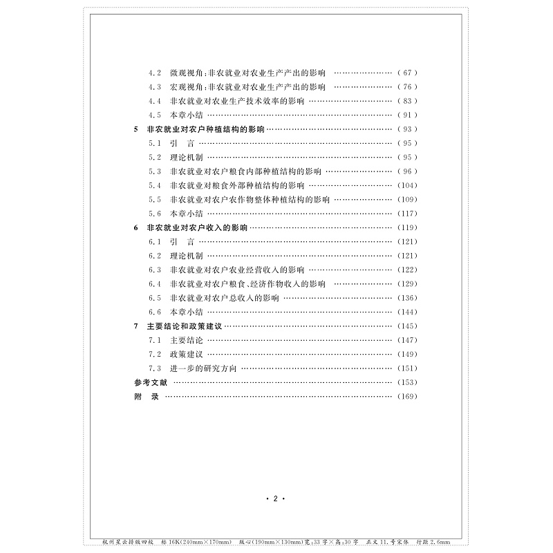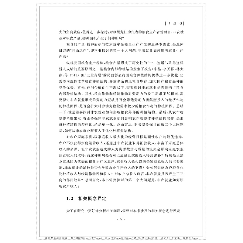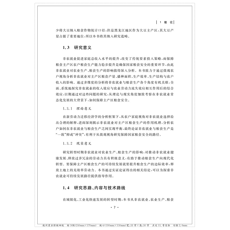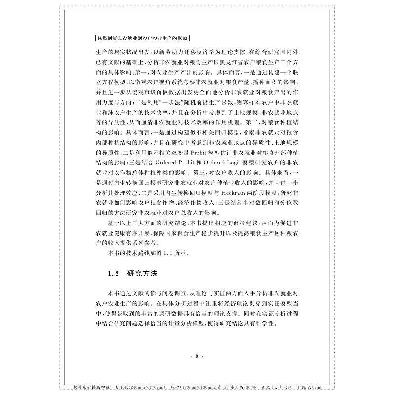 本书为作者的博士论文。本书是在城镇化、工业化快速发展的转型时期,从非农就业、粮食生产发展的现实状况出发,以新劳动力迁移经济学(NELM)为理论支撑,在综合研究国内外已有文献的基础上,分析非农就业对于粮食主产区黑龙江省农户粮食生产的影响。本书致力于通过微观农户视角分析非农就业对于主产区粮食产量、播种面积、生产效率、生产结构与农户收入的影响。通过多维度的分析将非农就业与粮食生产各个角度有机关联,全面、系统地探究非农就业的收入效应与农业劳动力流失效应相互作用后的综合效应。以期通过对这些问题的研究,从理论与现实角度考察在非农就业的常态化发展的大背景下,如何保障主产区粮食安全。