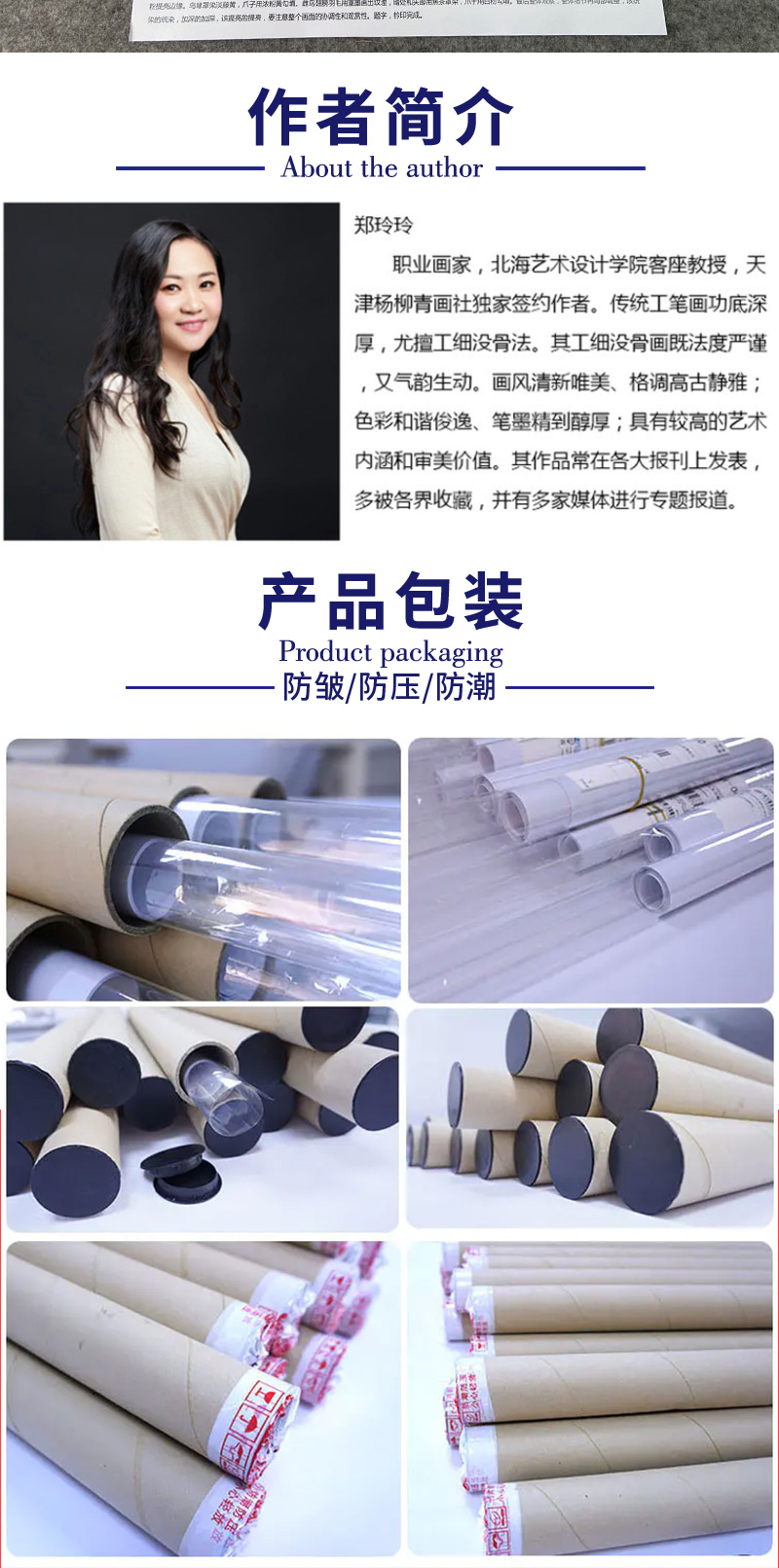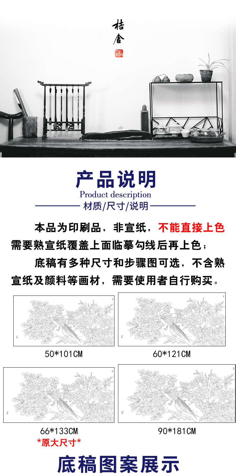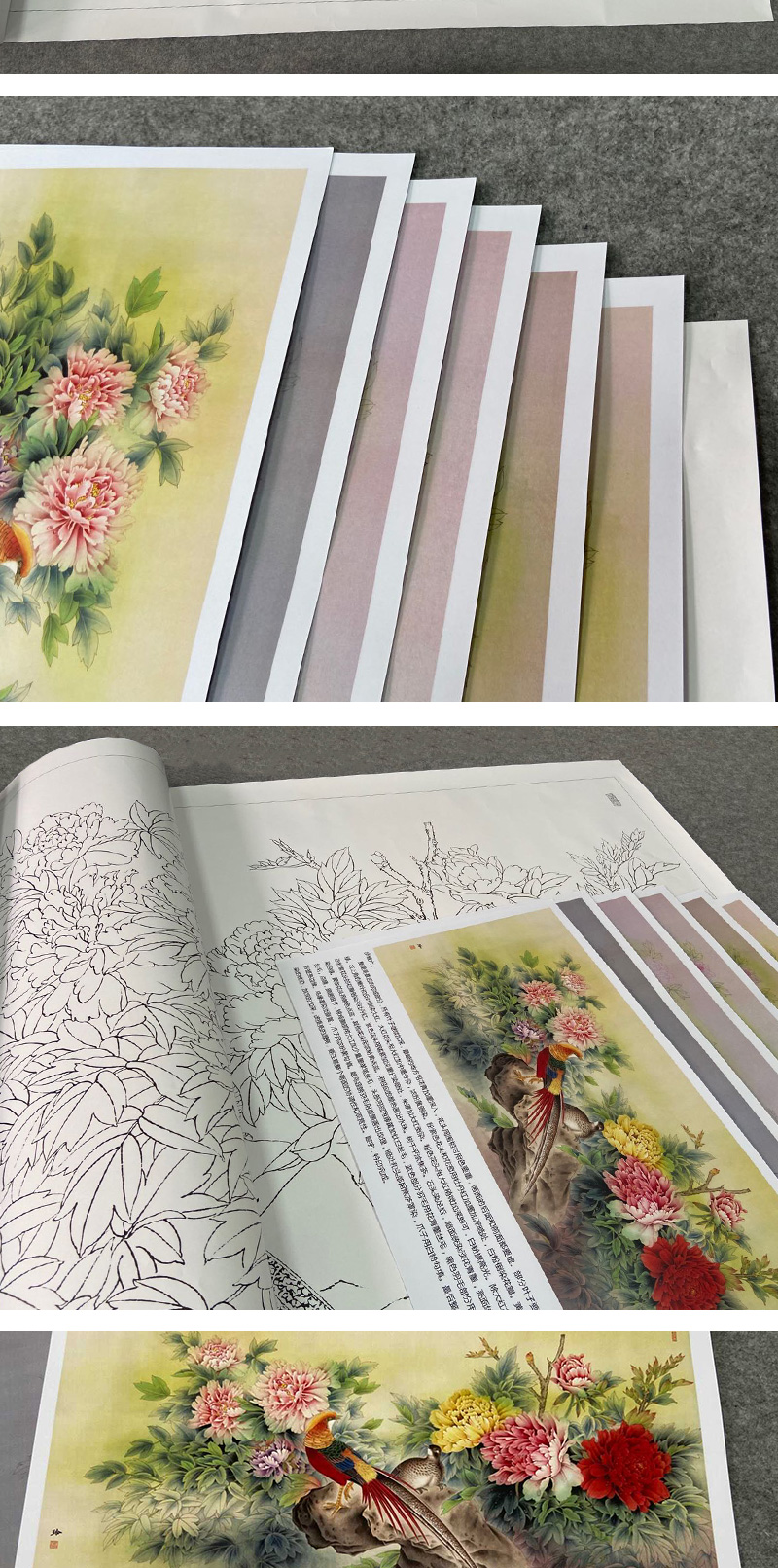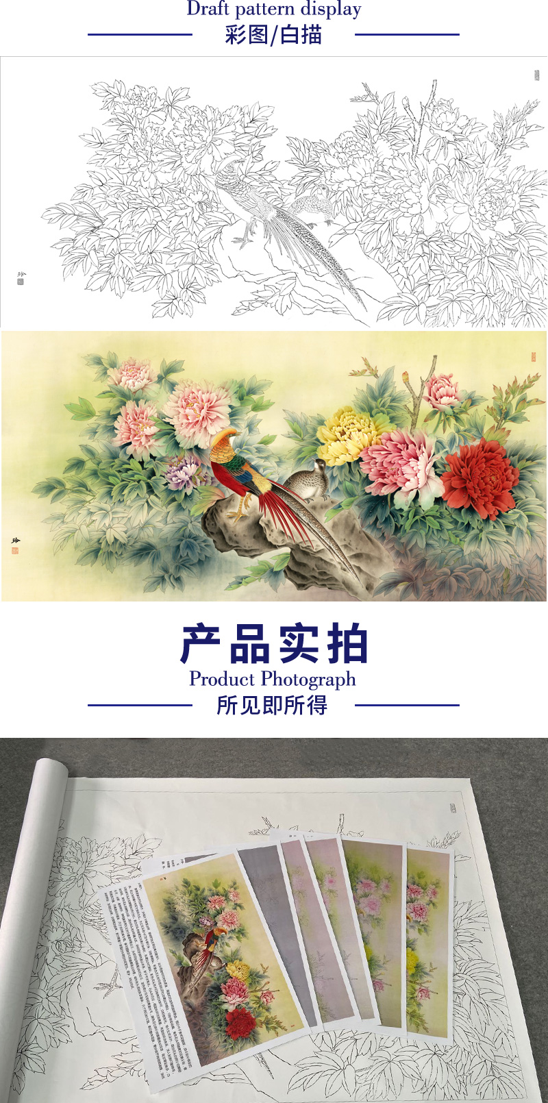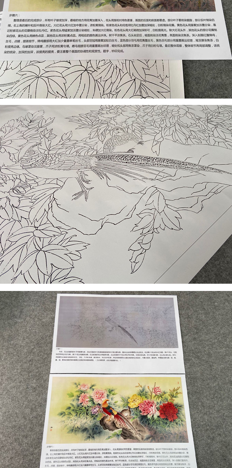【有步骤、大彩图】郑玲玲横幅工笔画白描底稿《祥辉锦羽图》锦鸡初学者临摹花鸟线稿ZL96