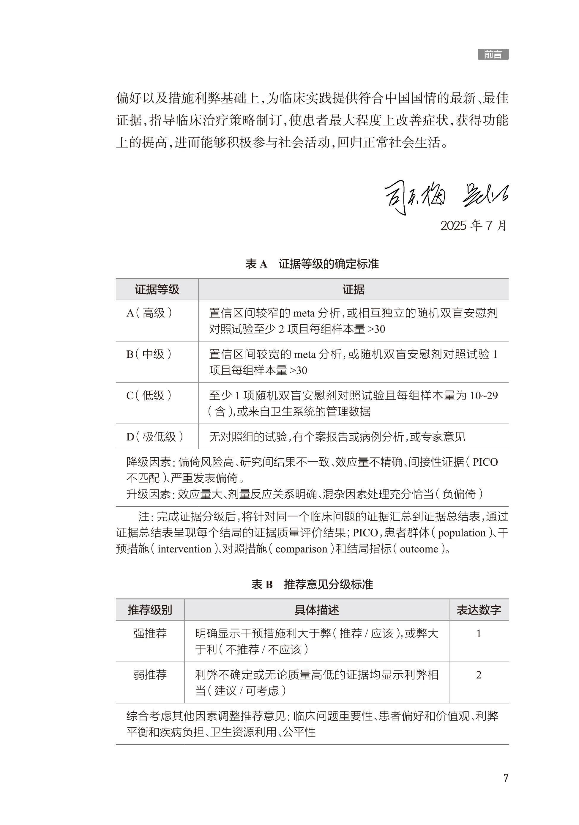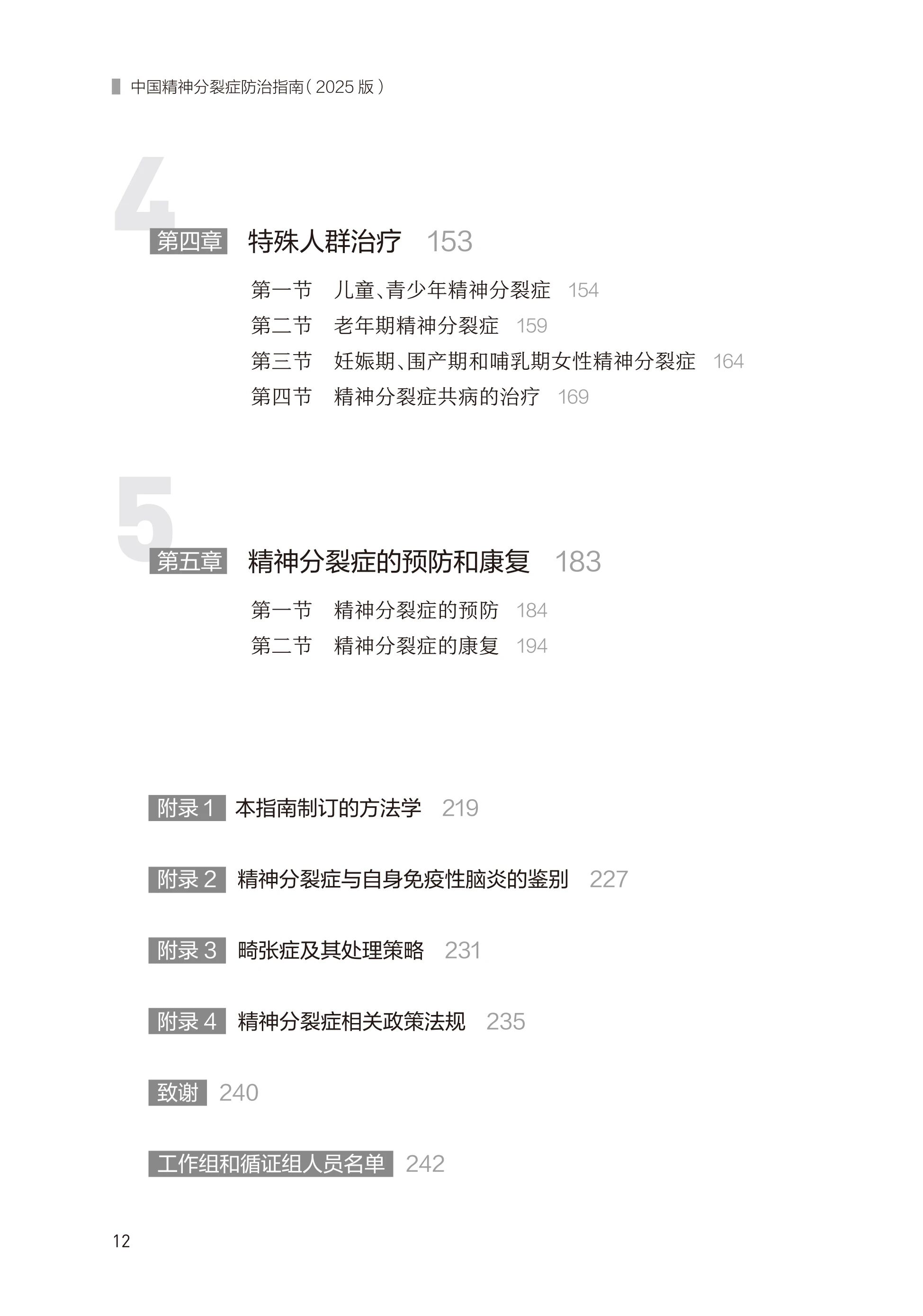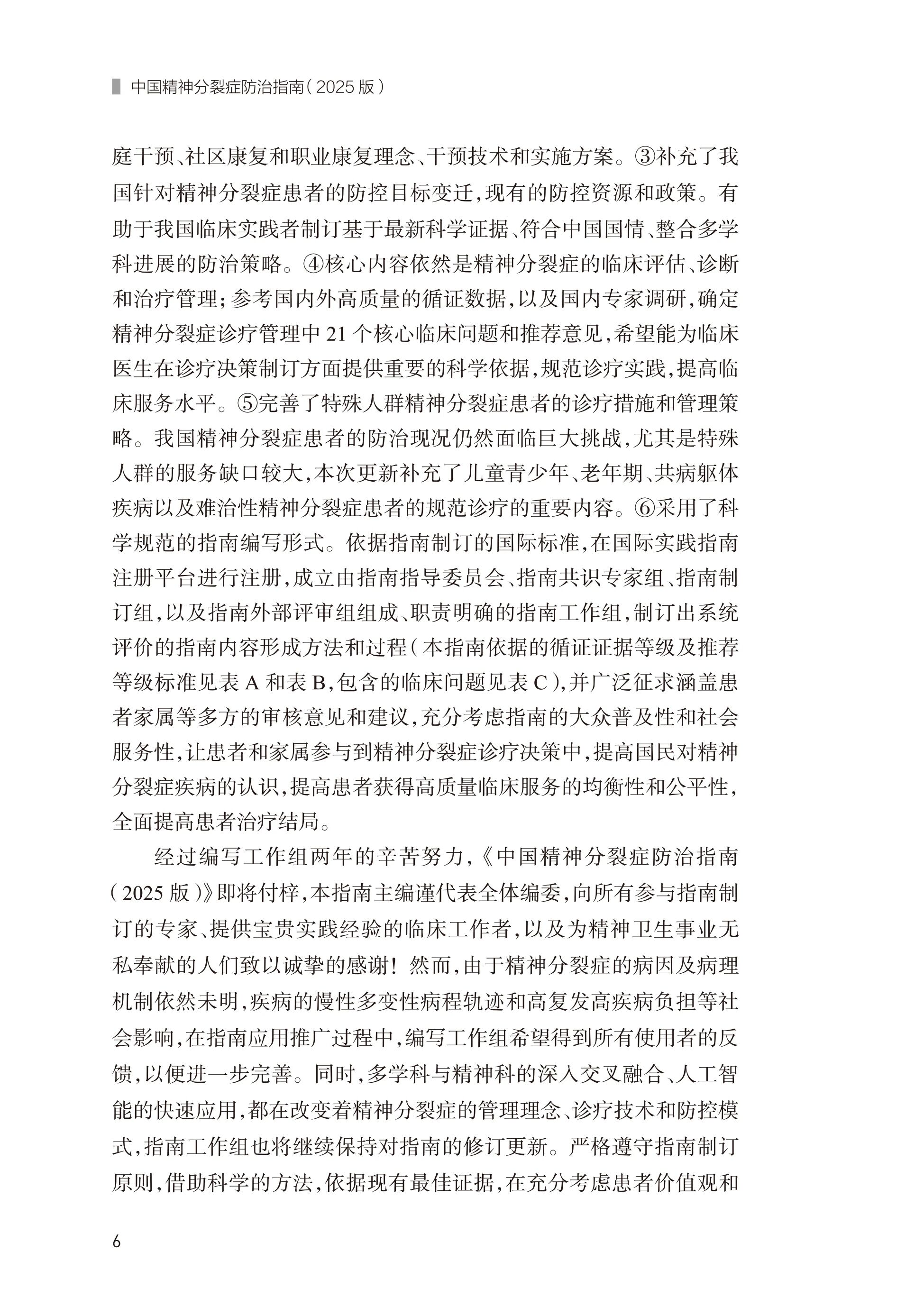 《中国精神分裂症防治指南(2025版)》秉持传承与创新的理念,严格遵照WHO《指南制订手册(2014年)》和中华医学会《中国制订/修订临床诊疗指南的指导原则(2022版)》构建方法学体系。指南制订工作组由指南指导委员会、指南共识专家组、指南秘书组、指南证据评价组以及指南外部评审组5个小组构成,凝练了精神分裂症临床评估、诊断、治疗、特殊人群精神分裂症患者的特征及干预、康复等方面的21个核心临床问题和推荐意见。相信这份凝聚共识、立足实践、面向未来的指南,将为我国精神分裂症的规范化诊疗提供有力支撑,惠及更多患者及其家庭!
