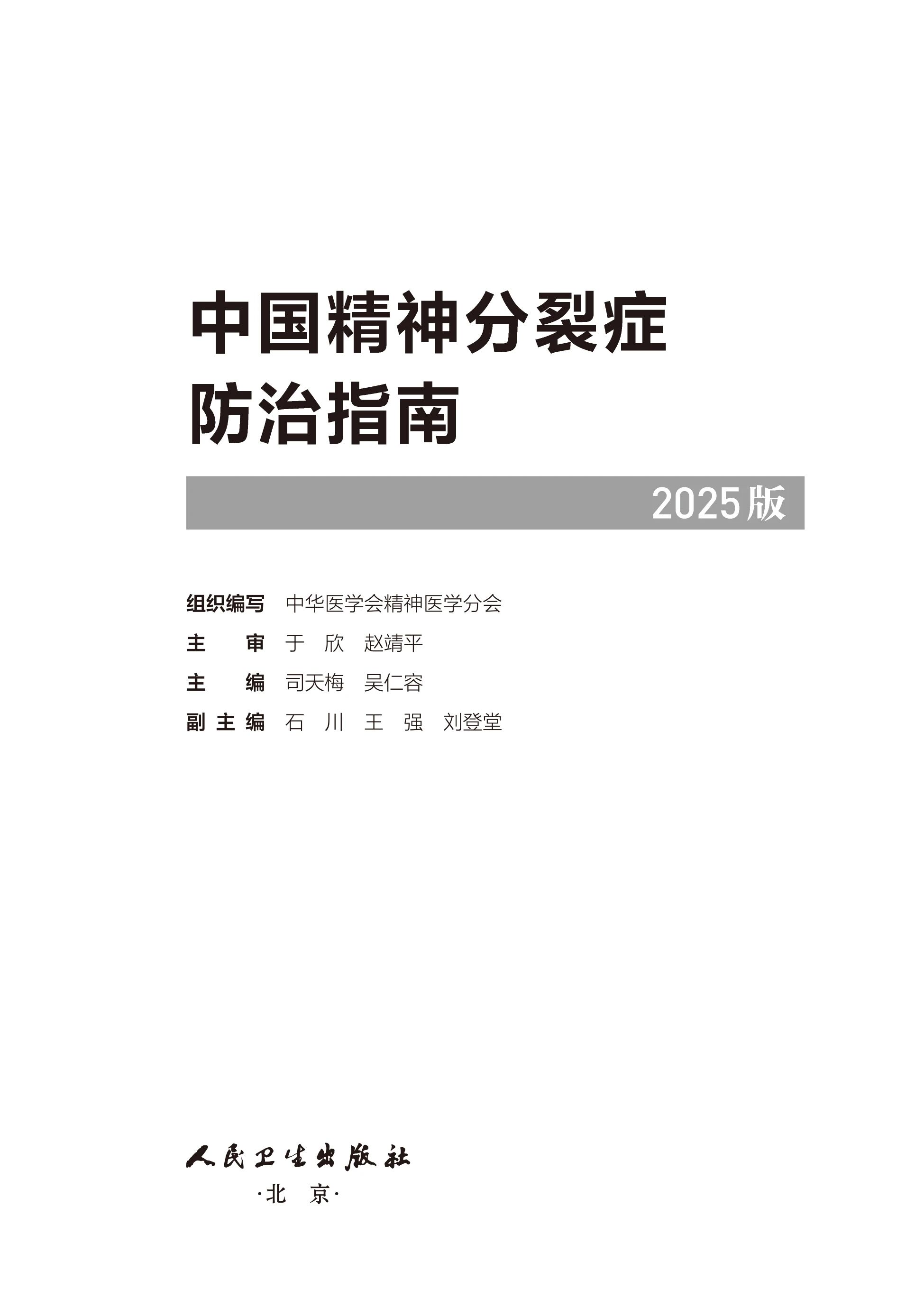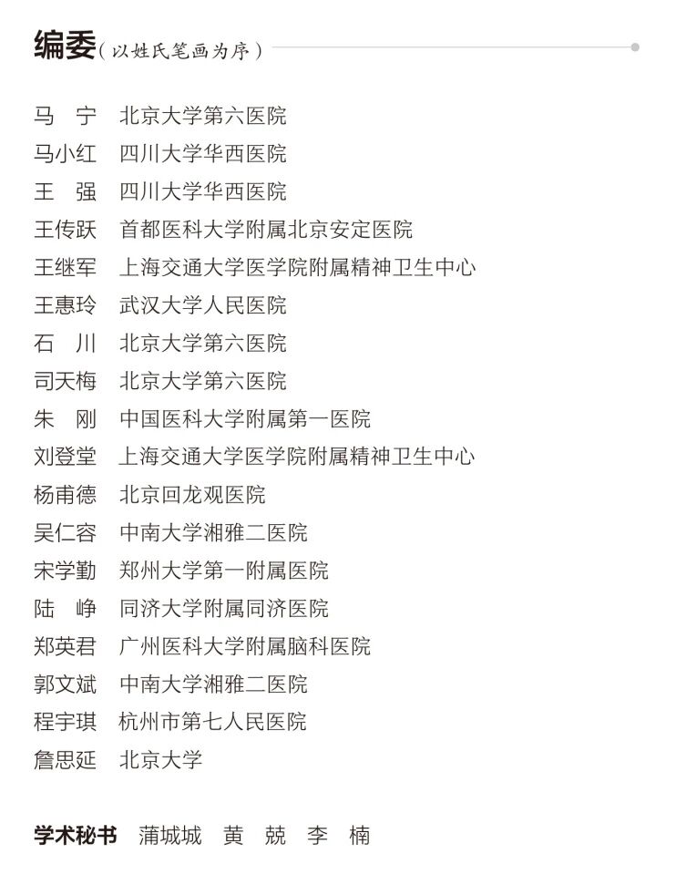 本指南由中华医学会精神医学分会组织编写,我国著名精神病学专家于欣、赵靖平担任主审,司天梅、吴仁容教授主编,18名编写专家组成员亲自执笔,外审专家组严谨评审,凝聚了跨学科团队集体的智慧。
