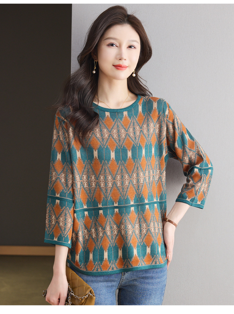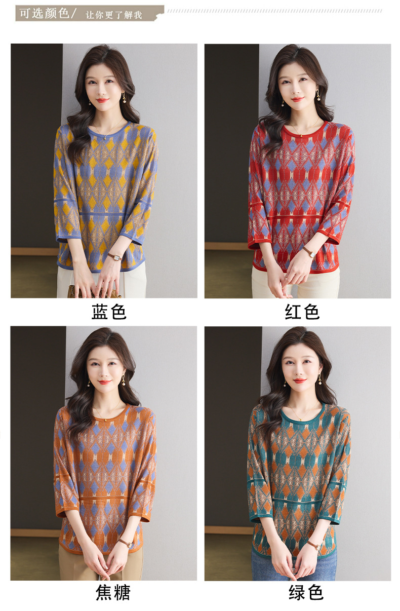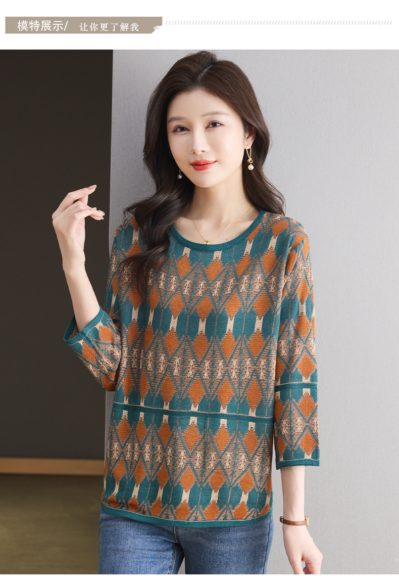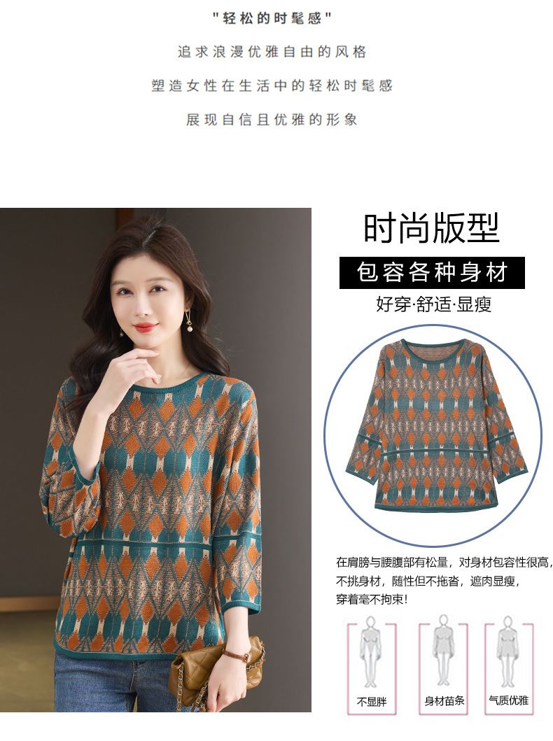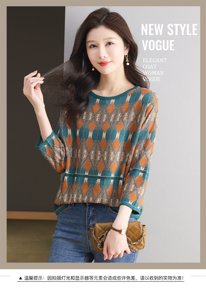 CC-LL-1635七分袖针织衫女士2025春秋季新款圆领大码上衣提花宽松打底衫T恤