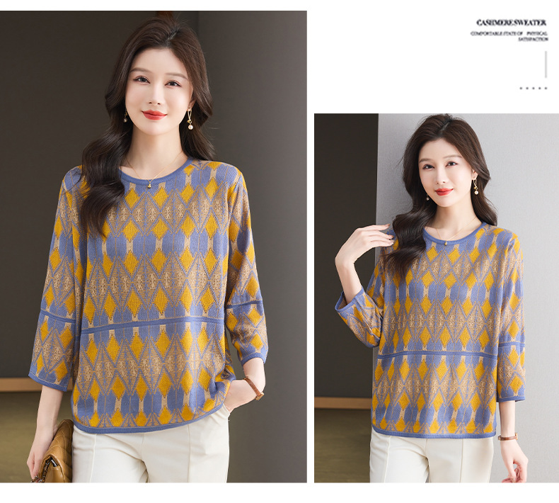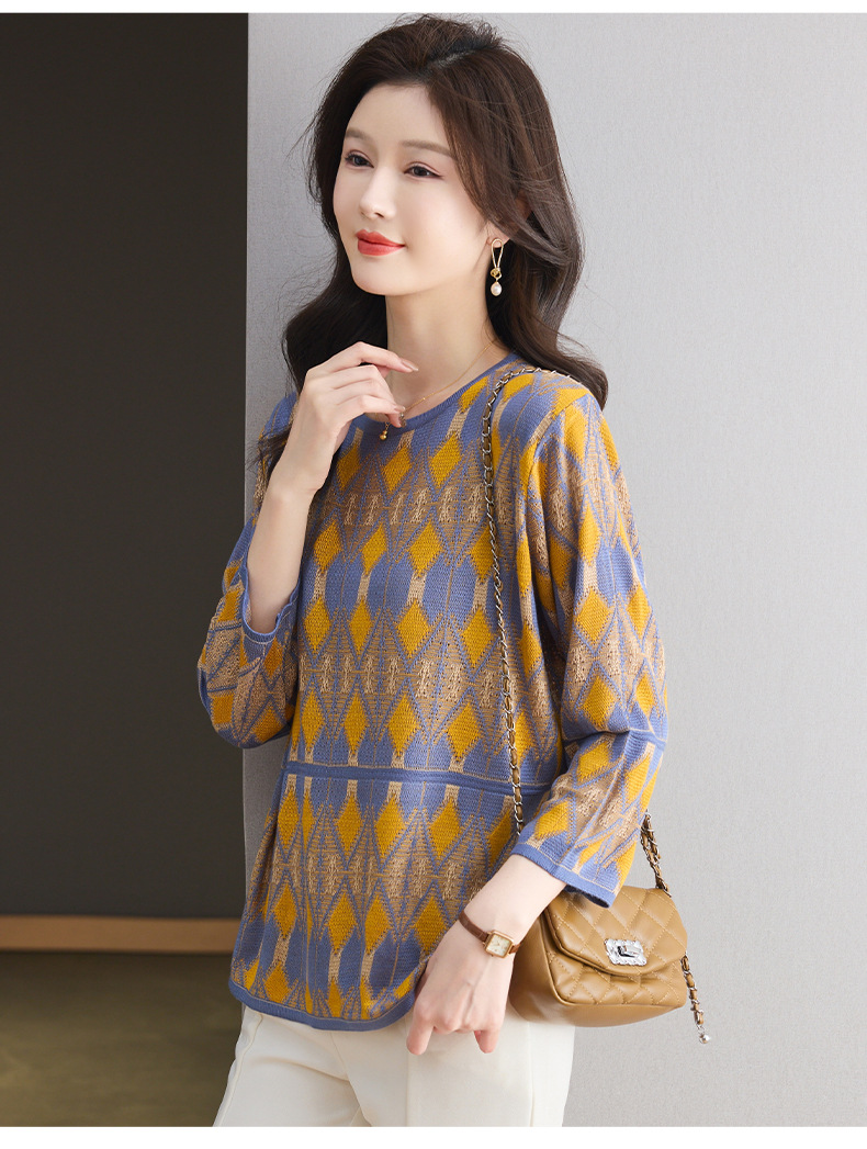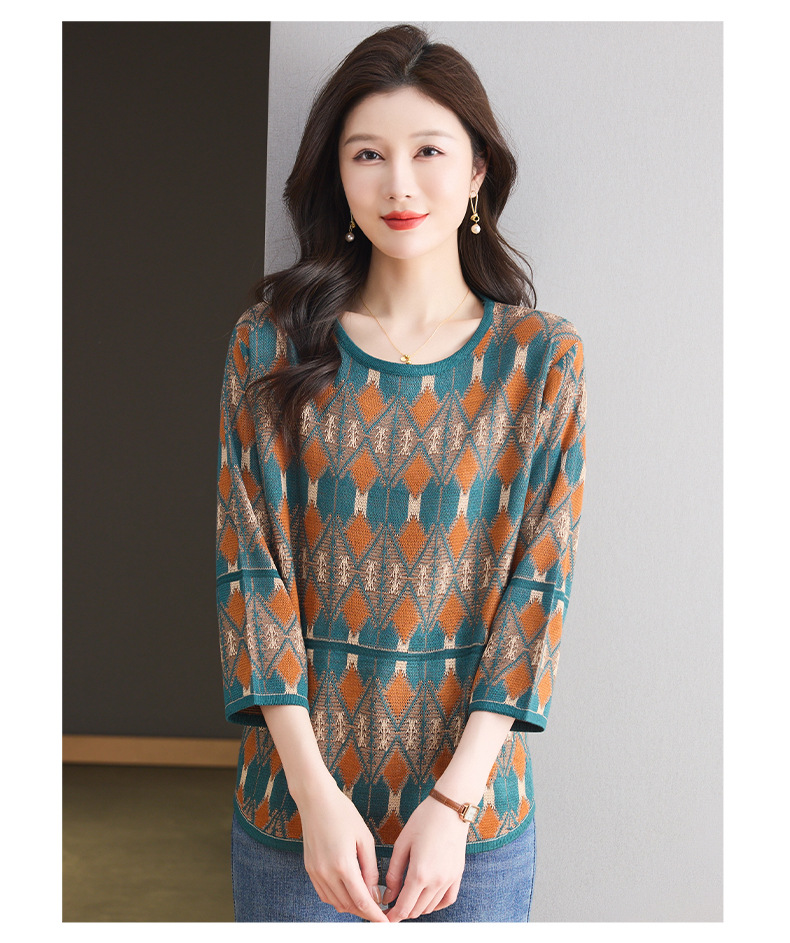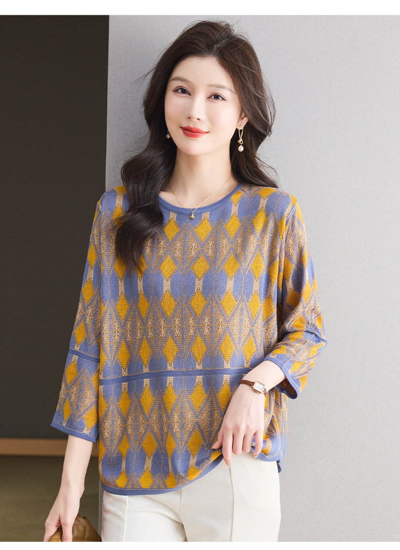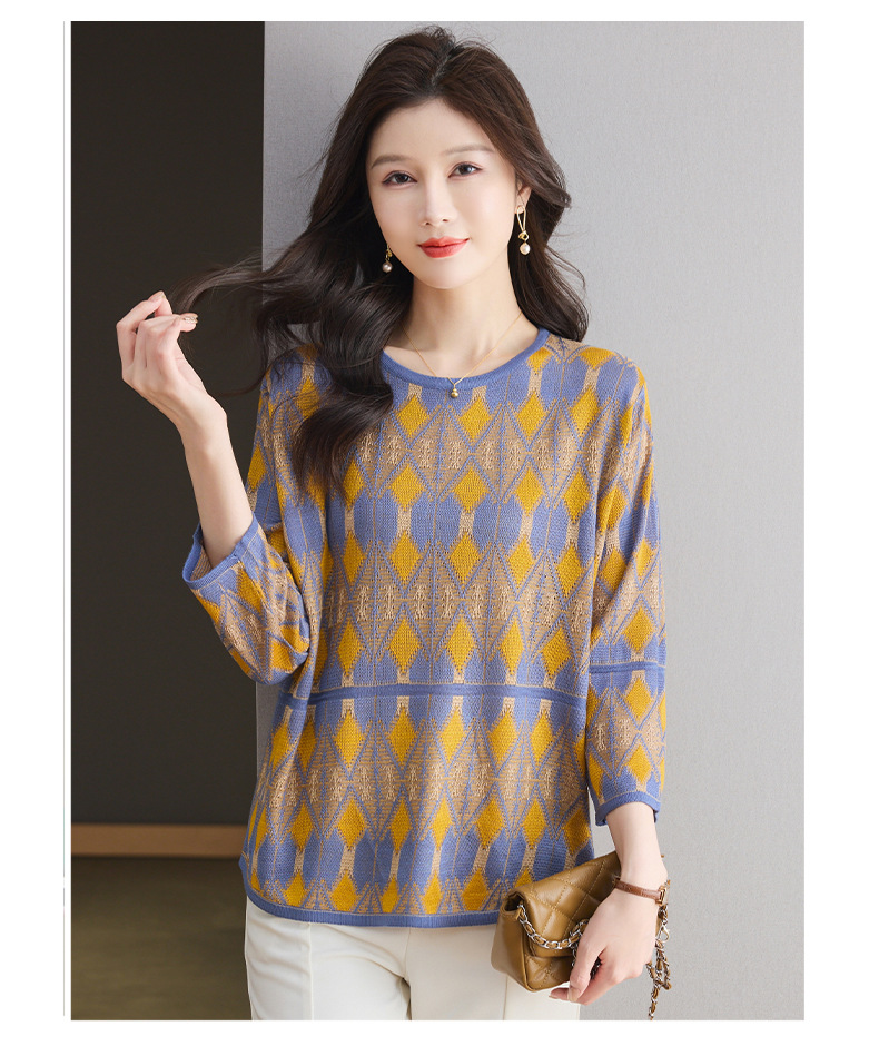 CC-LL-1635七分袖针织衫女士2025春秋季新款圆领大码上衣提花宽松打底衫T恤