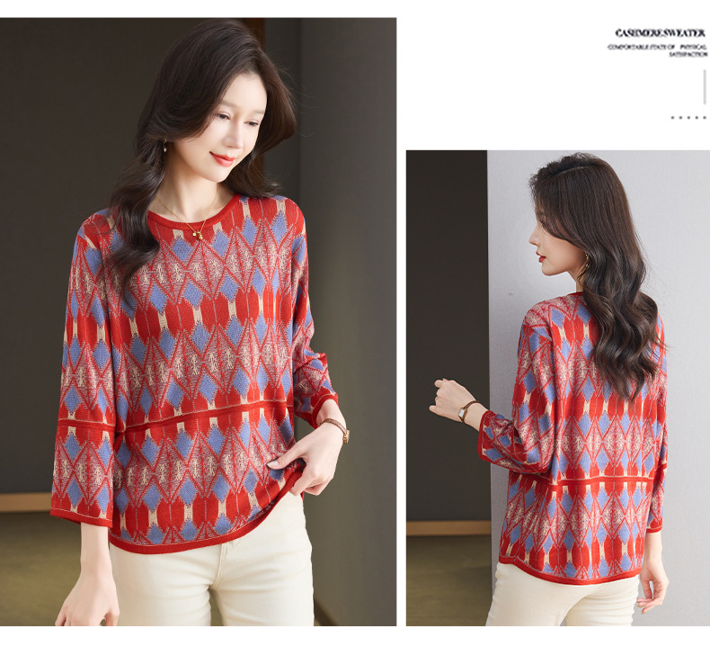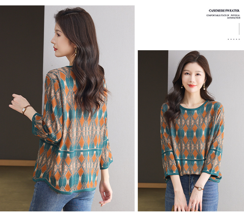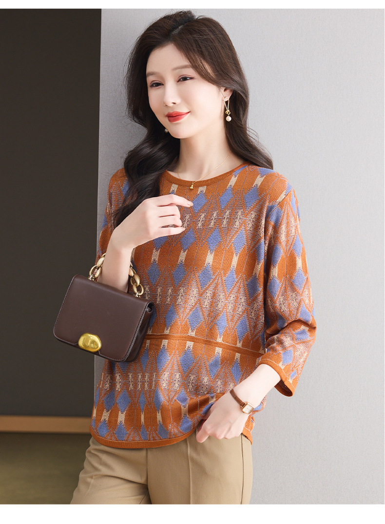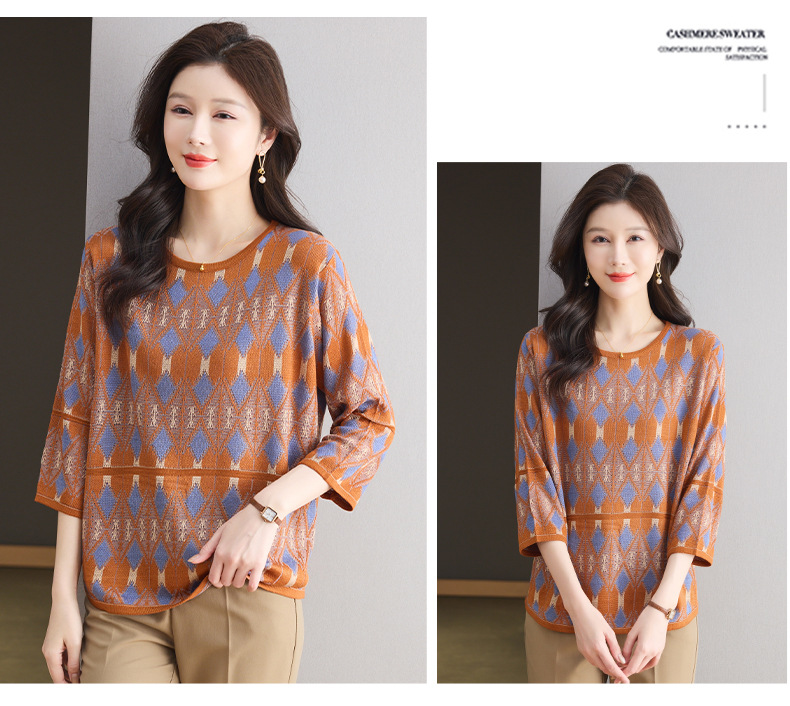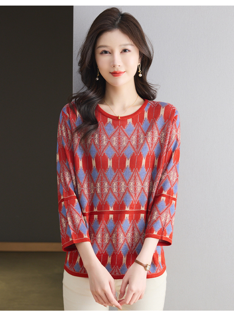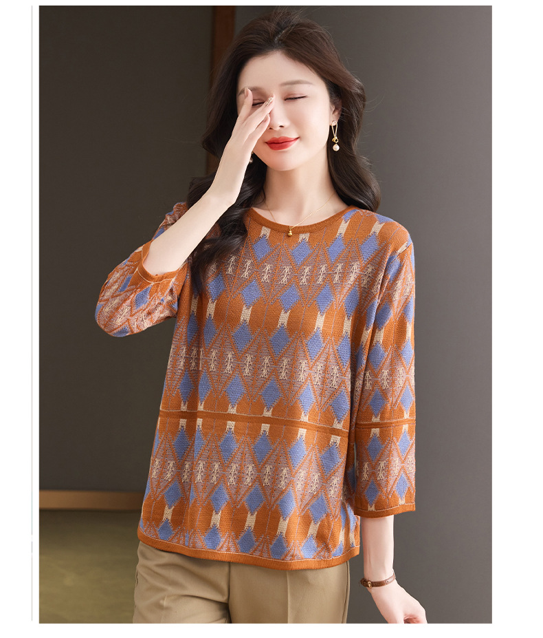 CC-LL-1635七分袖针织衫女士2025春秋季新款圆领大码上衣提花宽松打底衫T恤