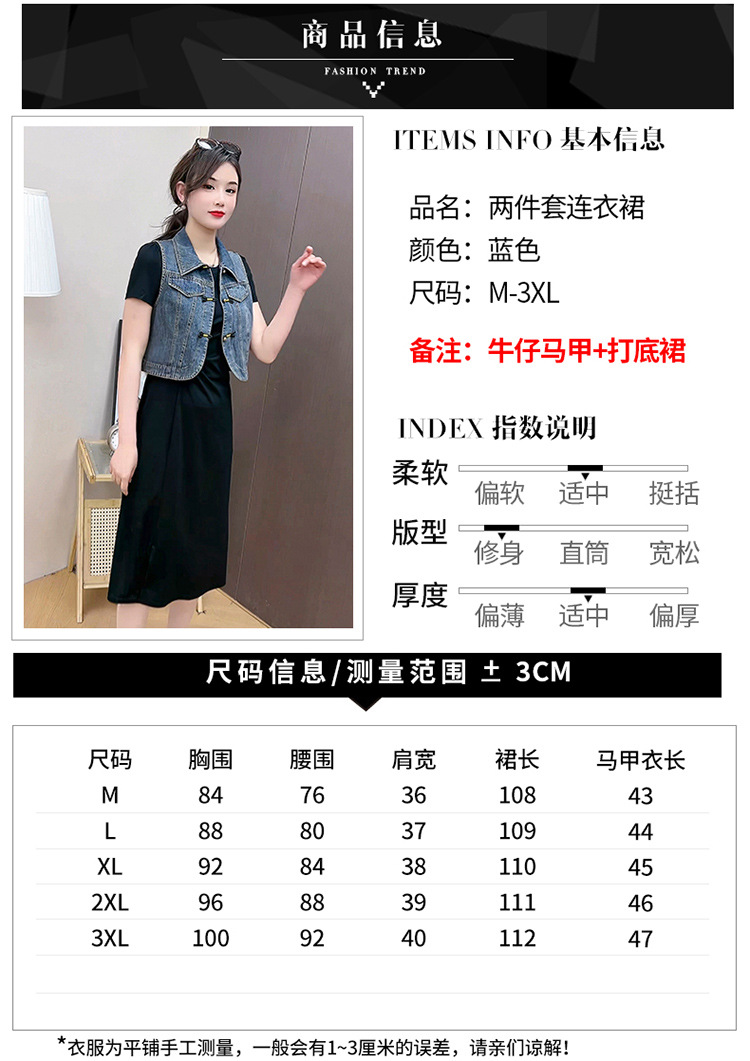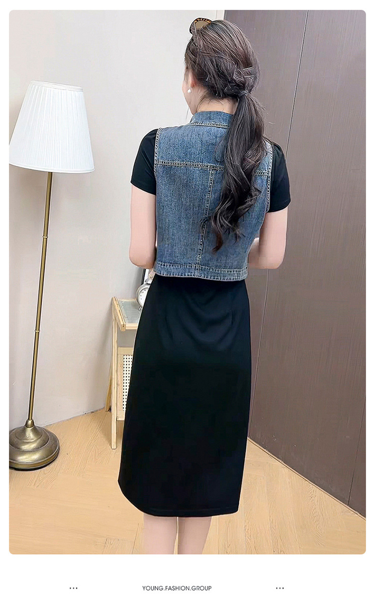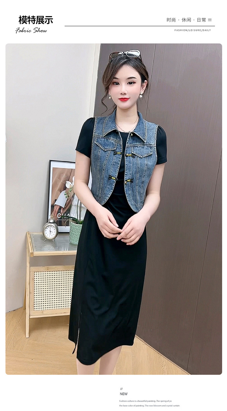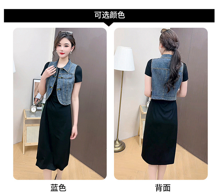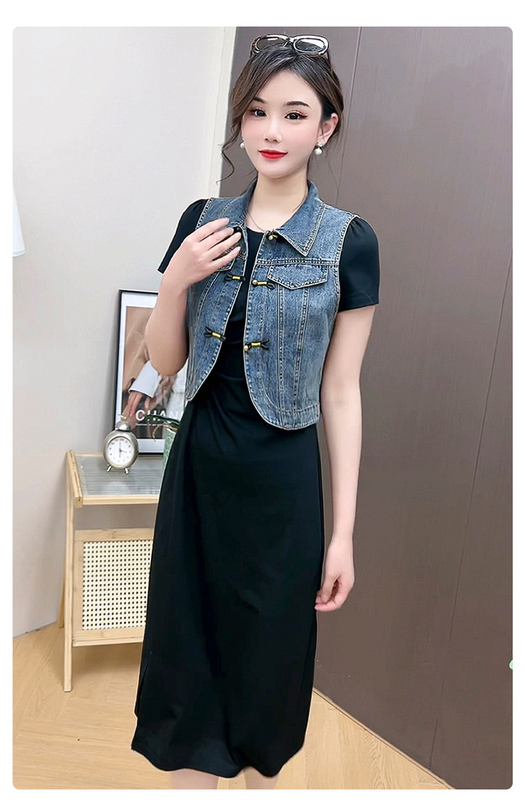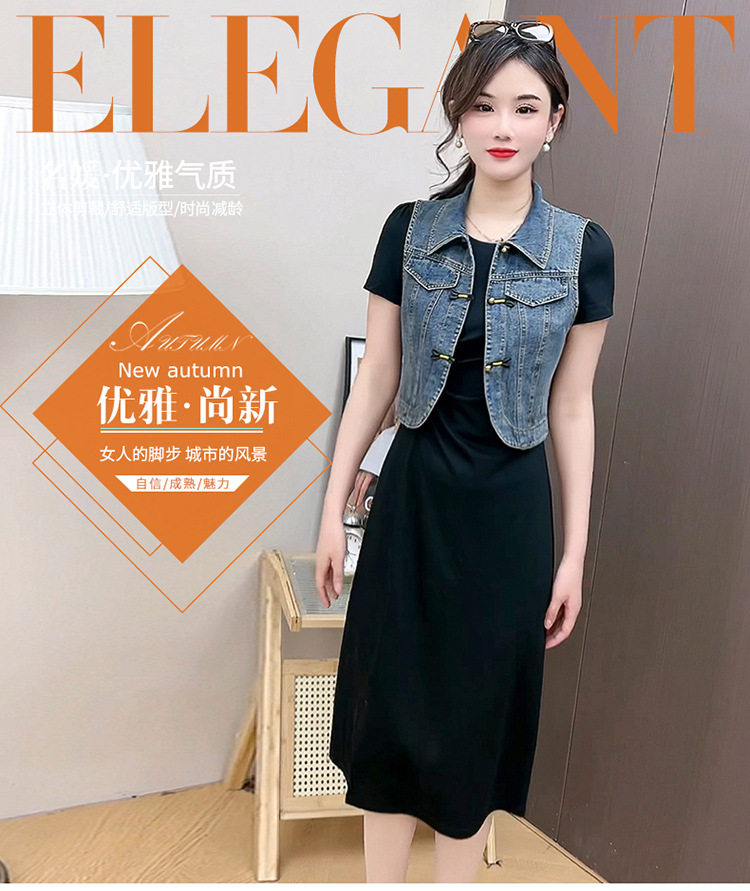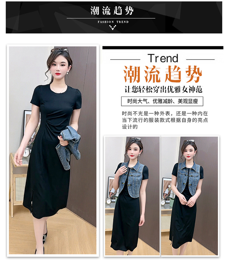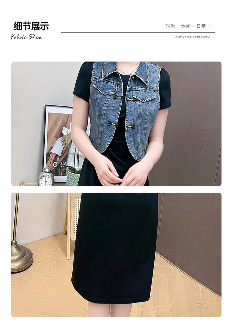 时尚内搭显瘦黑色短袖连衣裙,洋气牛仔马甲两件套QYM-YJ-24MD26-L