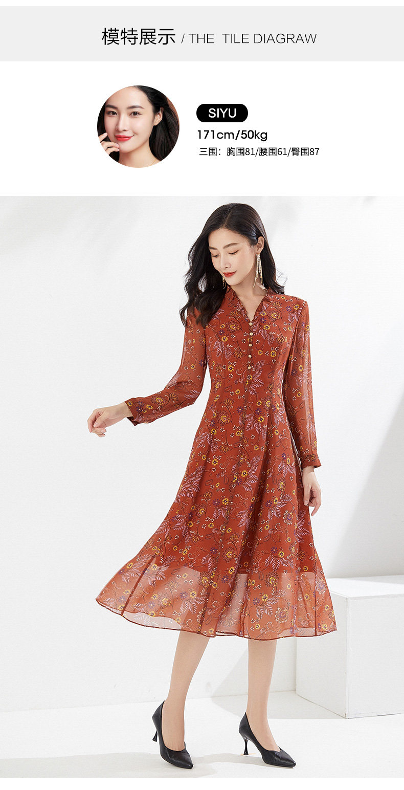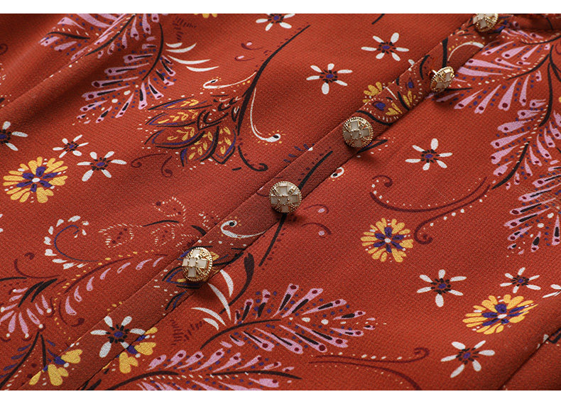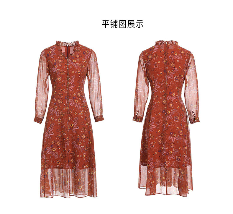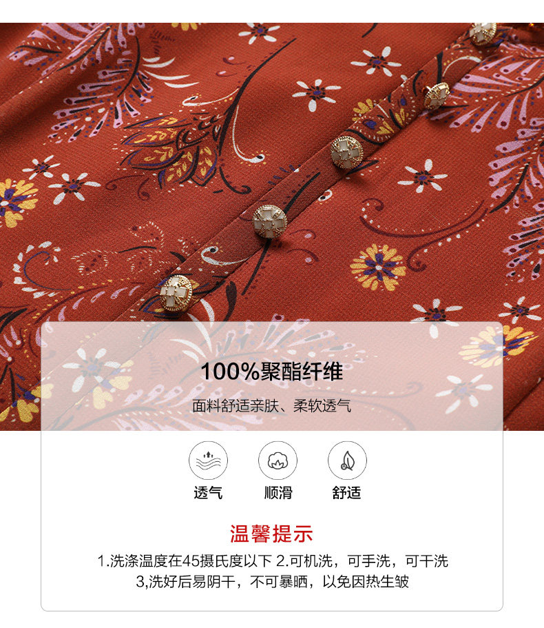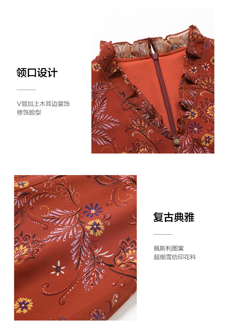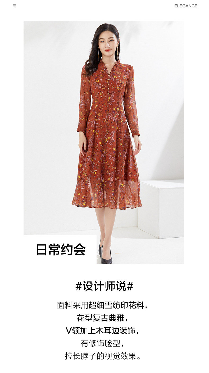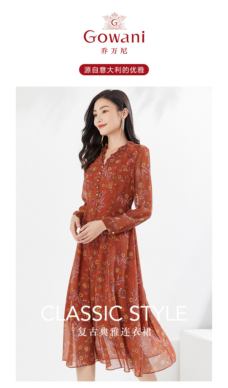乔万尼春新款长袖雪纺连衣裙印花V领设计收腰显瘦EI3E239