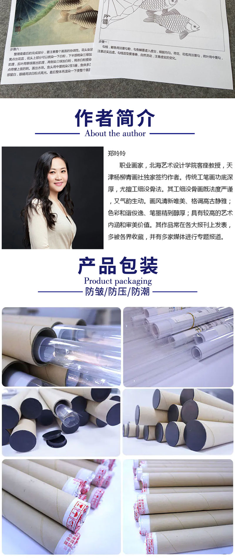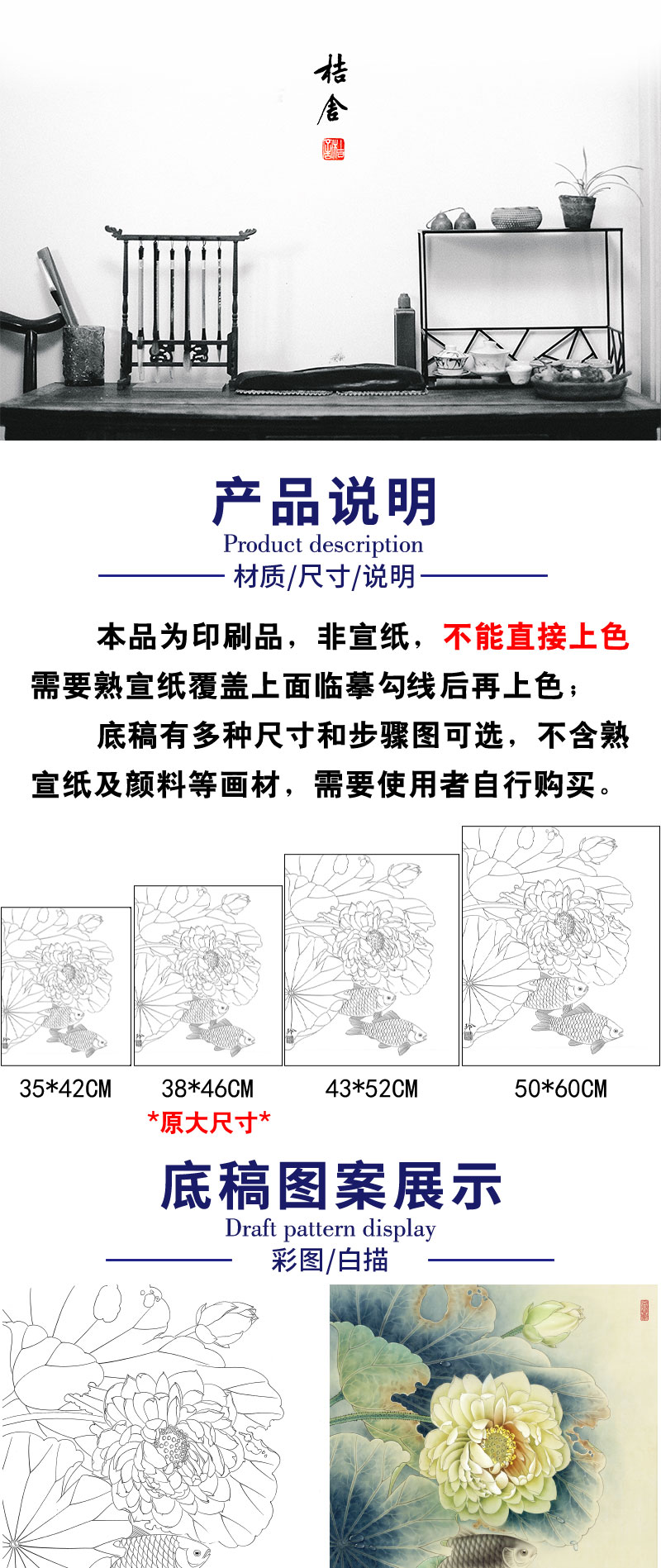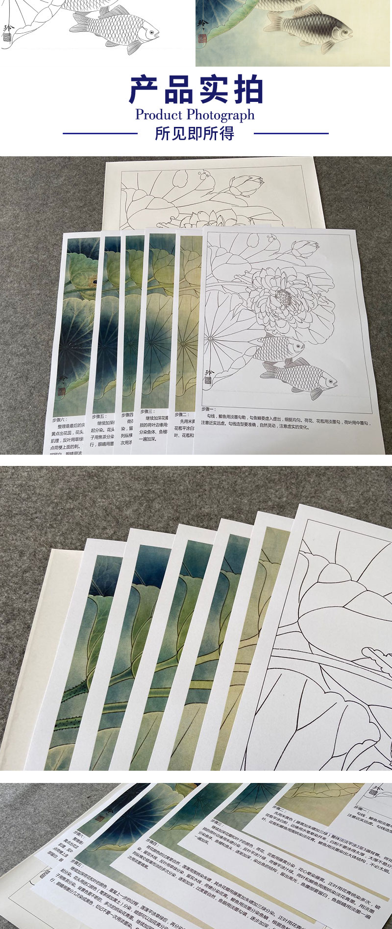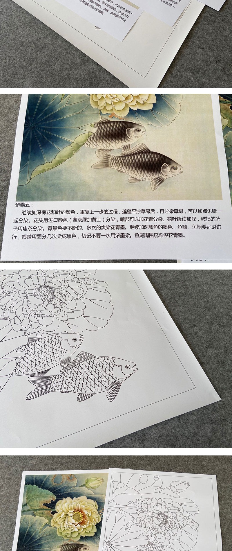 【有步骤、大彩图】郑玲玲工笔画白描底稿《荷花叶下鲫鱼醉》荷花鲫鱼初学者临摹花鸟线稿ZL44