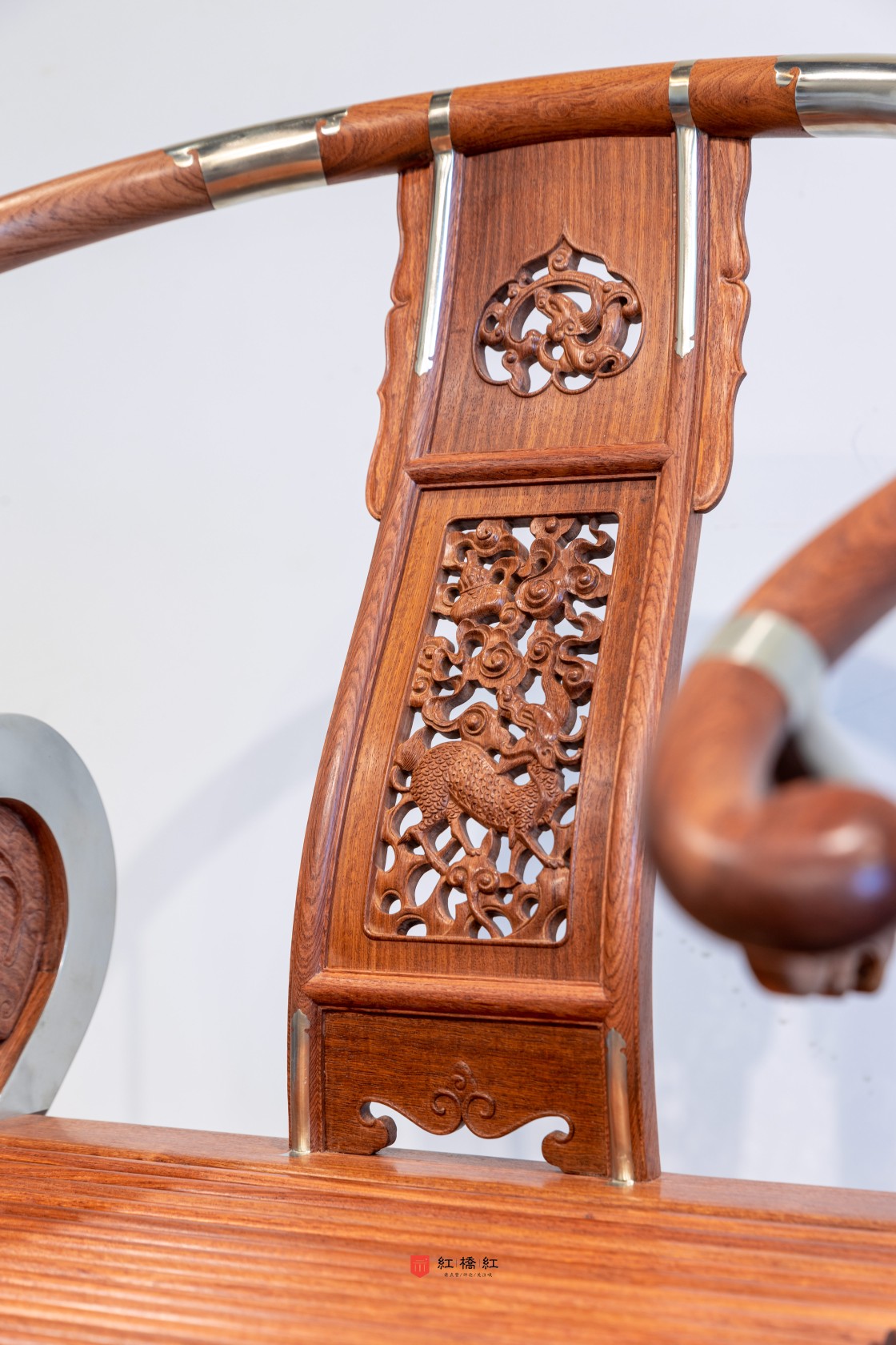 交椅三截攒框镶板靠背,上部如意开光透雕螭龙纹,中部透雕麒麟、葫芦、山石、灵芝,下部亮脚起卷草纹阳线,嵌铜使其坚固,至精者,加微改良,施平嵌,工艺更为复杂,整体更为平顺。