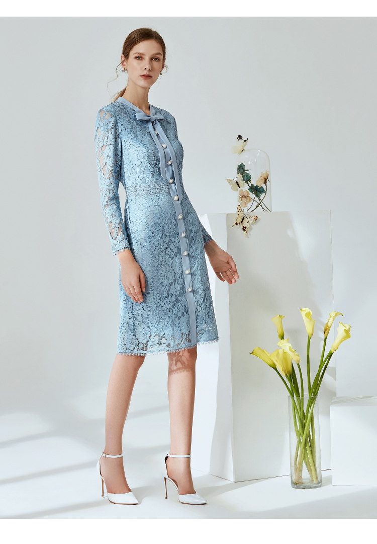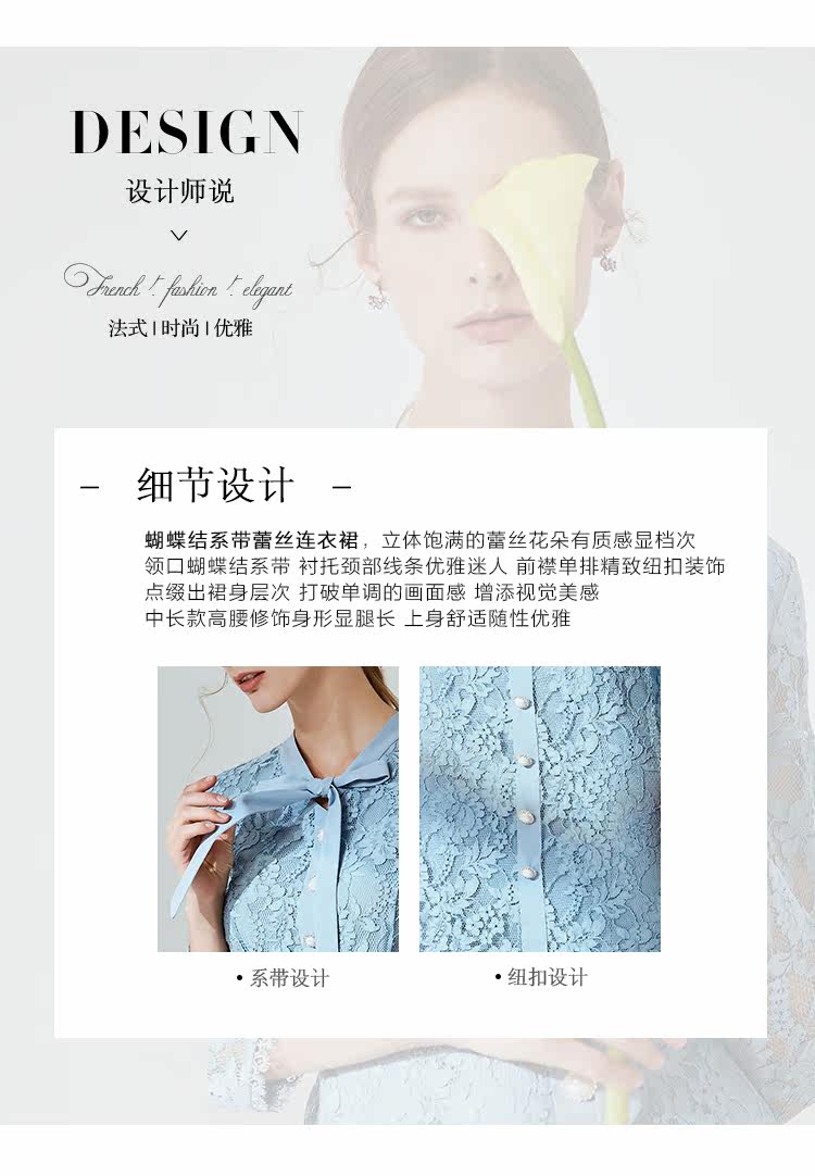 EITIE爱特爱春季新款通勤时尚蕾丝钩花系带修身连衣裙女中裙A2007413