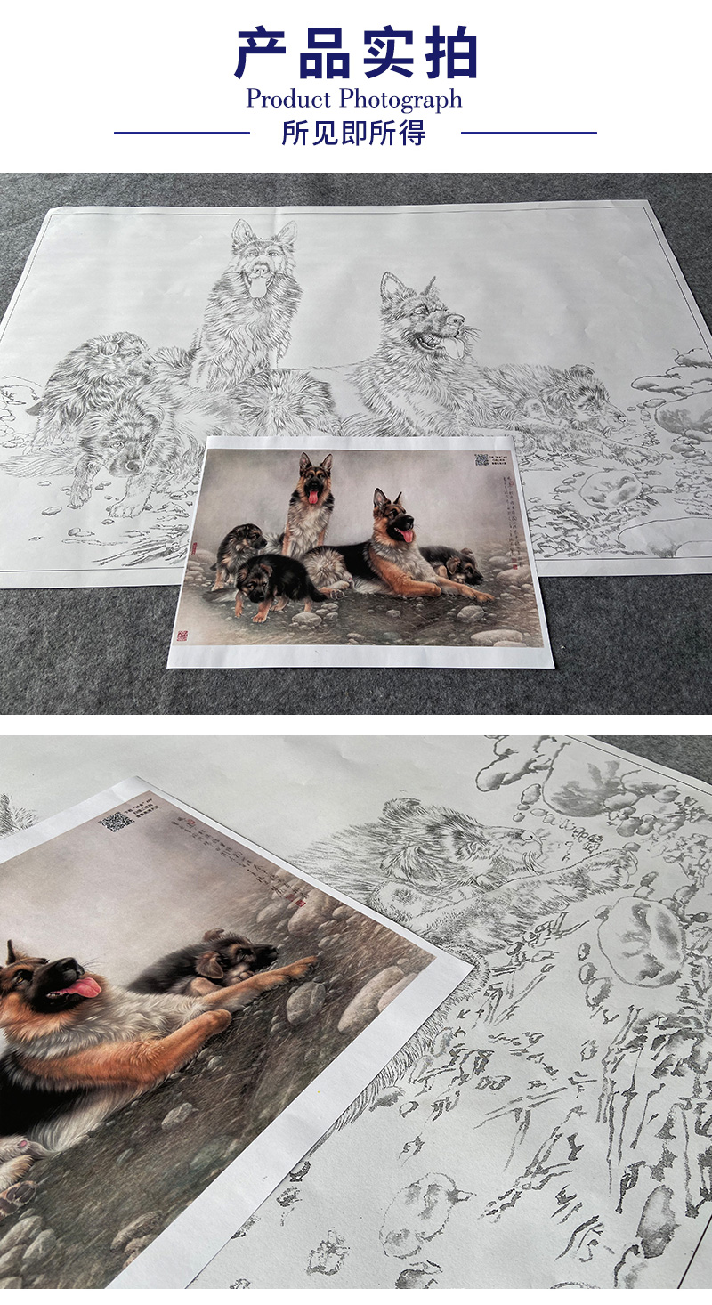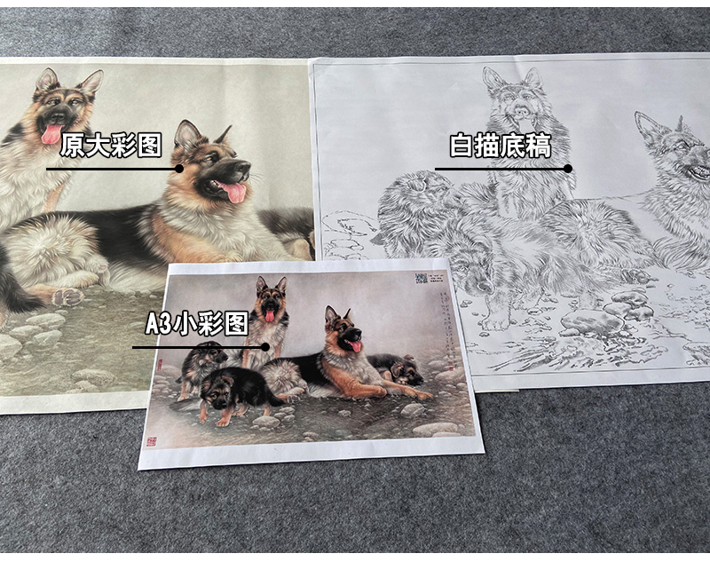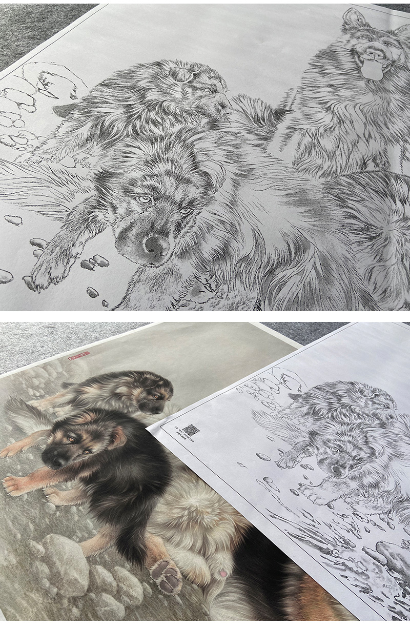 【大彩图】刘继彪横幅工笔画白描底稿《四犬》临摹勾线动物线稿GG04