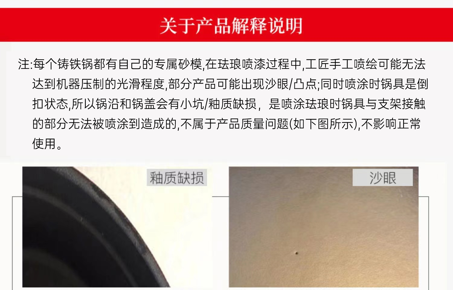 ‼️由于铸铁珐琅锅是铸铁工艺和珐琅工艺制造,所以珐琅锅的锅身锅盖锅边缘如果有些不均匀,不平整,锅身有气孔是属于正常现象,并非瑕疵和质量问题。