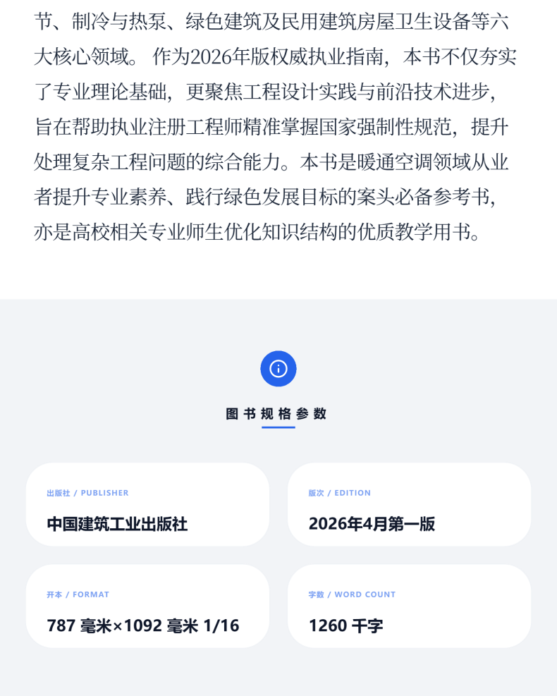 本书紧扣注册公用设备工程师(暖通空调)在执业过程中应该掌握的专业知识,重在解决执业过程中常遇到的问题,以更有利于读者对知识点的掌握。将最新颁布实施的与暖通空调相关的标准规范内容纳入了本书内容,以紧跟行业发展趋势。 本书由中机中联工程有限公司原院长艾为学、中国建筑设计研究院总工潘云钢任主编,参编单位包括中国建筑设计院、中国建筑东北设计院、机械工业第三设计院、西安建筑科技大学、中国五洲工程设计有限公司、东华大学、重庆大学等。参编作者均为行业内的知名专家教授。