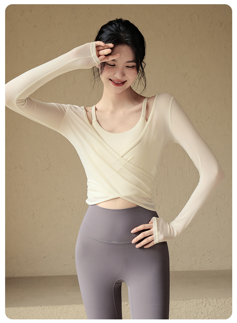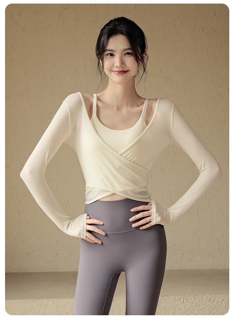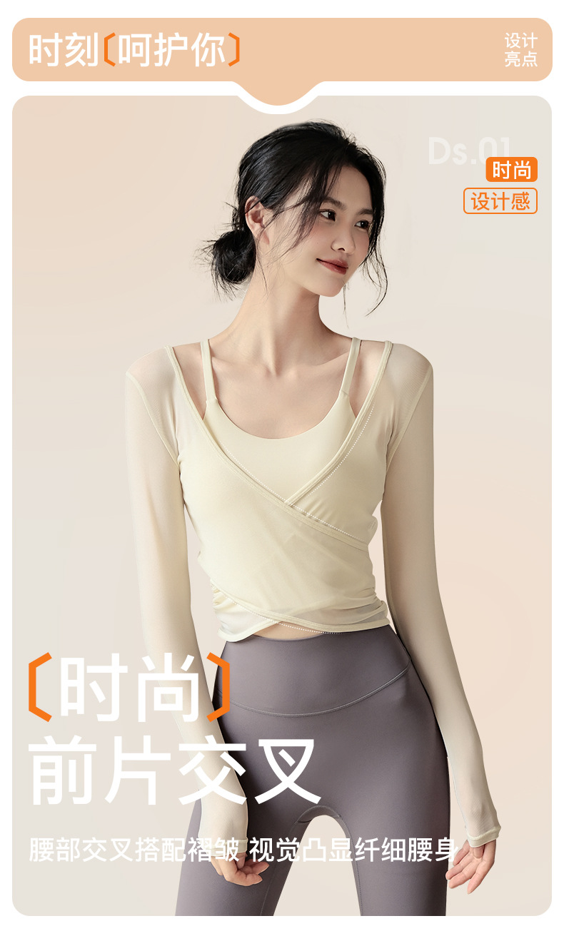 【高弹亲肤!透气网纱】网纱长袖上衣带胸垫美背心普拉提训练瑜伽服女健身房运动跑步T恤。xa